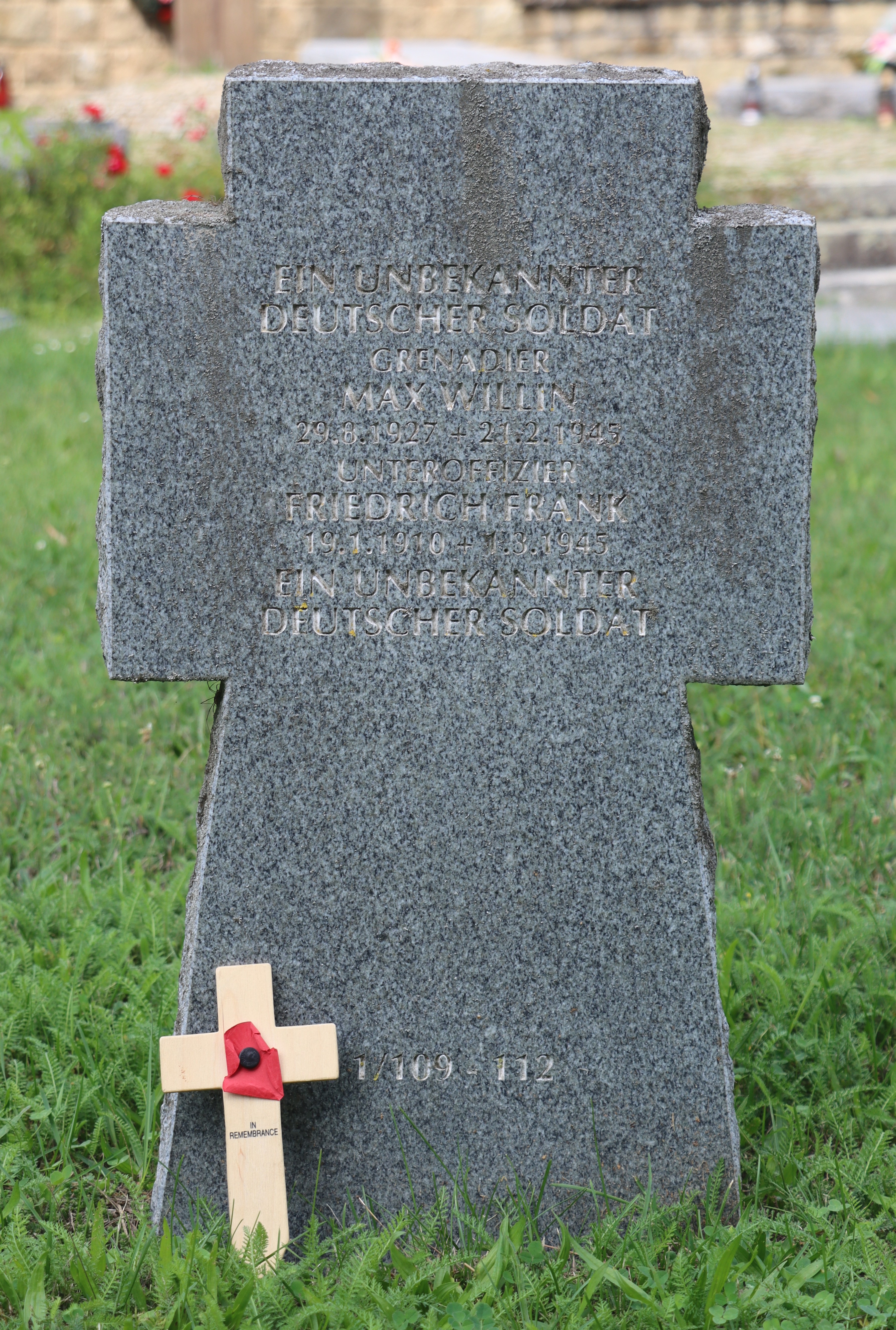 Gefreiter Hermann Friedrich WILLIN 15.07.1889 - 27.05.1918 29 Jahre alt aus Feuerbach Gefallen in Frankreich Kriegsgräberstätte in Sissonne (FR) Block 8, Grab 632 |