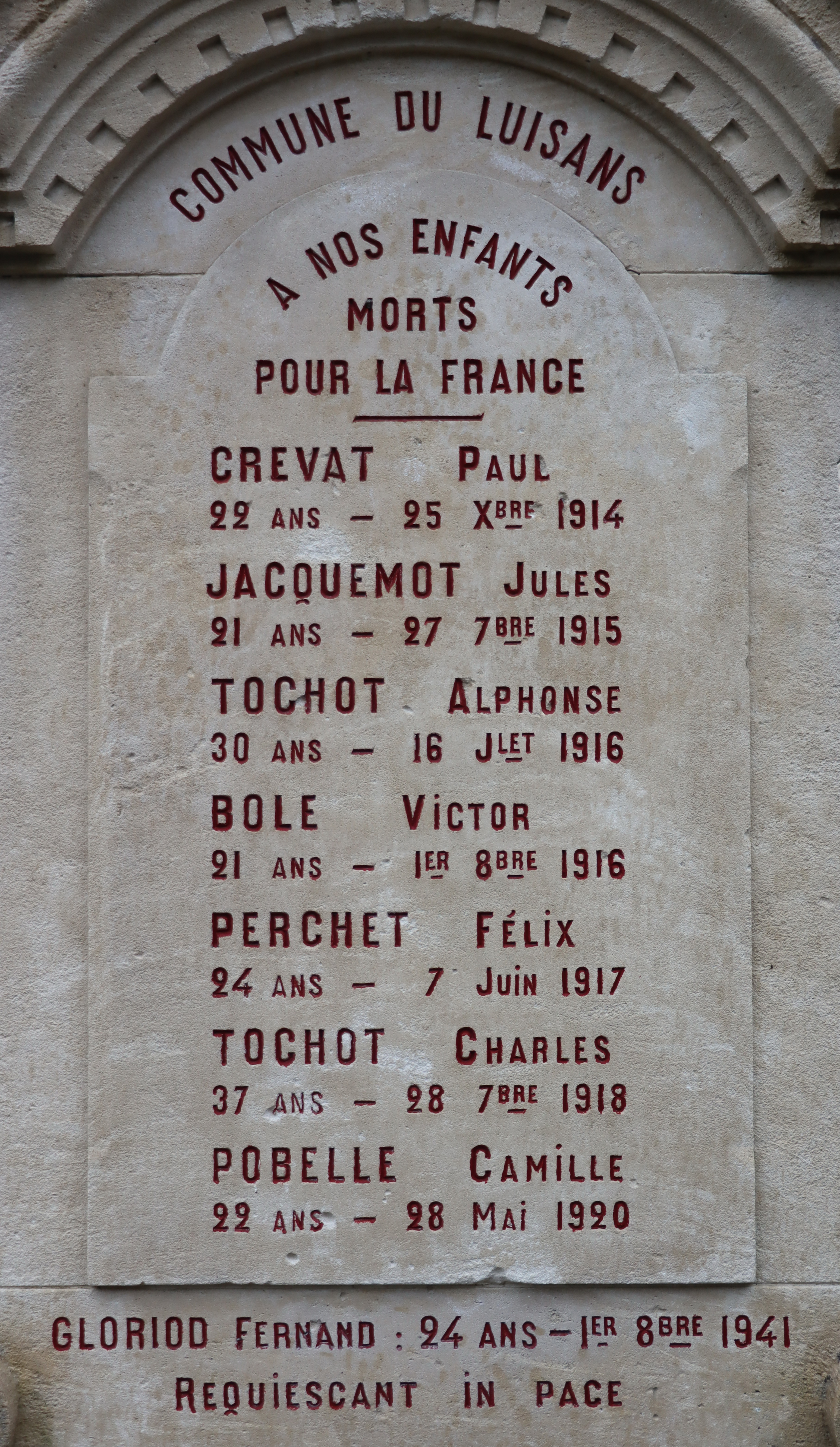 Auf dem Kriegerdenkmal des Ortsteils Luisans (F) sind die
