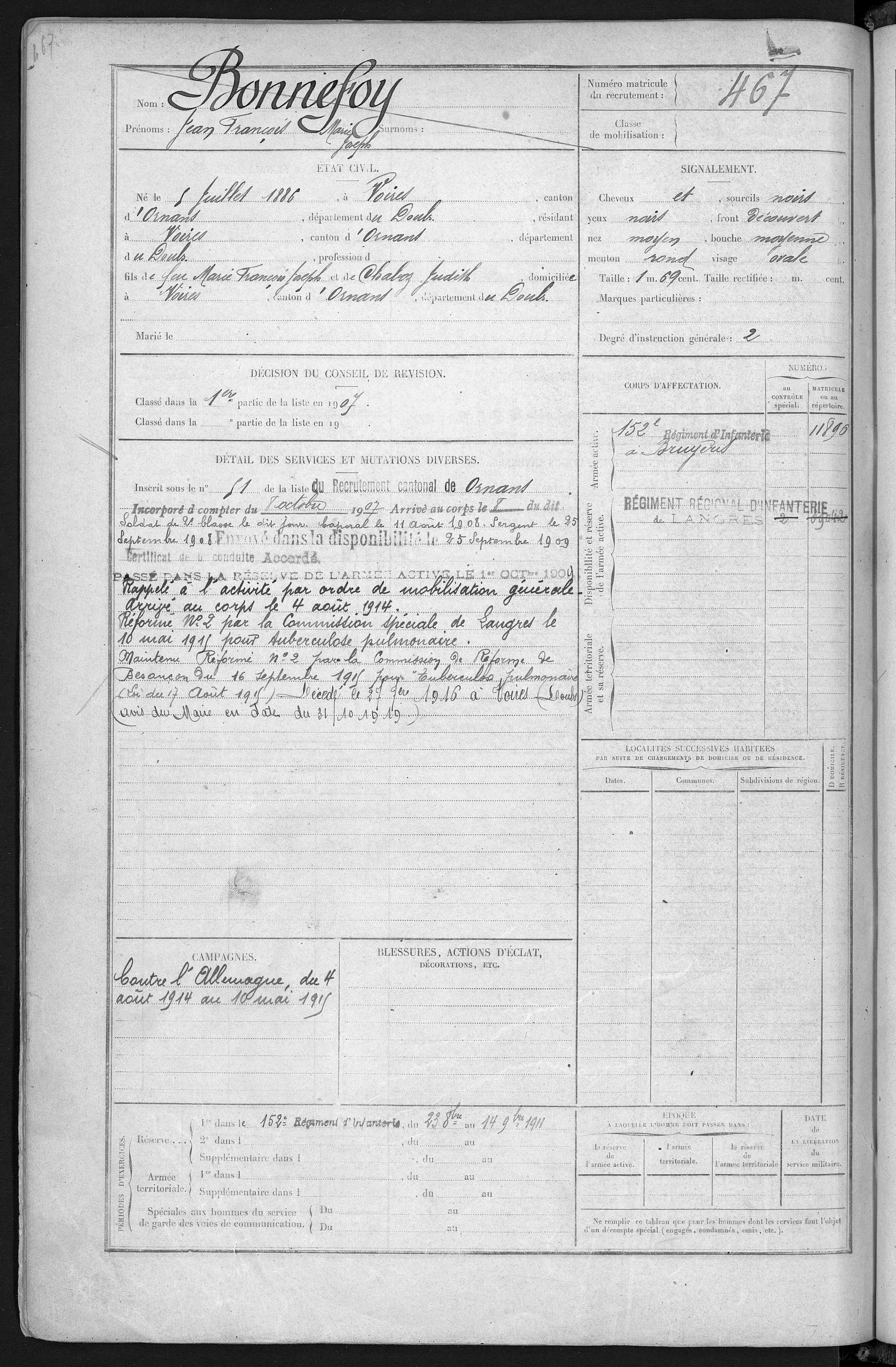 Soldat BONNEFOY Marie Rene Zephirin 31.07.1890 - 23.08.1914 349ème Régiment d'Infanterie Gefallen am Col Sainte.Marie-aux-Mines in den Vogesen (F) |
