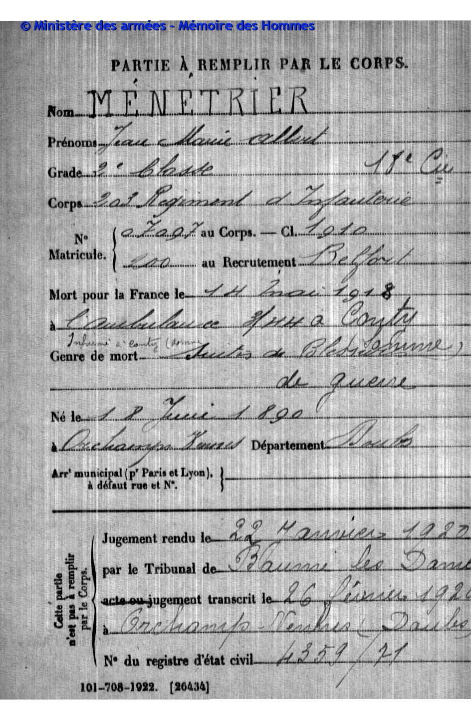 2ème classe MENETRIER Charles Marie Joseph 06.06.1885 - 05.10.1918 15ème Bataillon de chasseurs Gefallen in Hanmeau de Thorigny (F) |