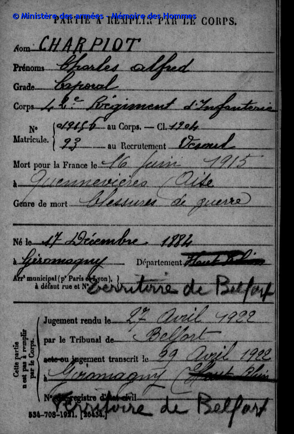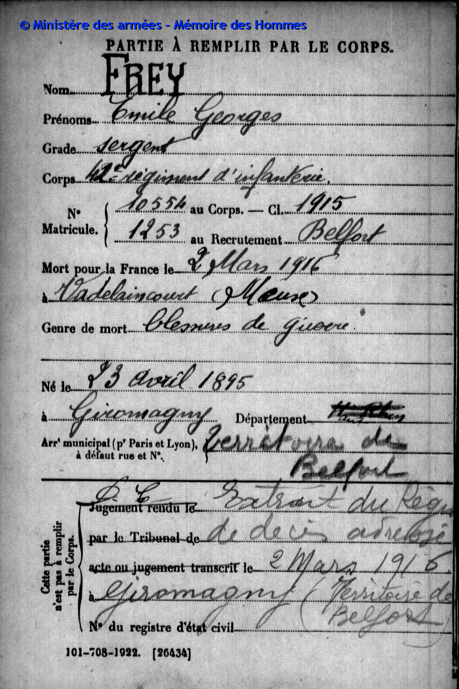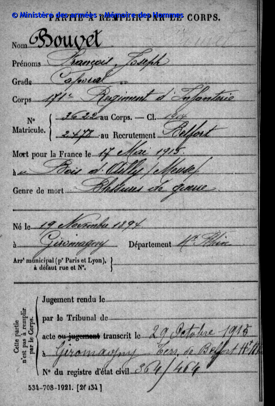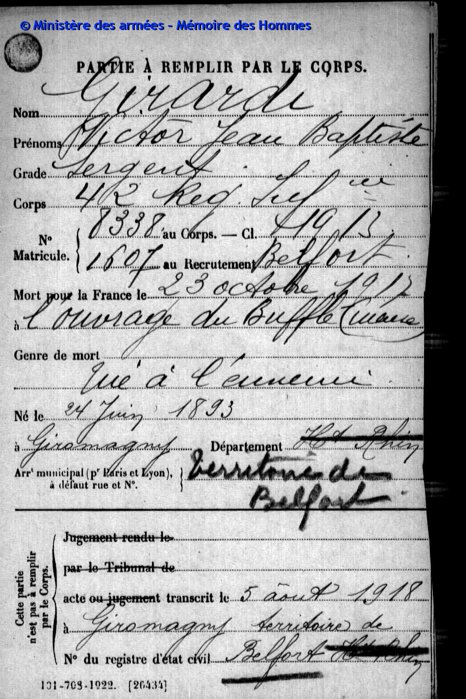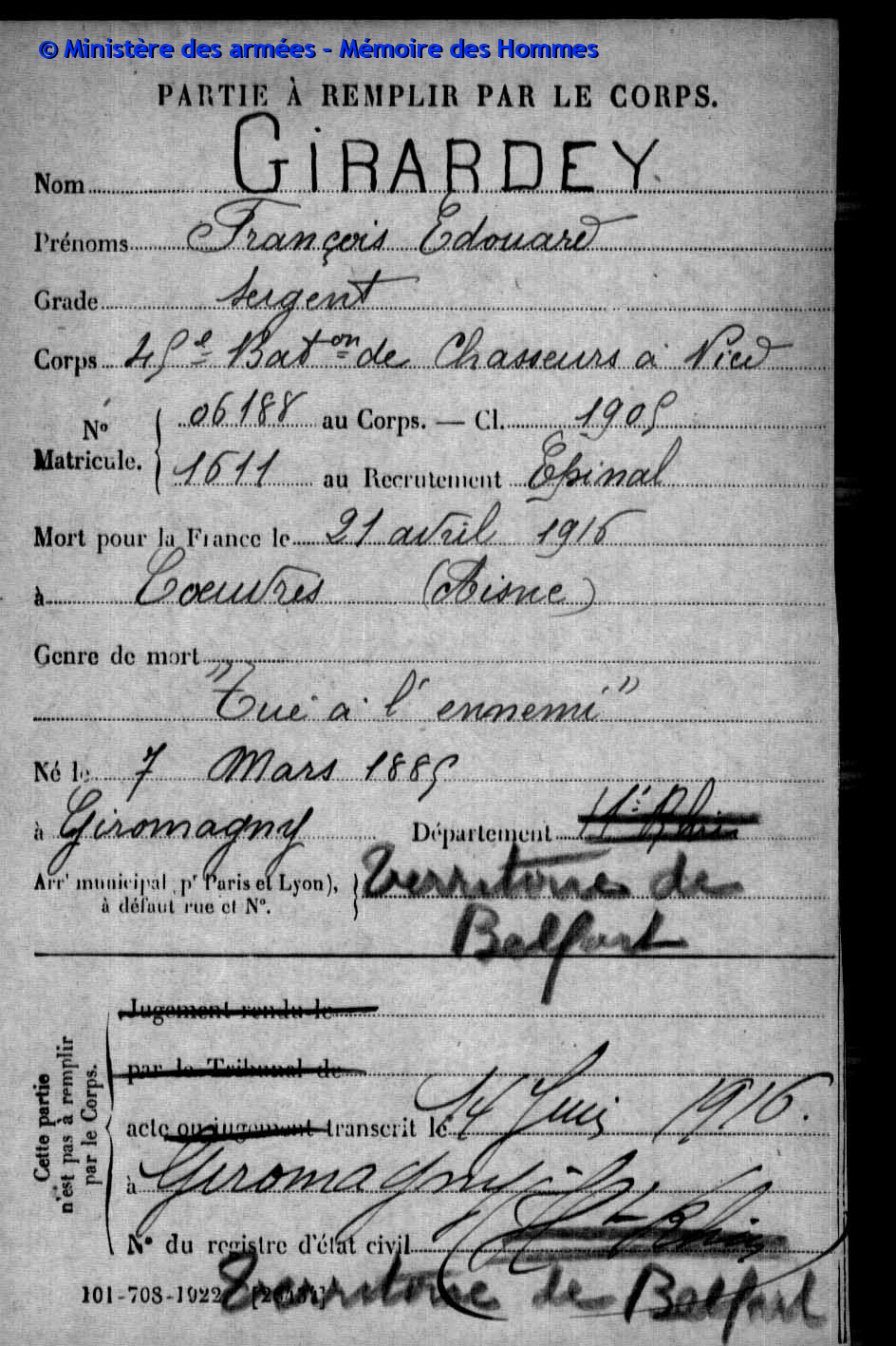Sergent GIRARDEY François Edouard 07.03.1885 - 21.04.1916 45ème Bataillon de Chasseurs à Pied Gefallen in Coeuvres - Aisne (F) |