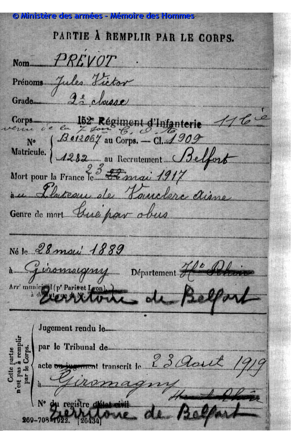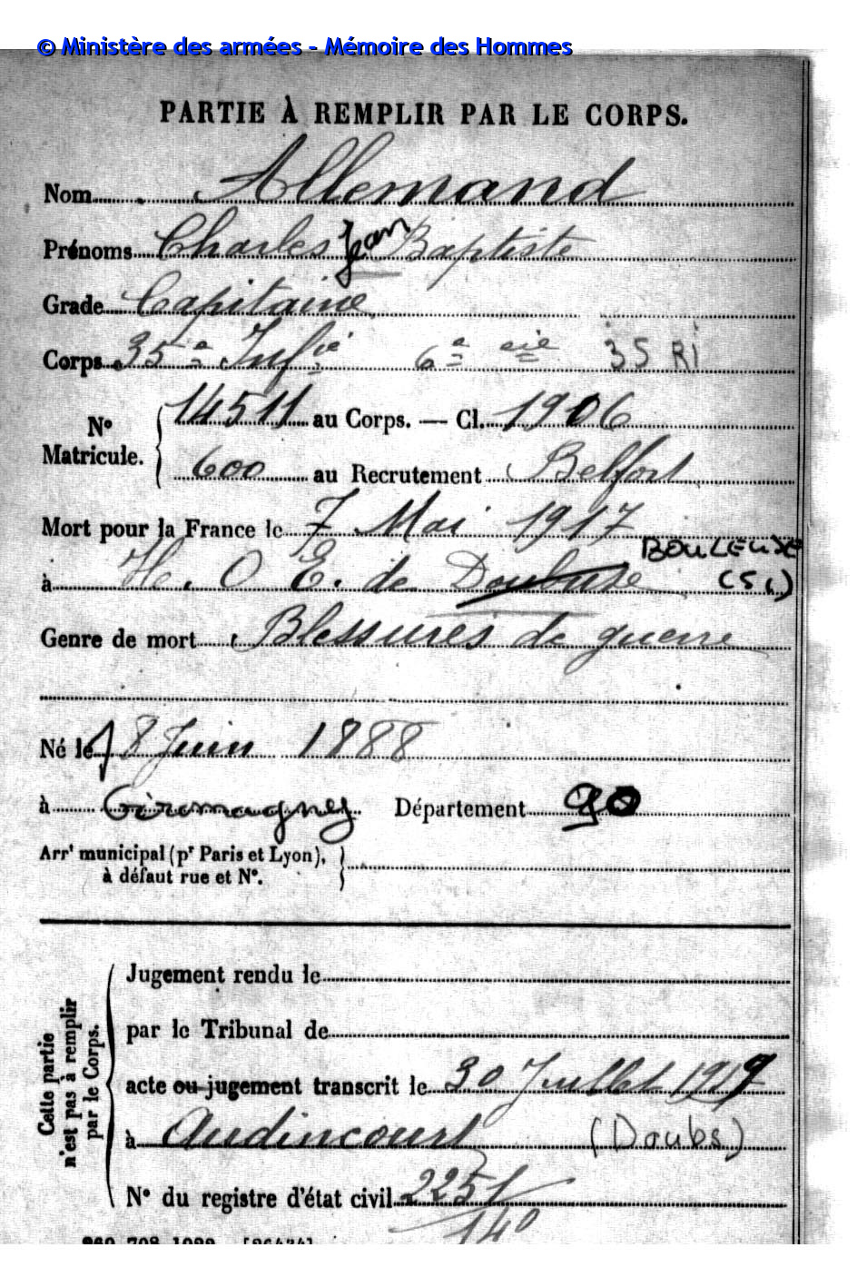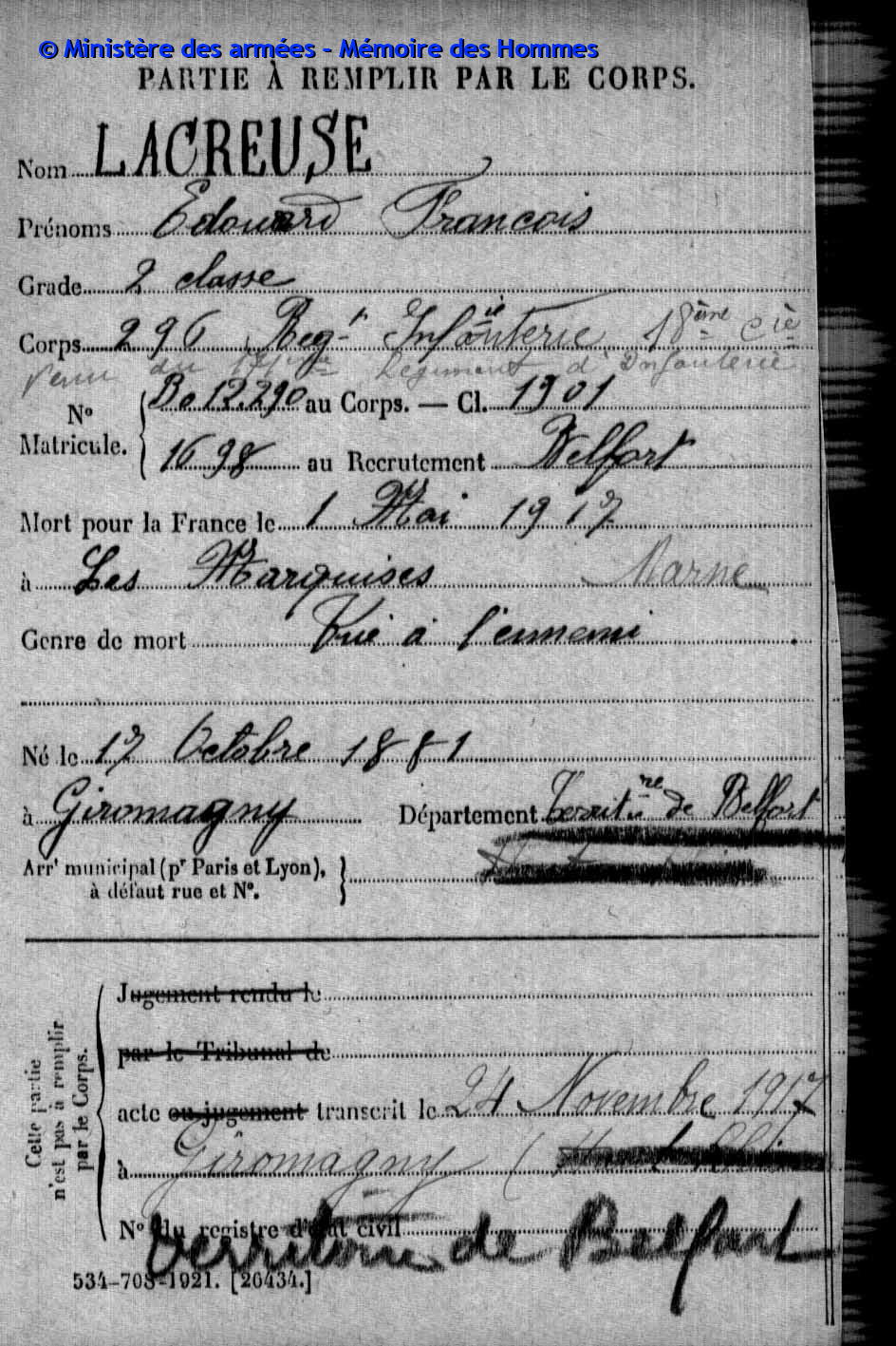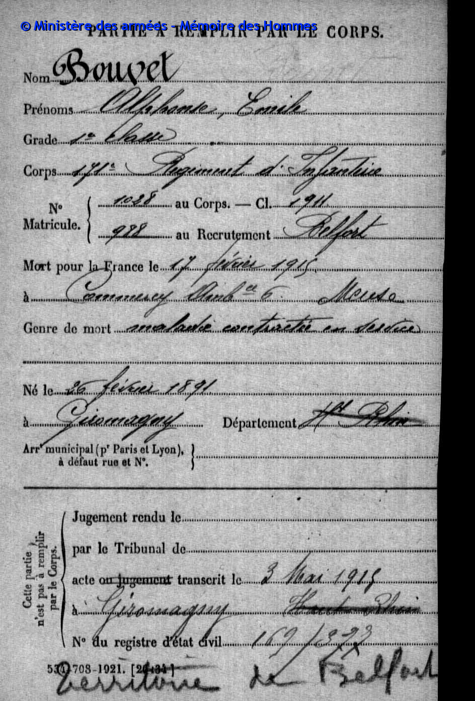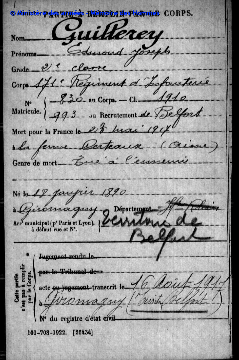 Sergent GIRARDEY François Edouard 07.03.1885 - 21.04.1916 45ème Bataillon de Chasseurs à Pied Gefallen in Coeuvres - Aisne (F) |