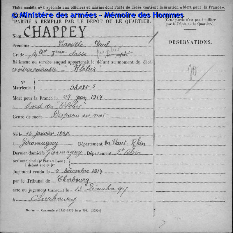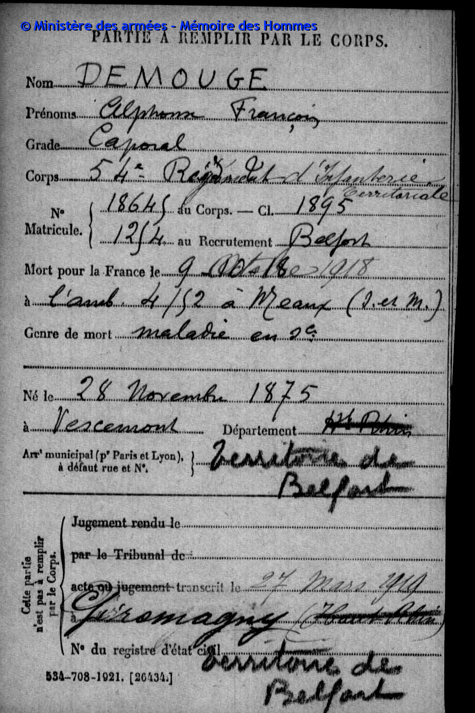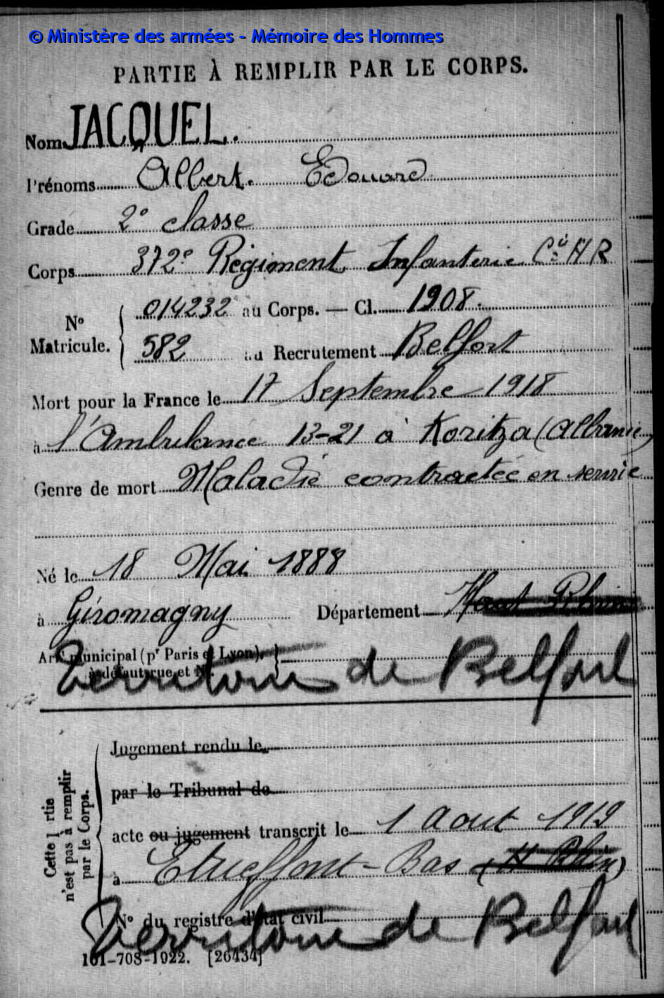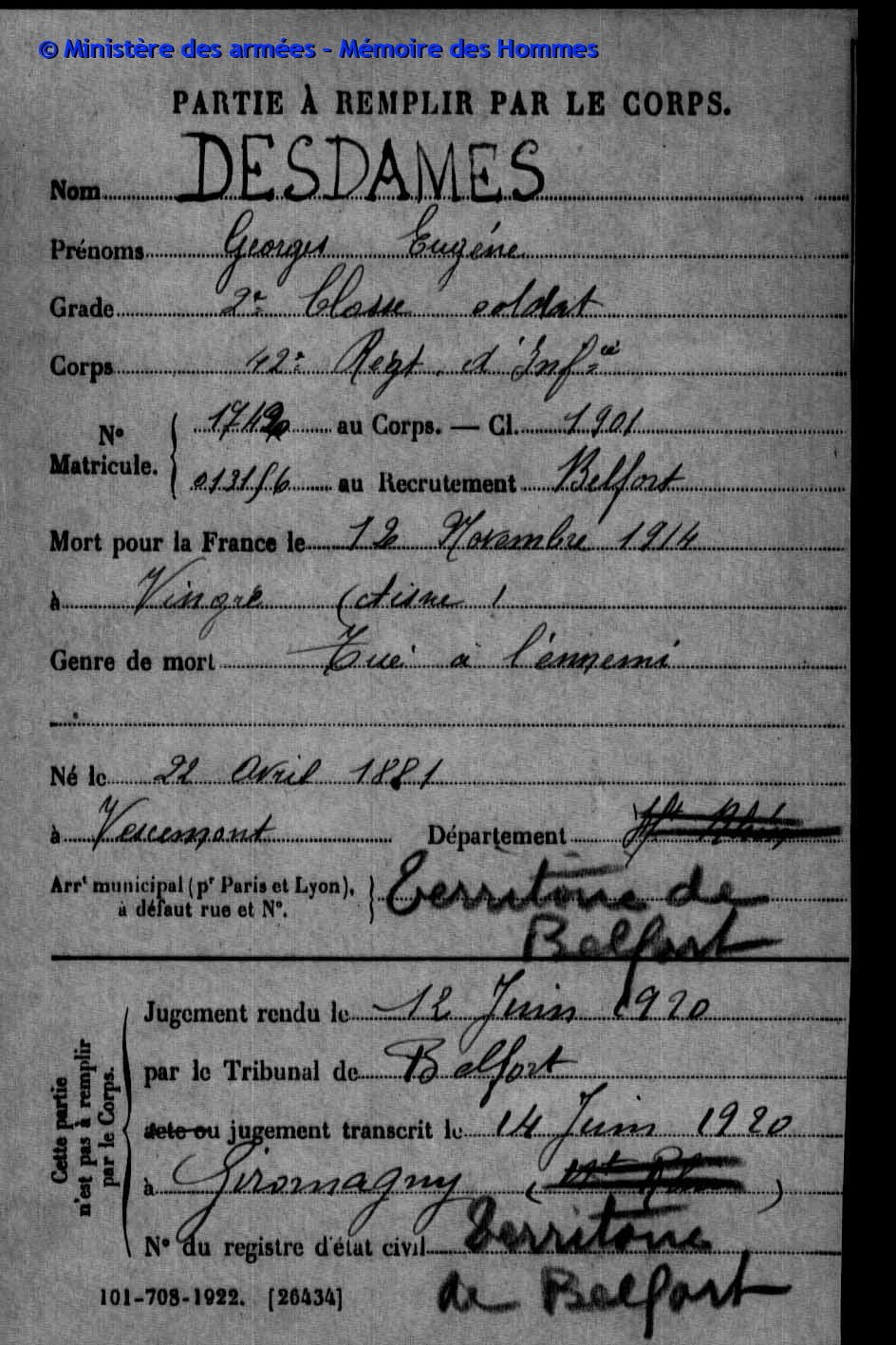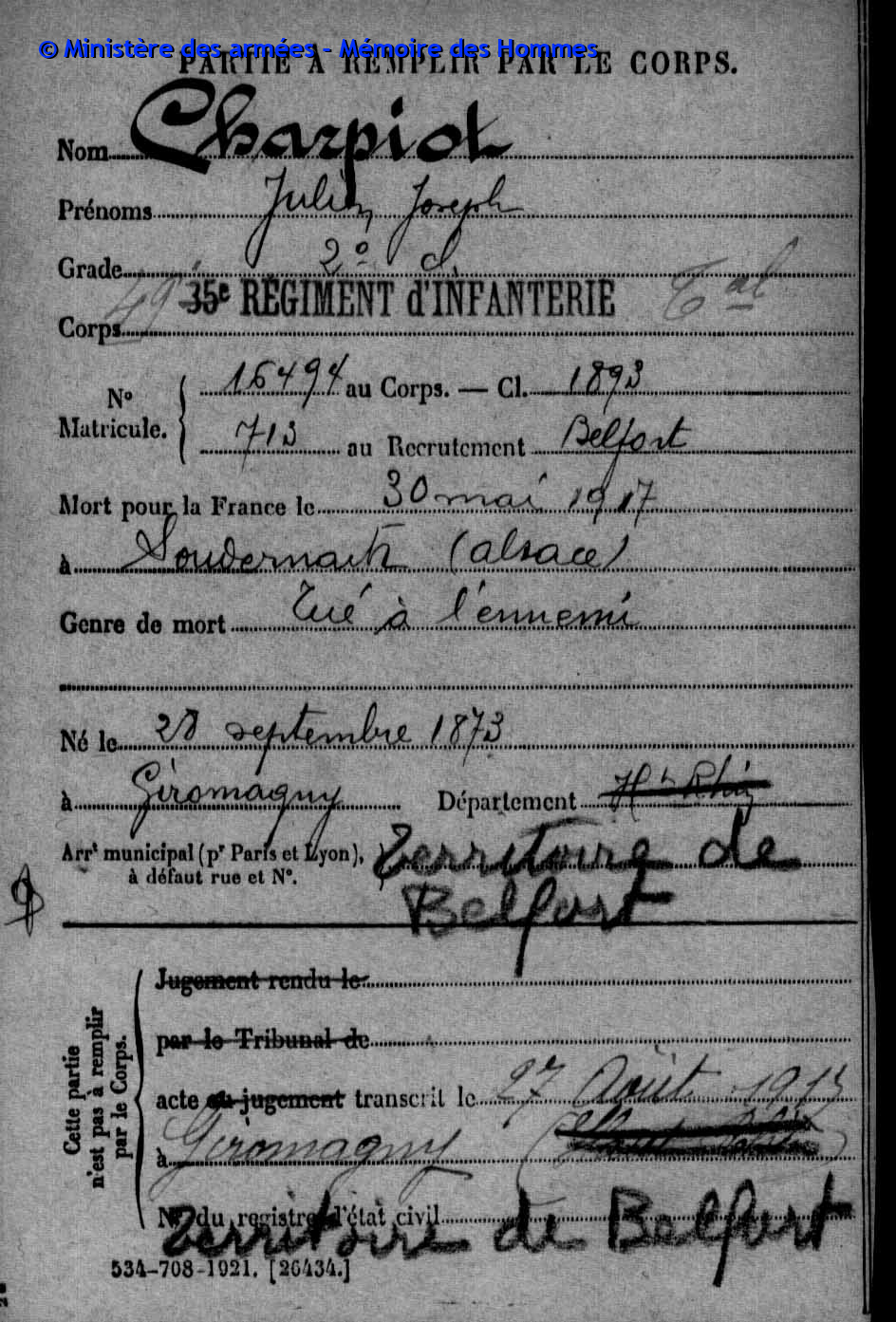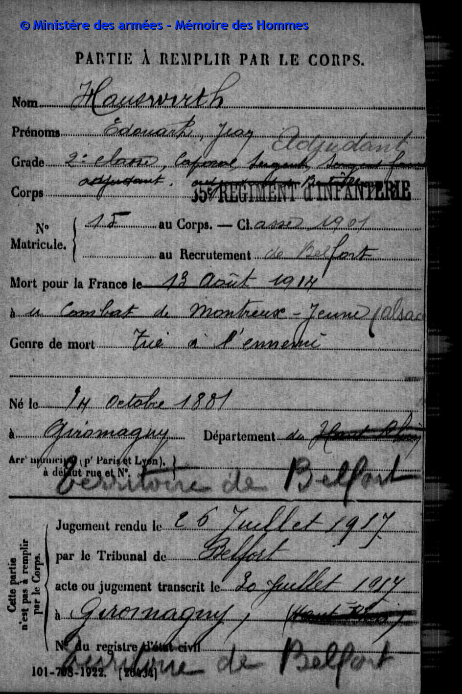 Sergent GIRARDEY François Edouard 07.03.1885 - 21.04.1916 45ème Bataillon de Chasseurs à Pied Gefallen in Coeuvres - Aisne (F) |