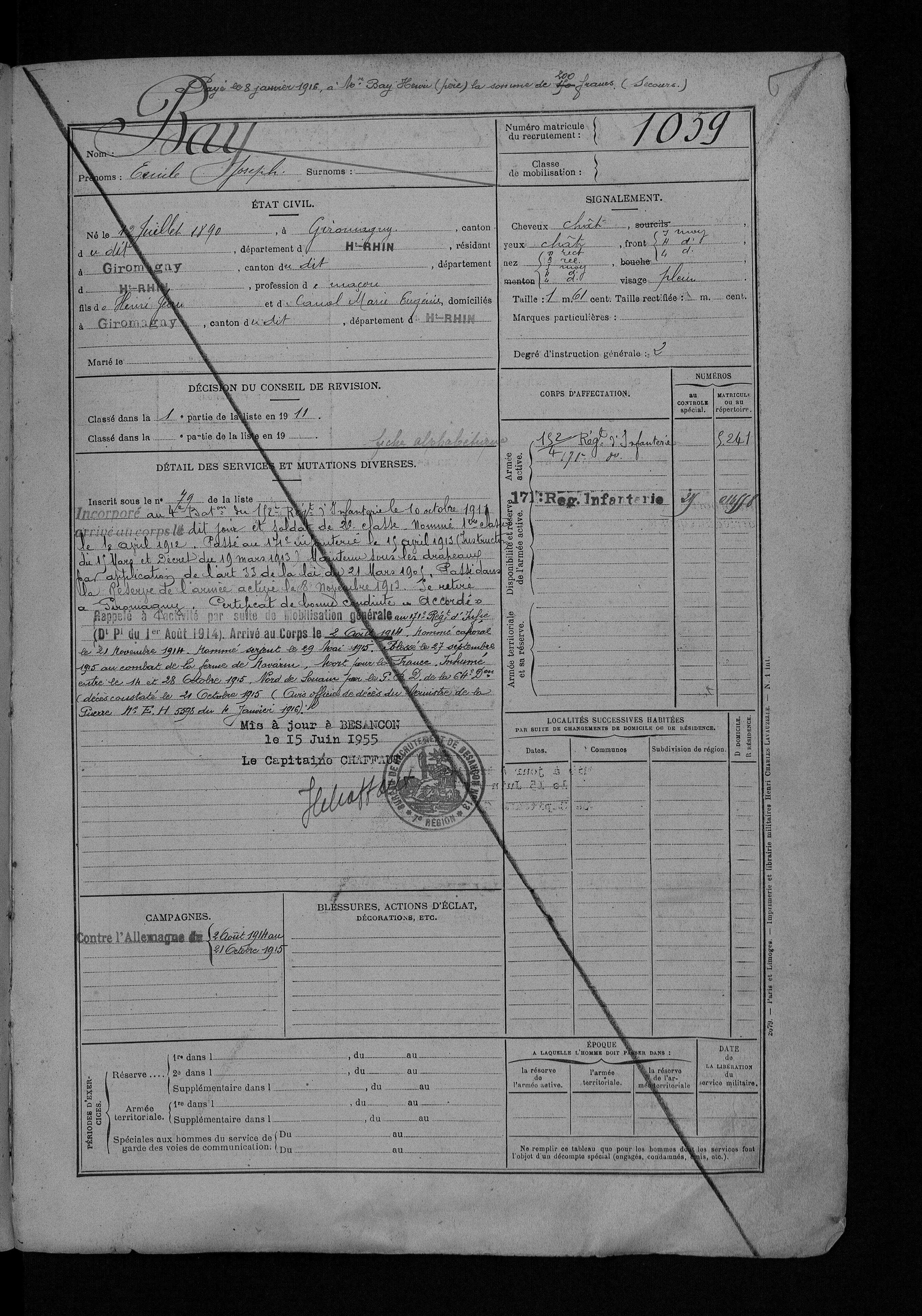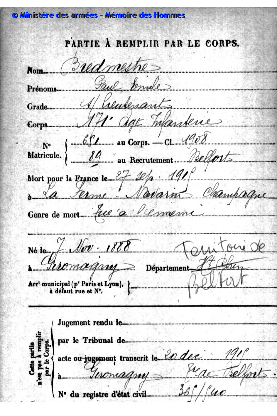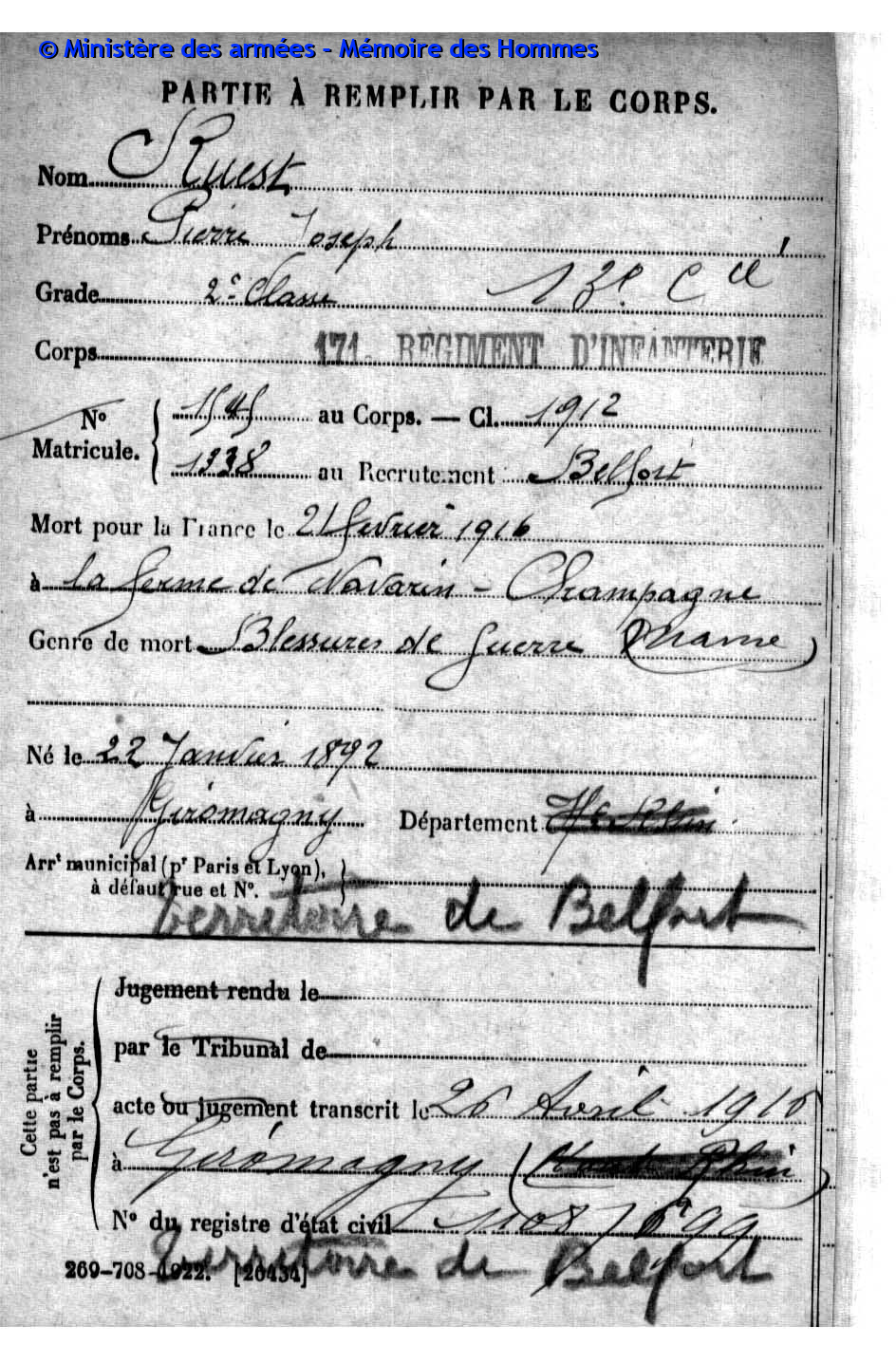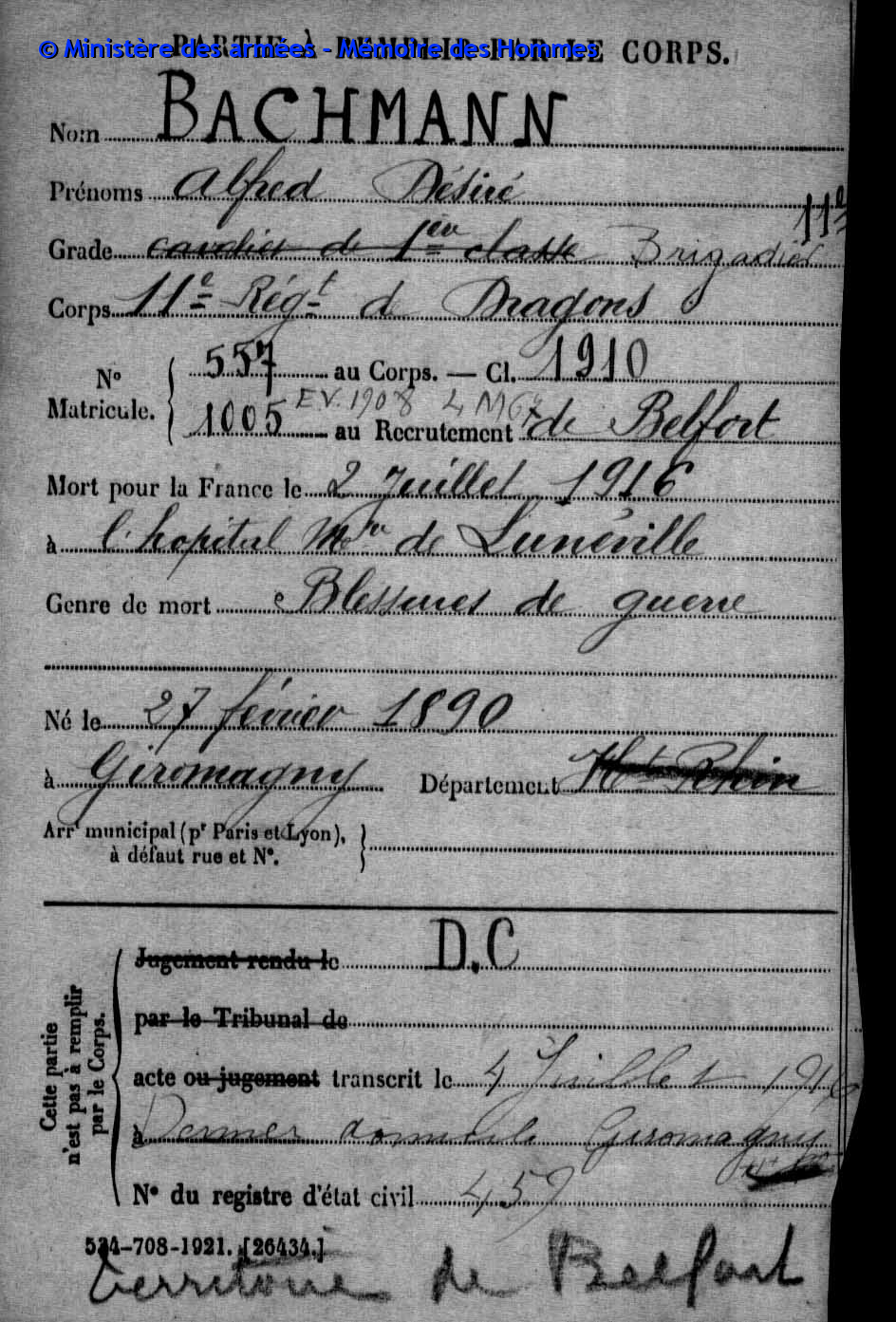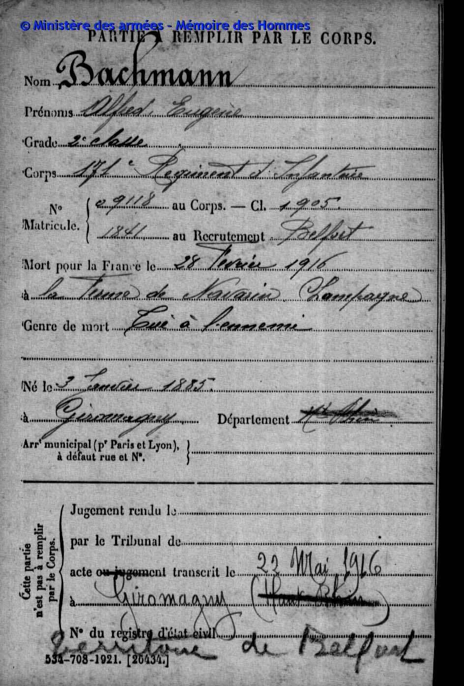 2ème classe BACHMANN Alfred Eugène 03.01.1885 - 28.02.1916 171ème Régiment d'Infanterie Gefallen in Perthes-les-Hurlus - Marne (F) |