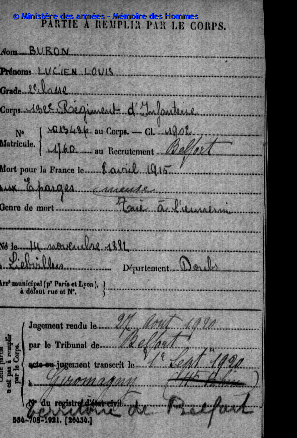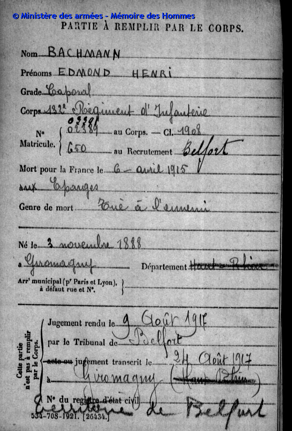 Caporal BACHMANN Edmond Henri 03.11.1888 - 06.04.1915 132ème Régiment d'Infanterie Gefallen in Les Eparges - Meuse (F) |