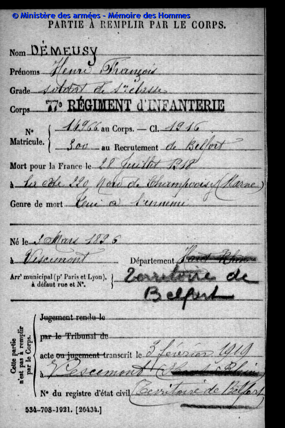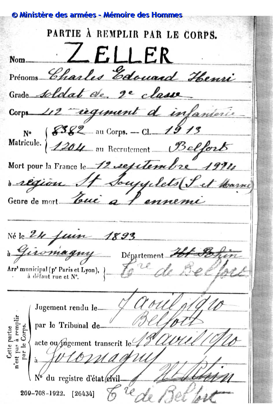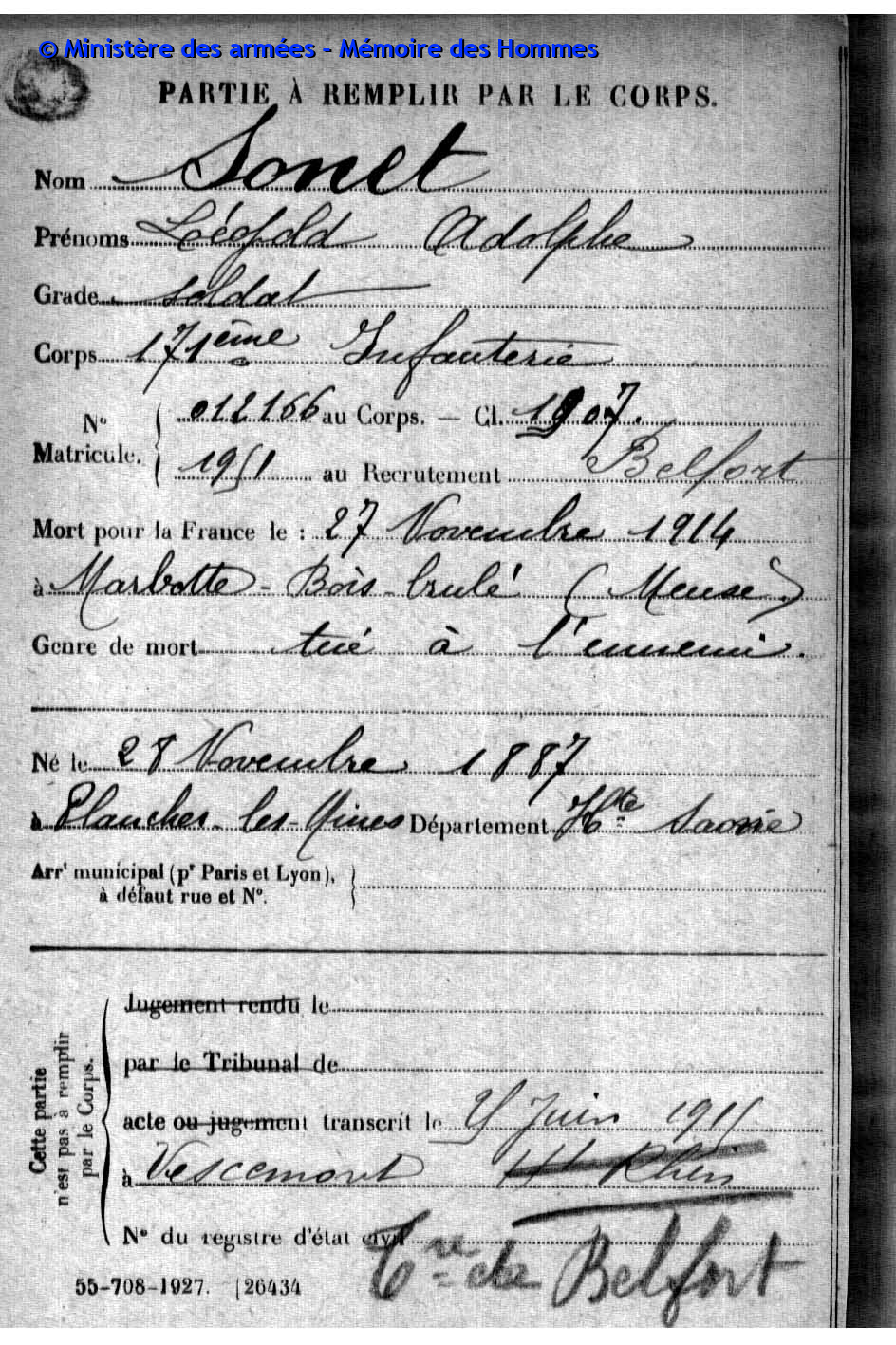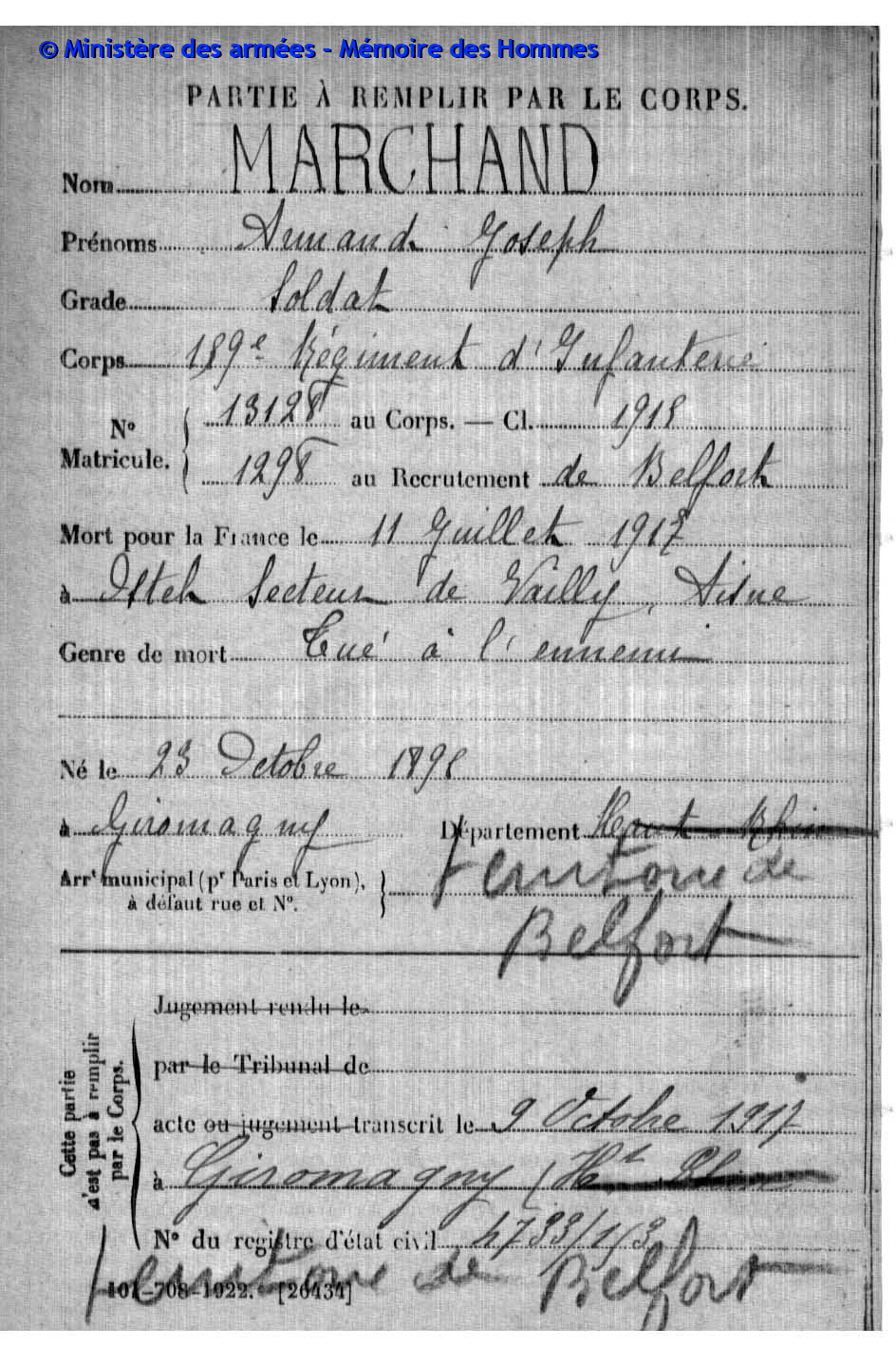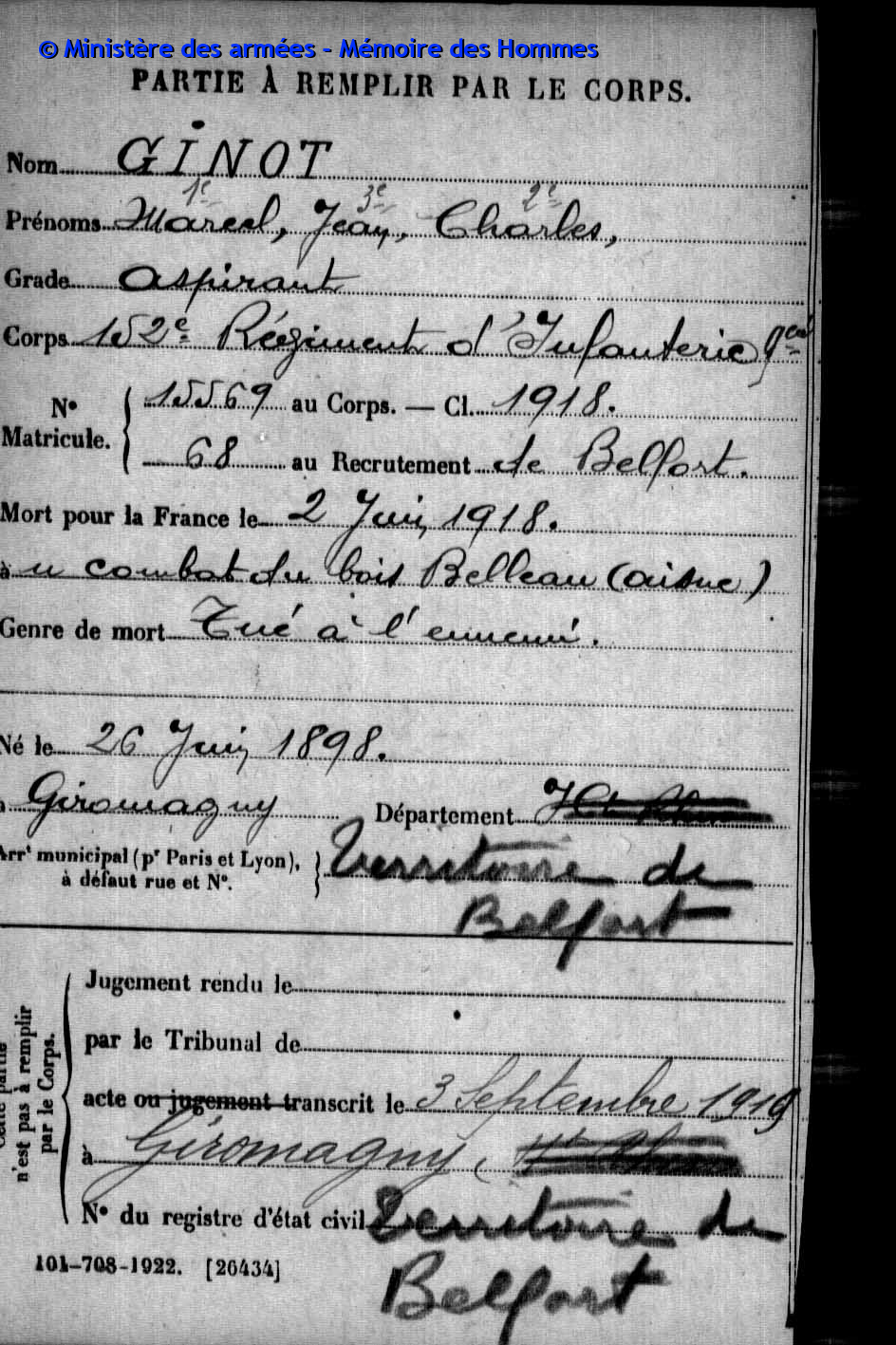 Aspirant GINOT Marcel Charles Jean 26.06.1898 - 02.06.1918 152ème Régiment d'Infanterie 9ème Compagnie (Rote Teufel aus Colmar / F) Gefallen in Belleau - Aisne (F) |