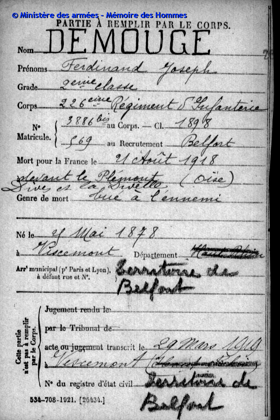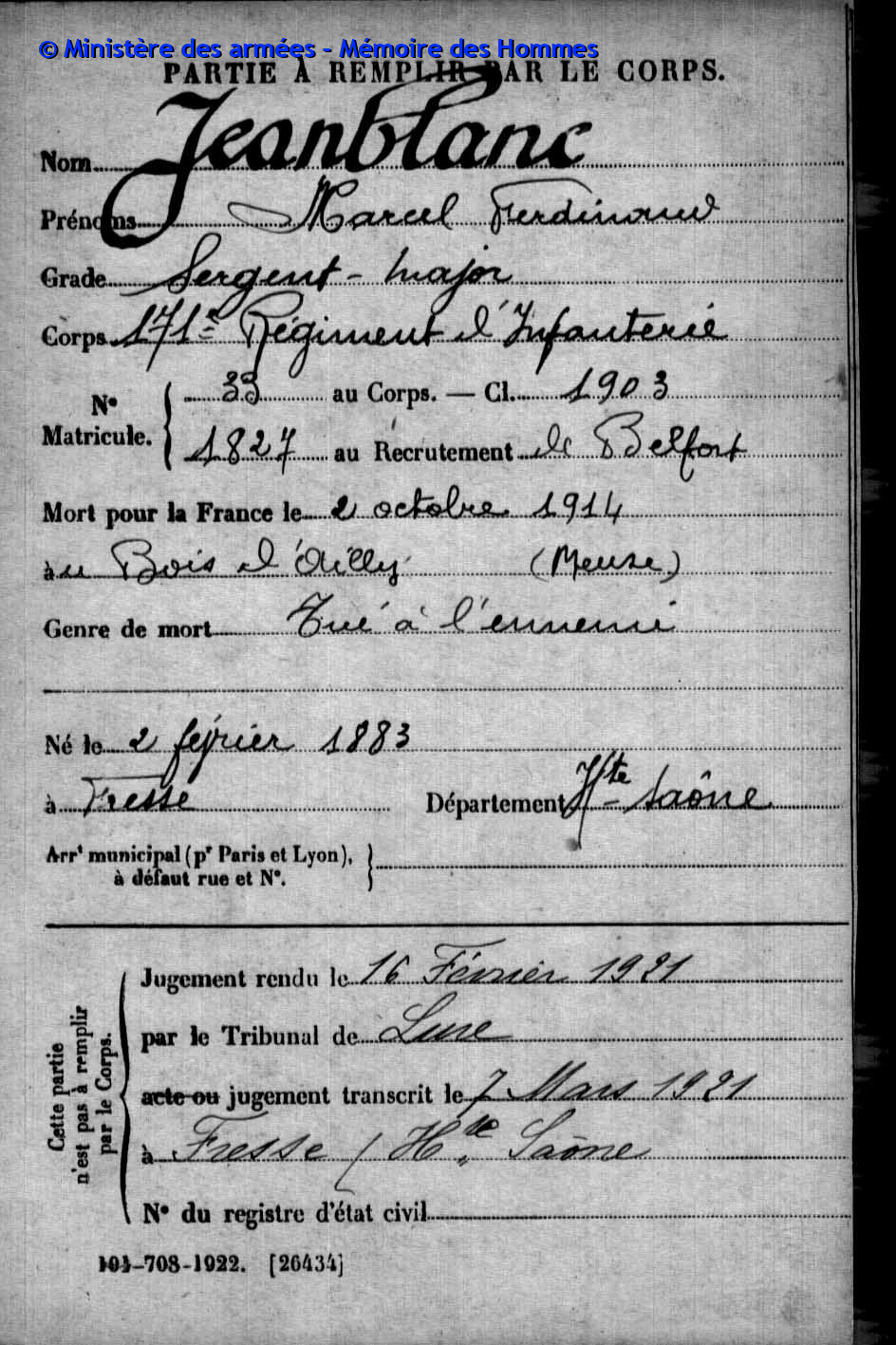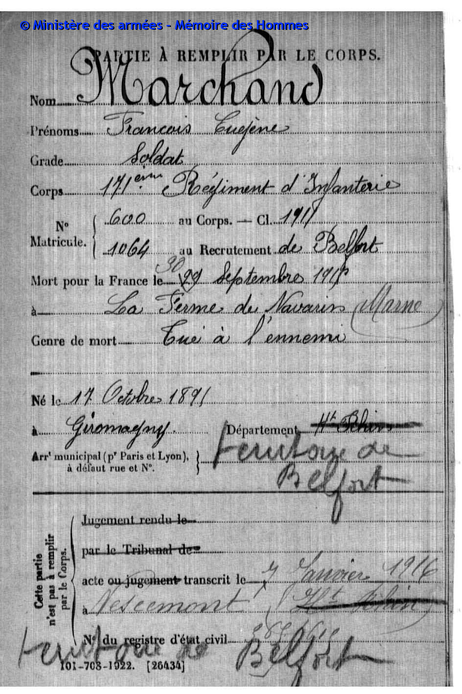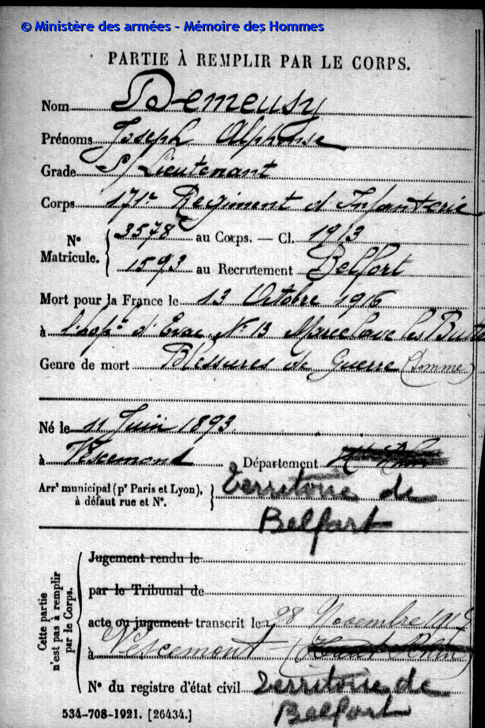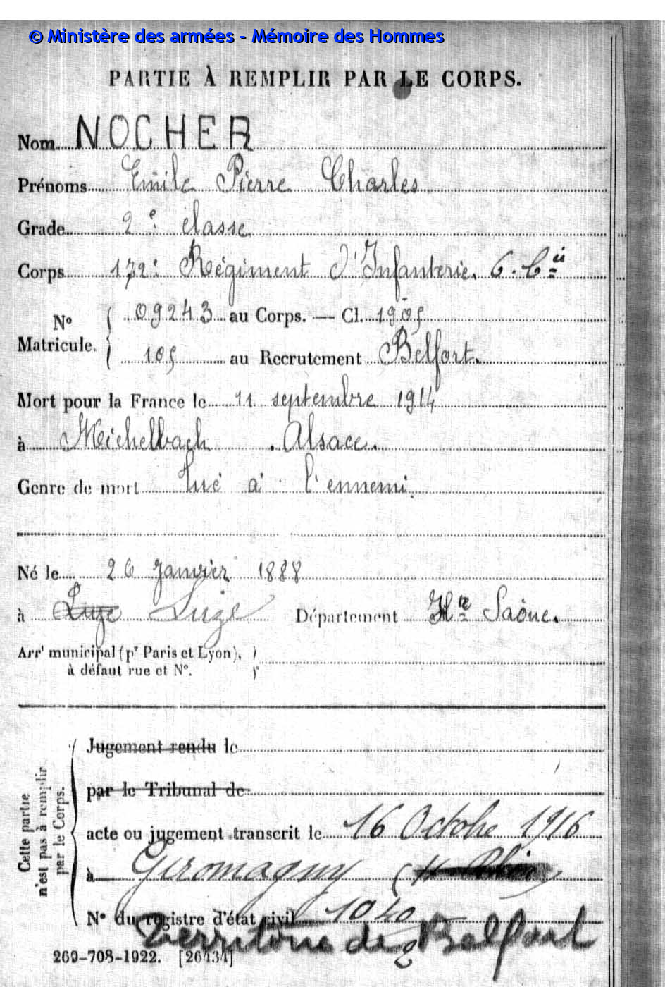 Aspirant GINOT Marcel Charles Jean 26.06.1898 - 02.06.1918 152ème Régiment d'Infanterie 9ème Compagnie (Rote Teufel aus Colmar / F) Gefallen in Belleau - Aisne (F) |