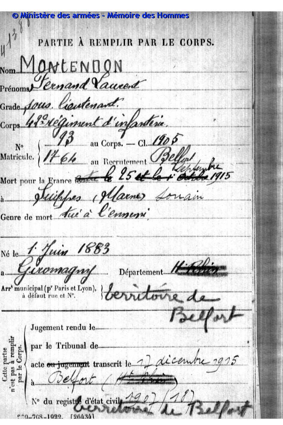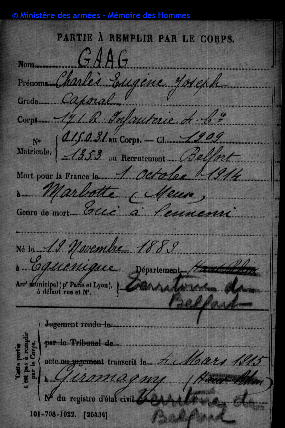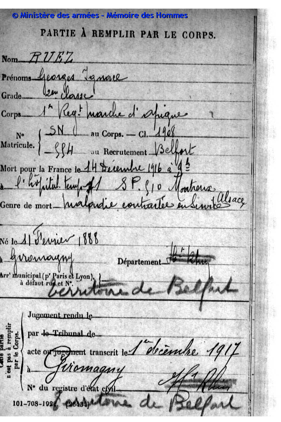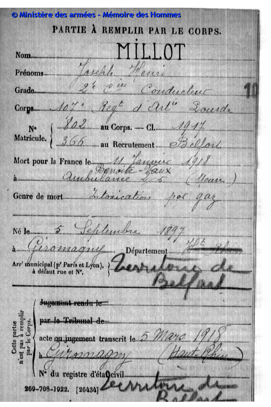 Aspirant GINOT Marcel Charles Jean 26.06.1898 - 02.06.1918 152ème Régiment d'Infanterie 9ème Compagnie (Rote Teufel aus Colmar / F) Gefallen in Belleau - Aisne (F) |