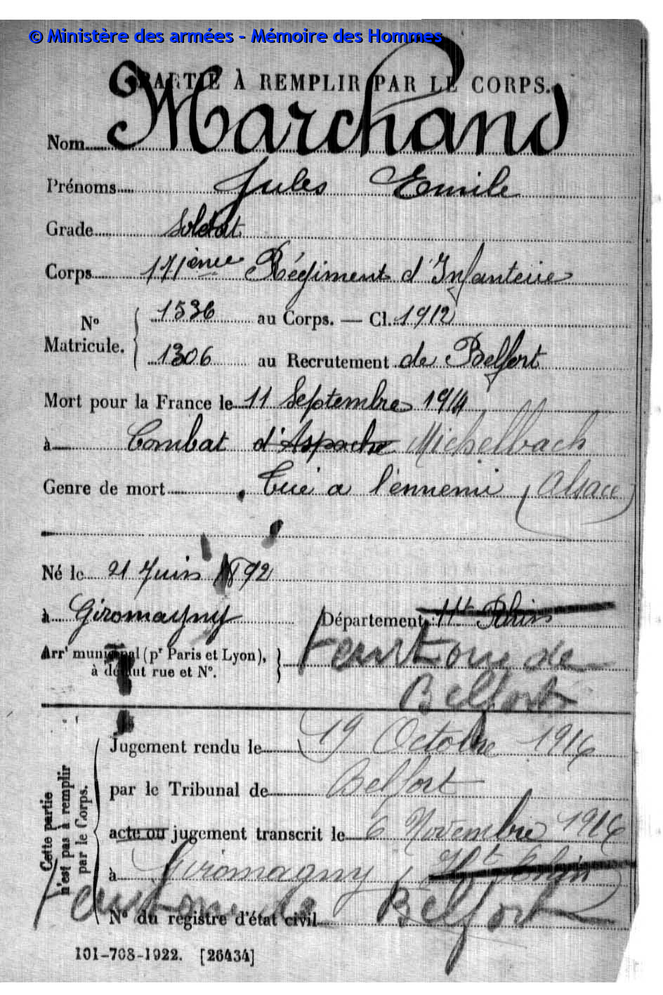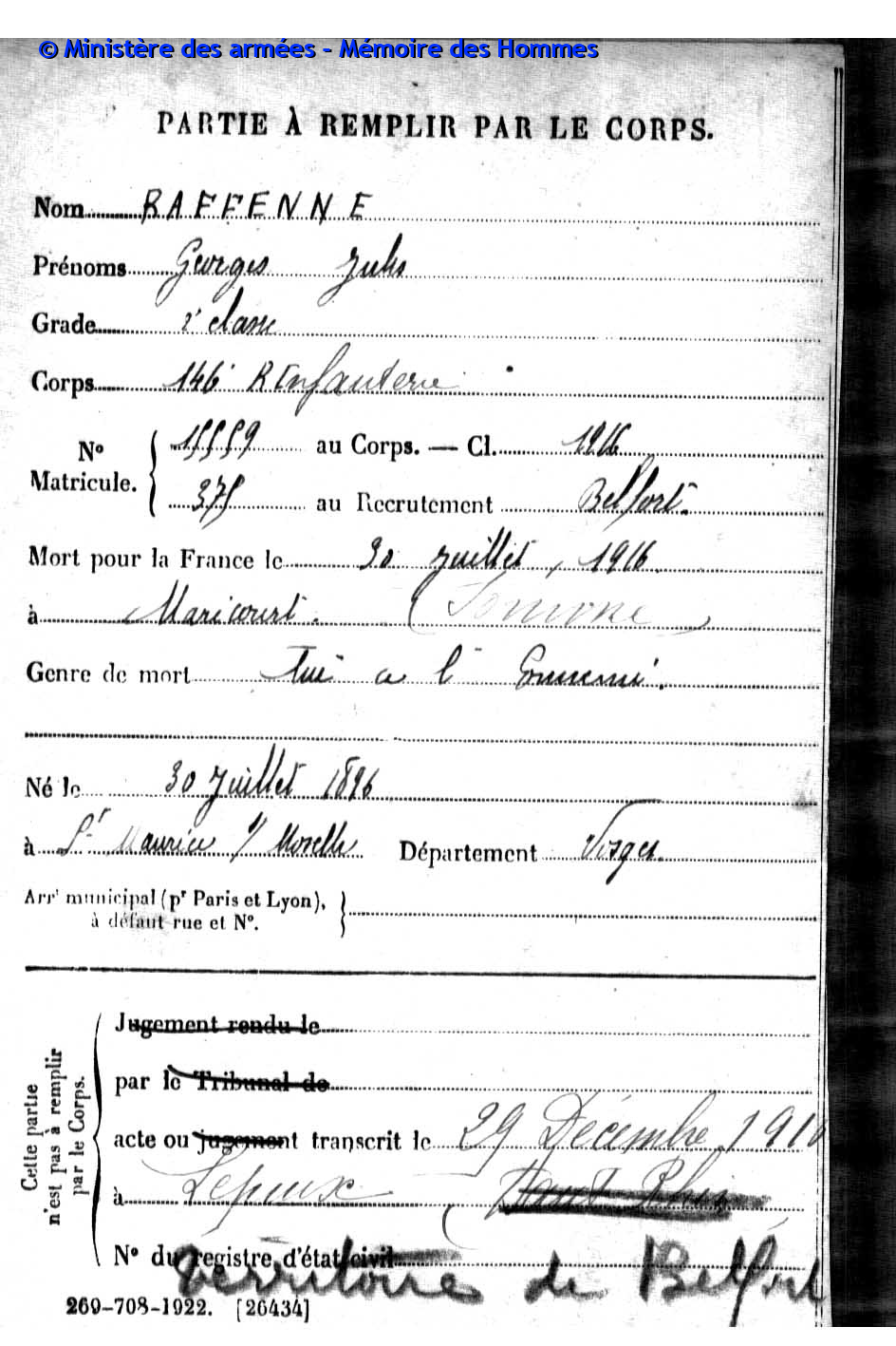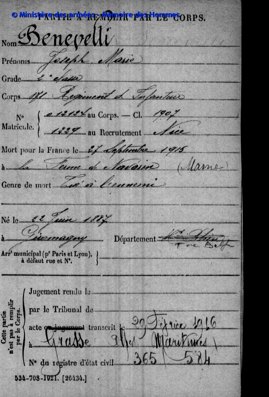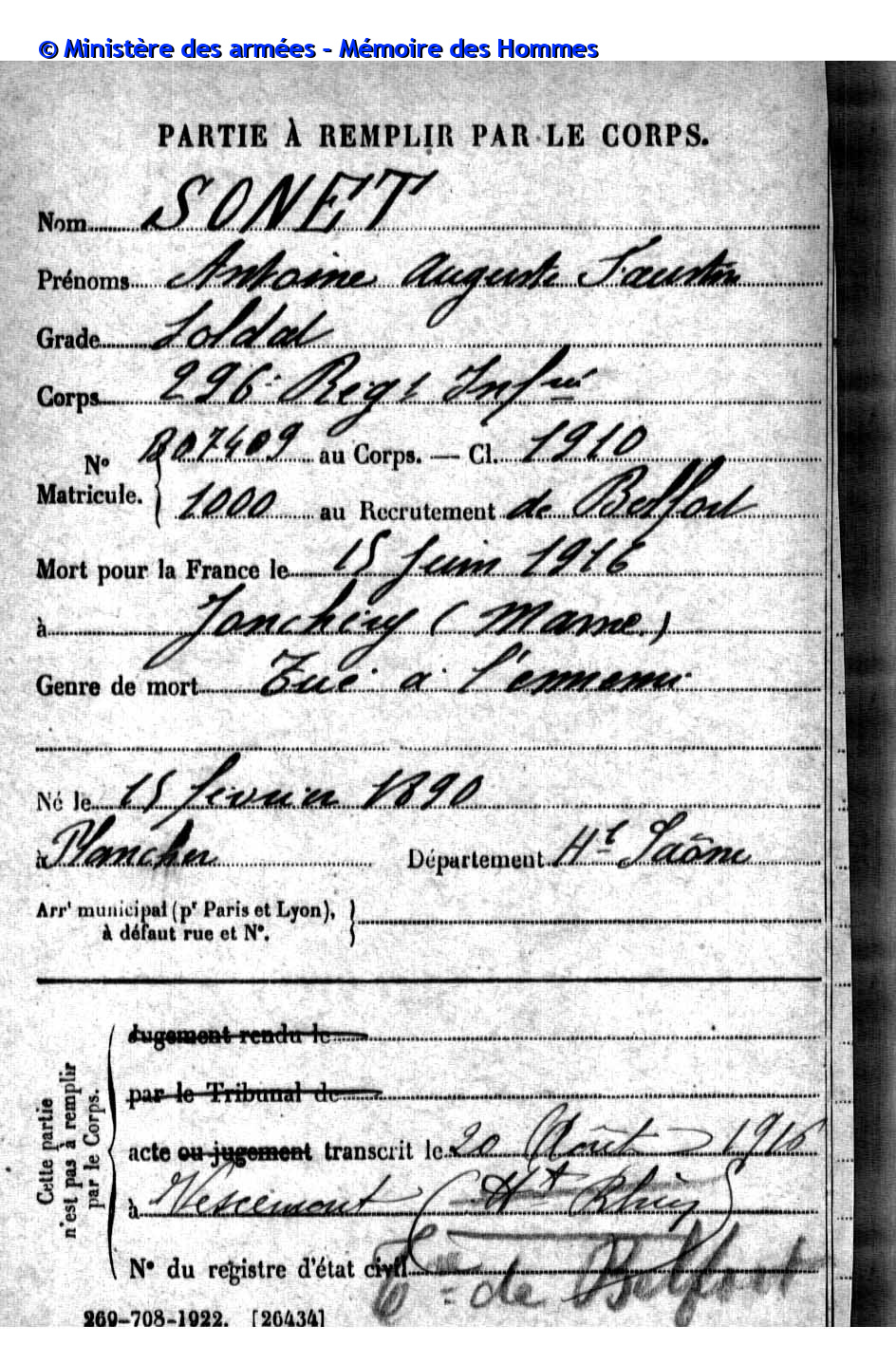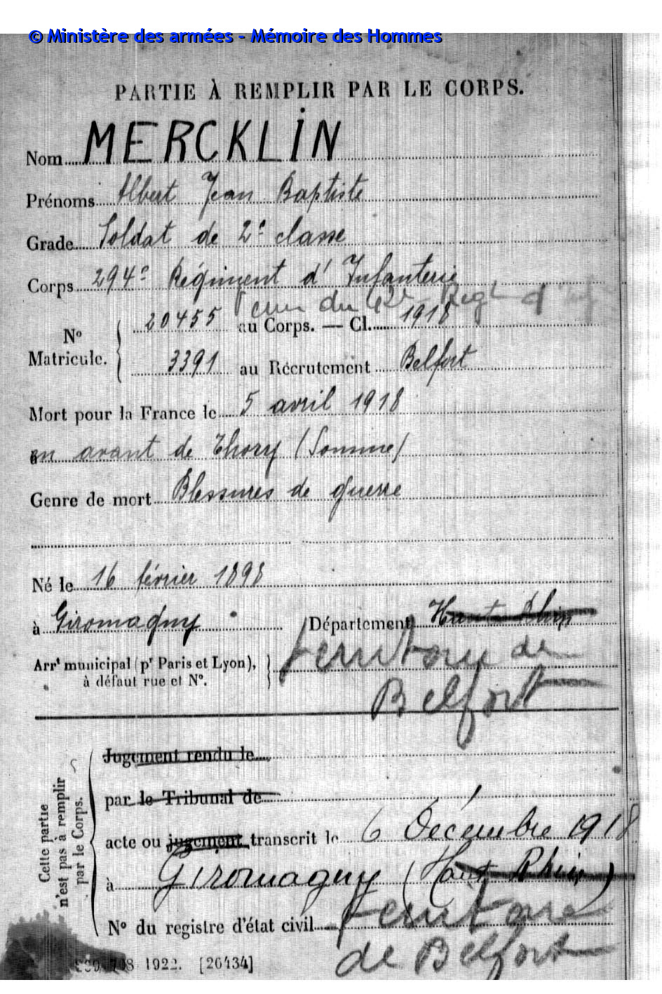 Aspirant GINOT Marcel Charles Jean 26.06.1898 - 02.06.1918 152ème Régiment d'Infanterie 9ème Compagnie (Rote Teufel aus Colmar / F) Gefallen in Belleau - Aisne (F) |