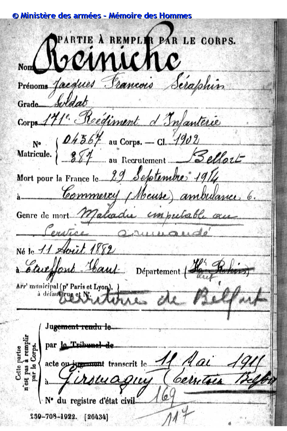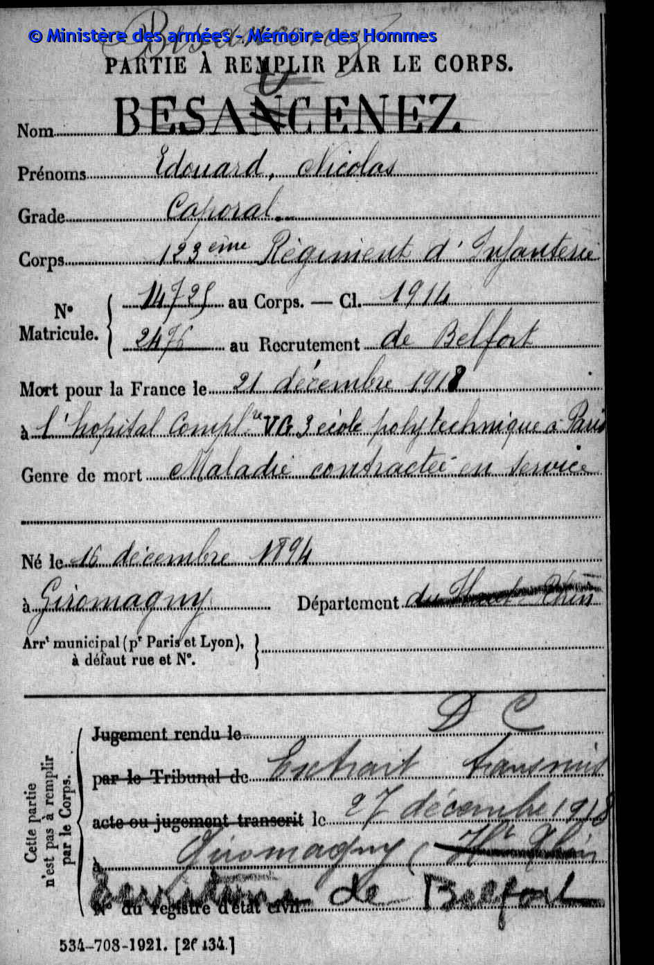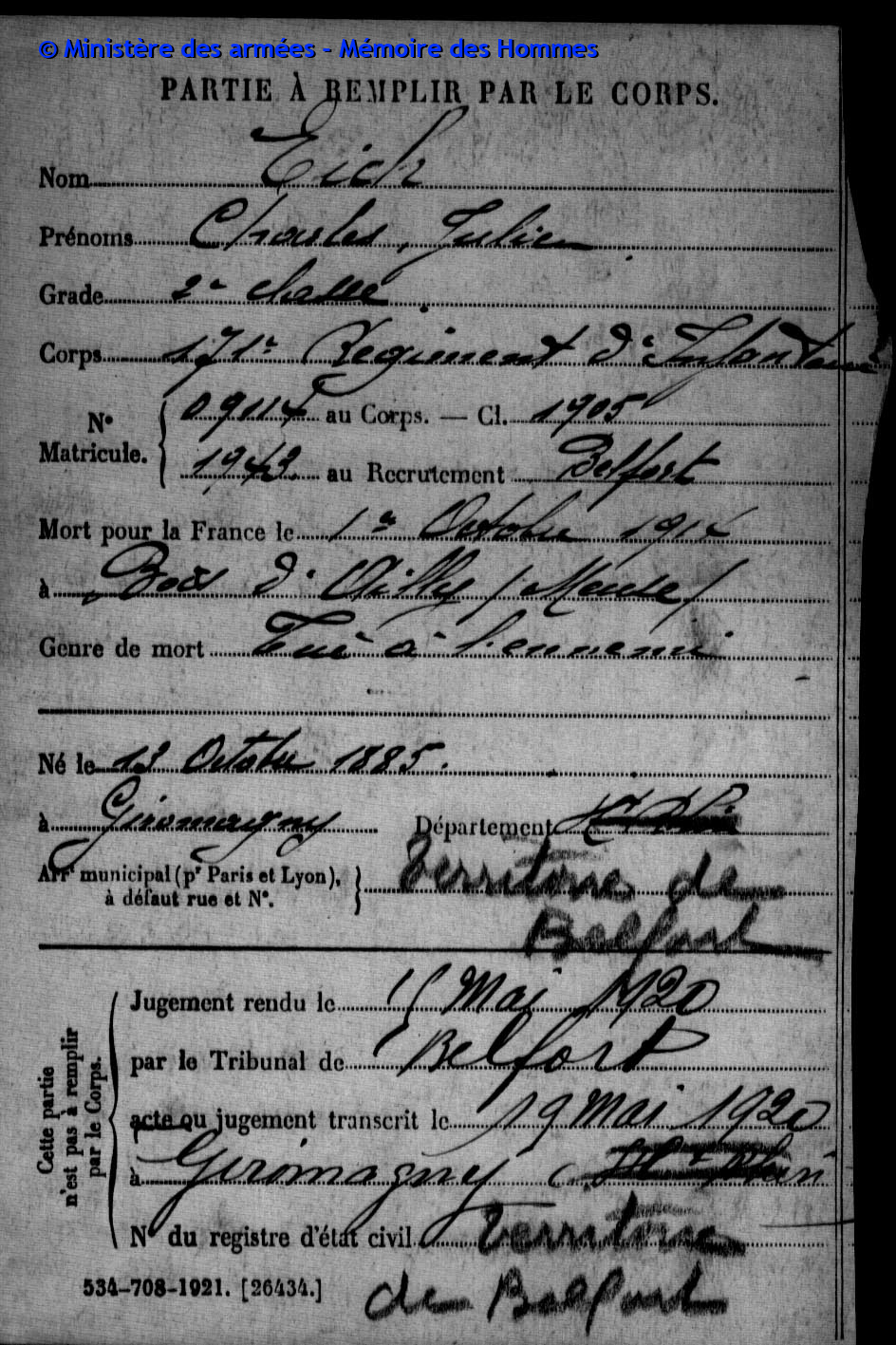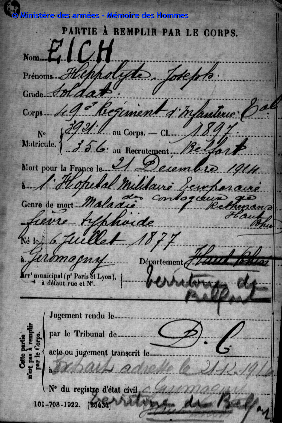 Soldat EICH Hippolyte Joseph 06.07.1877 - 21.12.1914 49ème Régiment d'Infanterie Verstarb durch Krankheit im Hôpital temporaire in Belfort (F) |