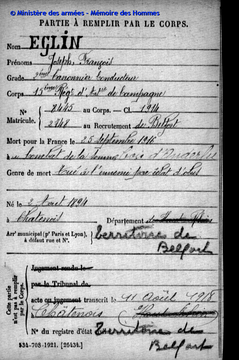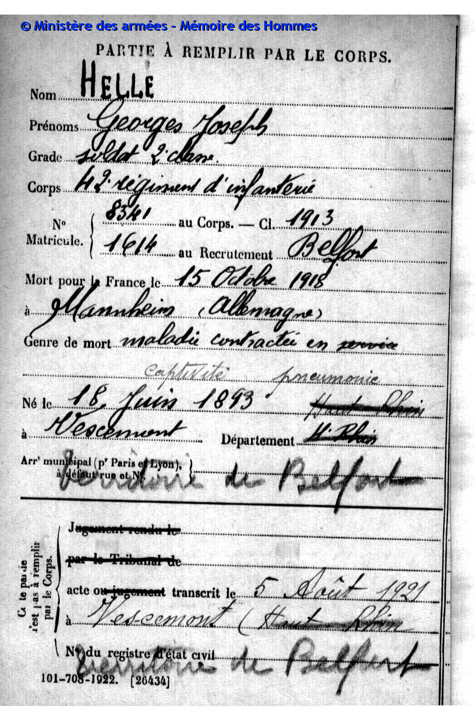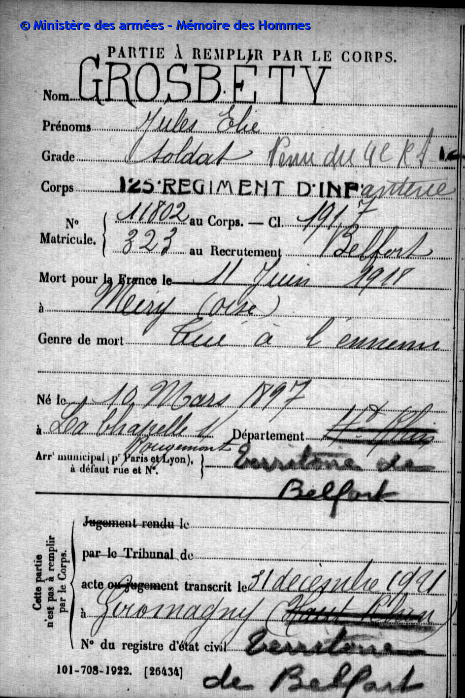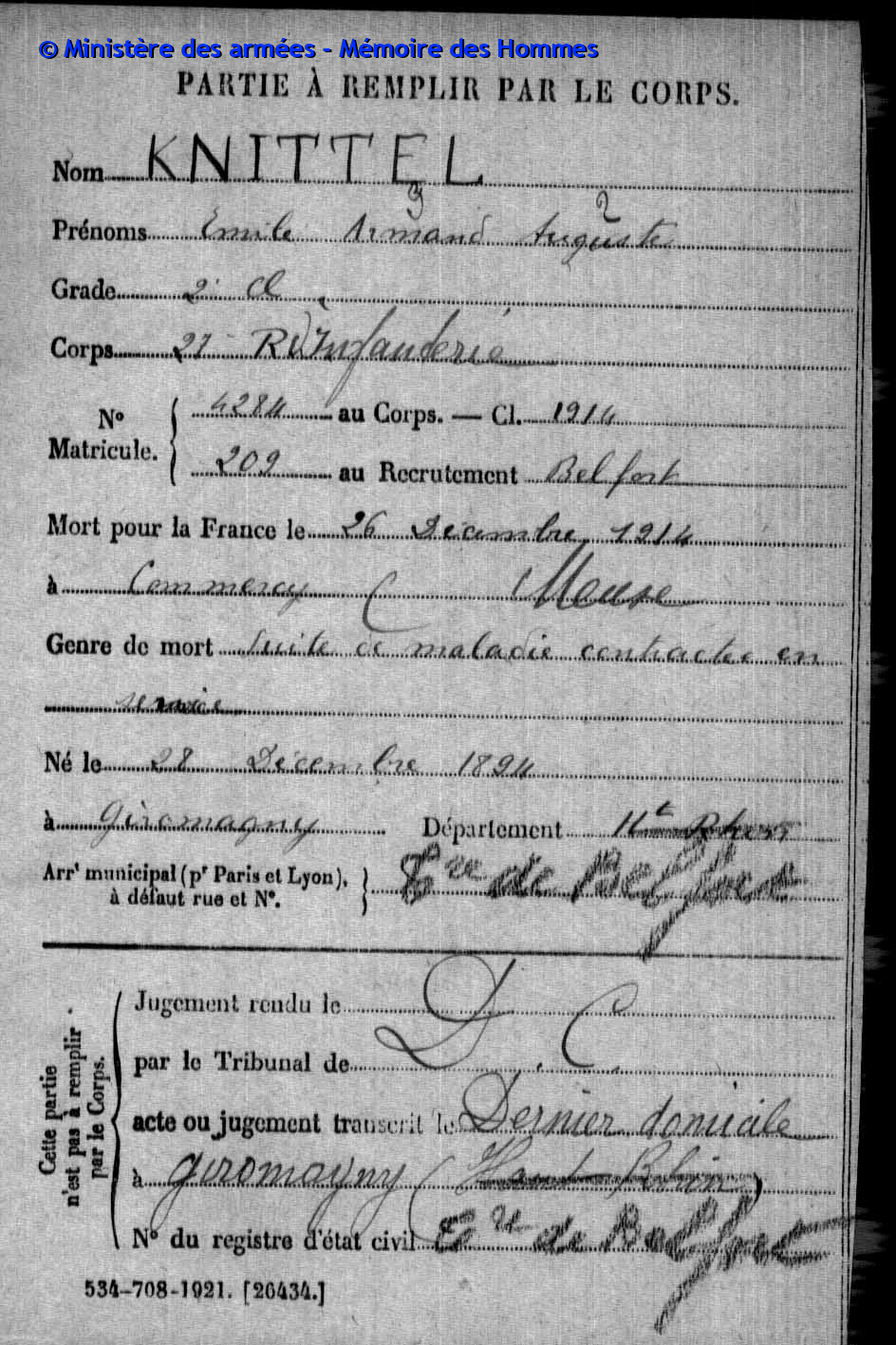 Soldat EICH Hippolyte Joseph 06.07.1877 - 21.12.1914 49ème Régiment d'Infanterie Verstarb durch Krankheit im Hôpital temporaire in Belfort (F) |