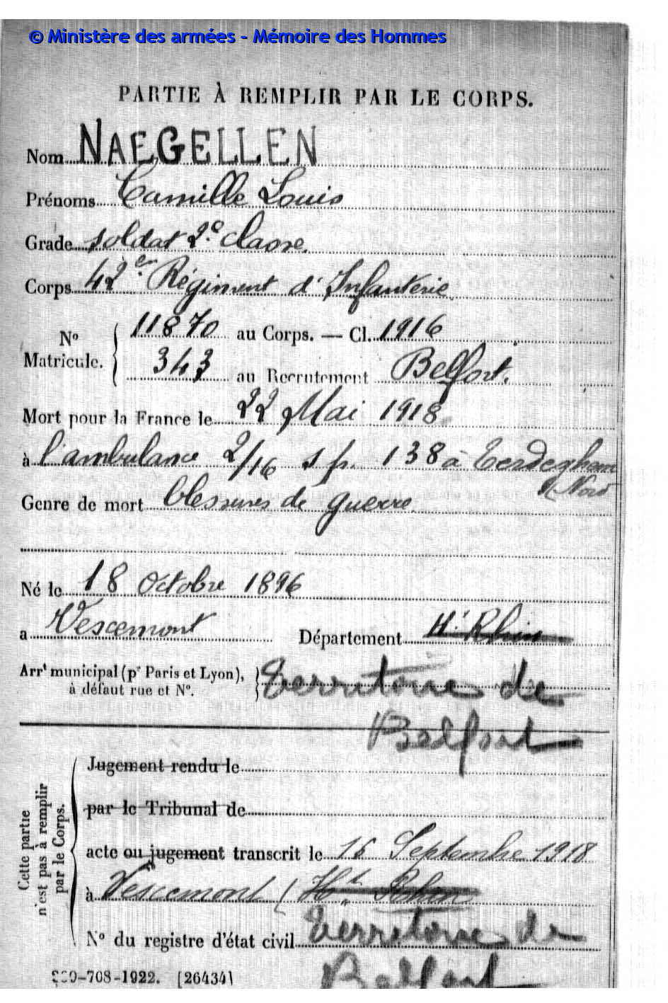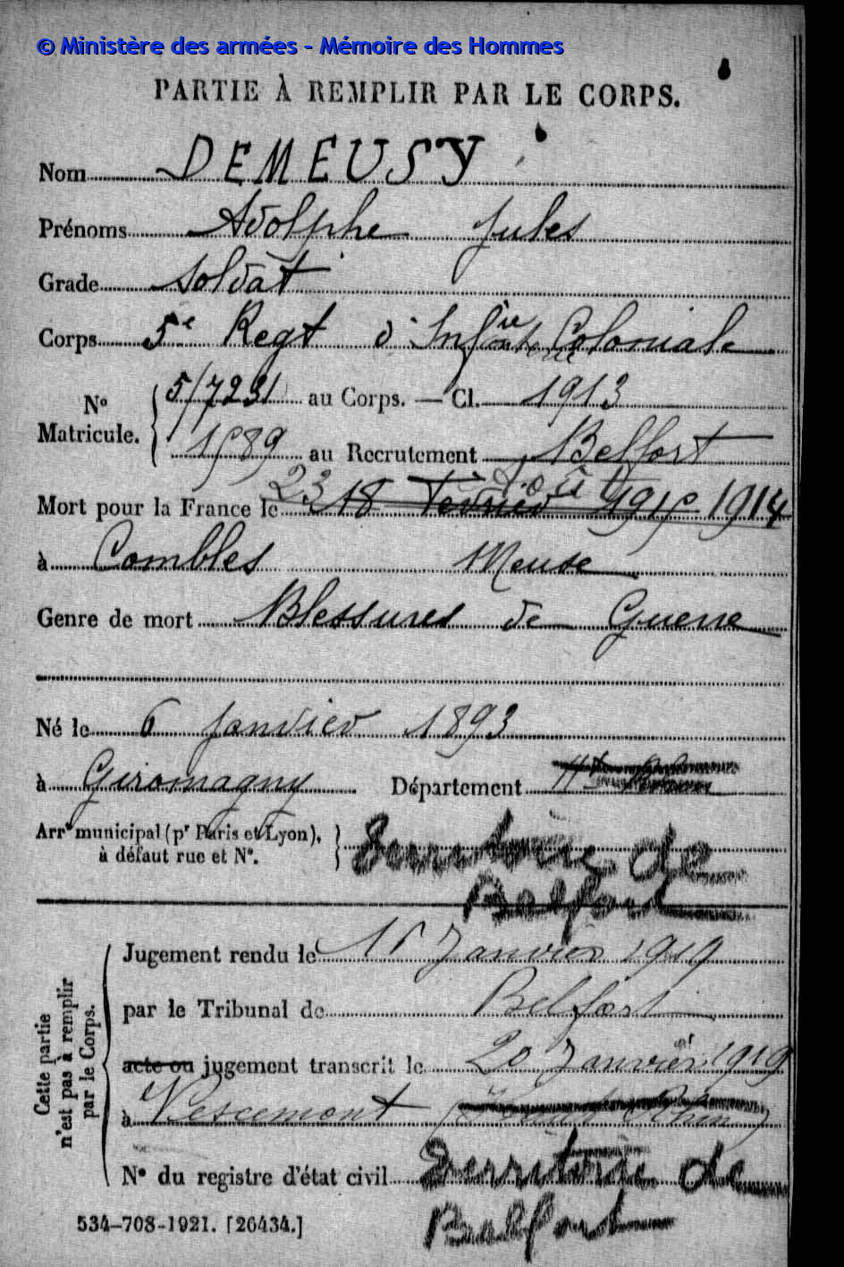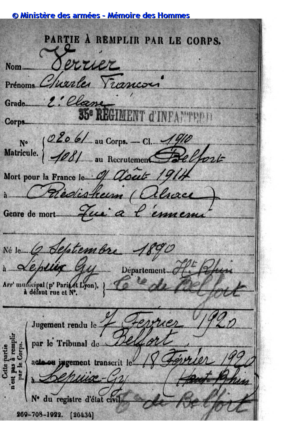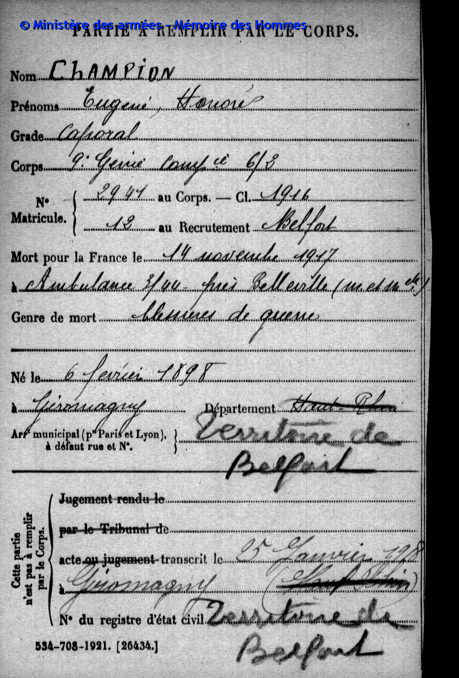 Soldat EICH Hippolyte Joseph 06.07.1877 - 21.12.1914 49ème Régiment d'Infanterie Verstarb durch Krankheit im Hôpital temporaire in Belfort (F) |
