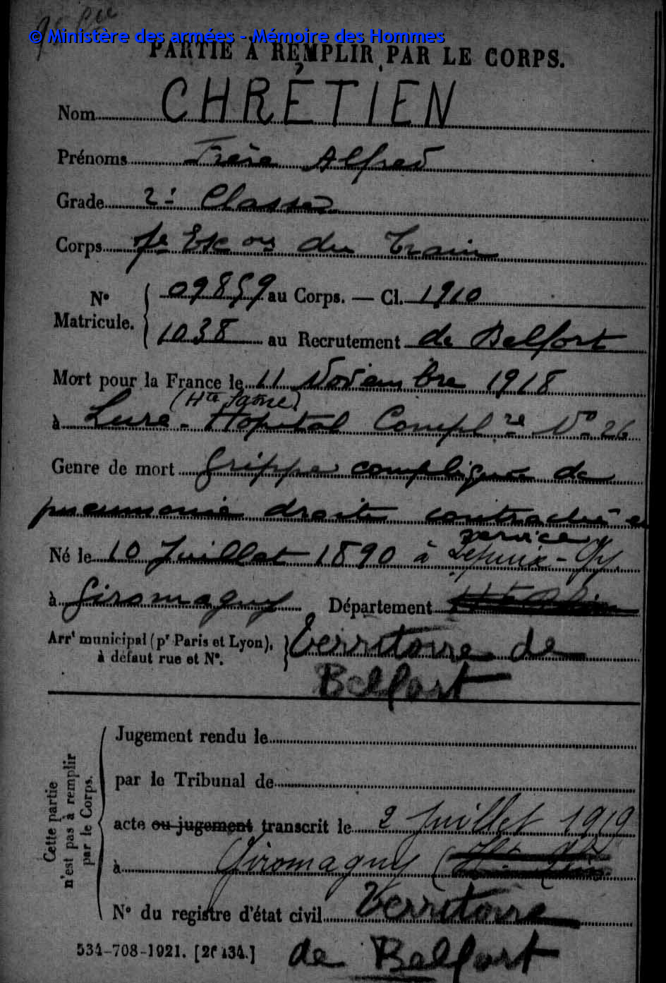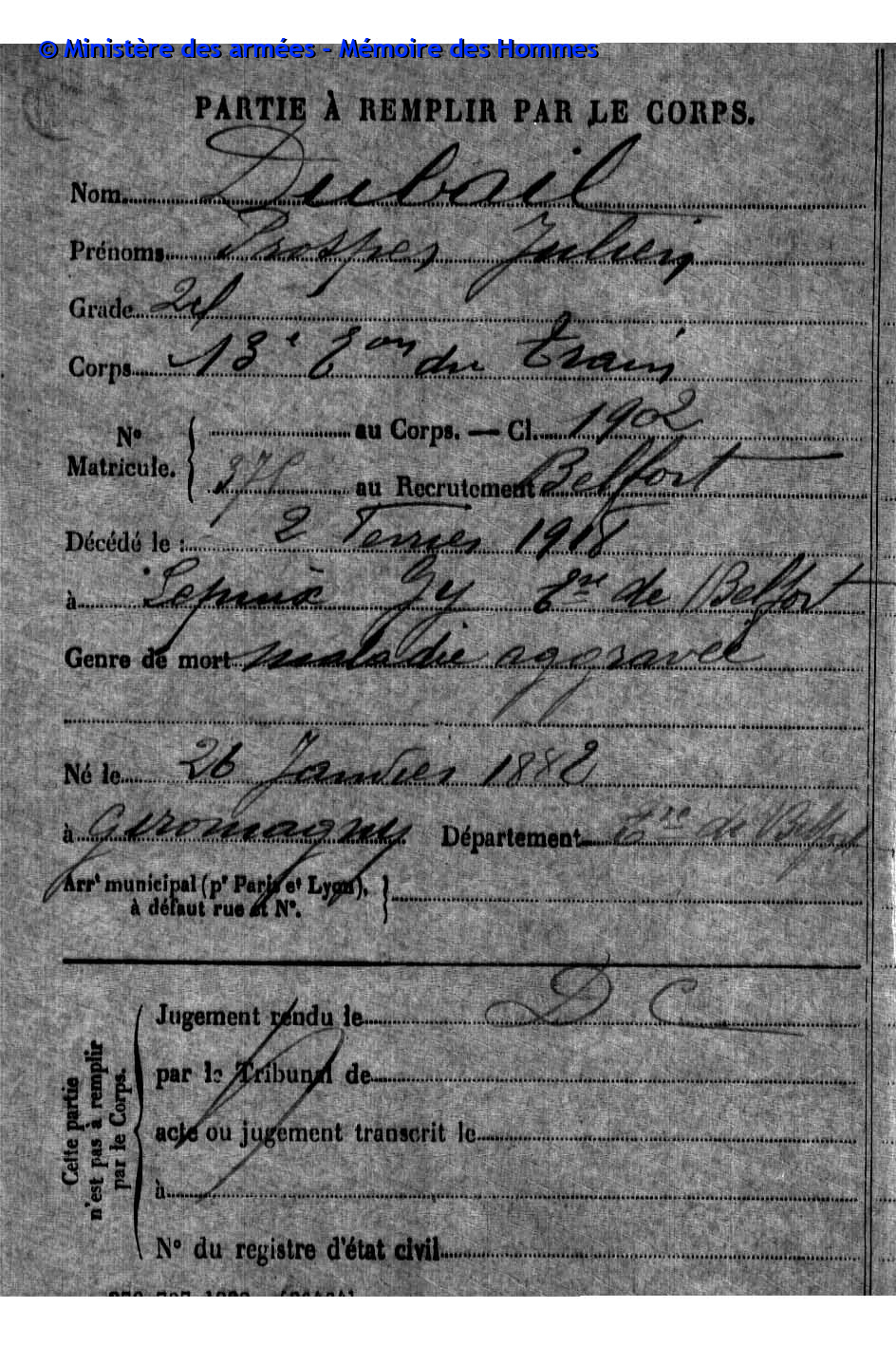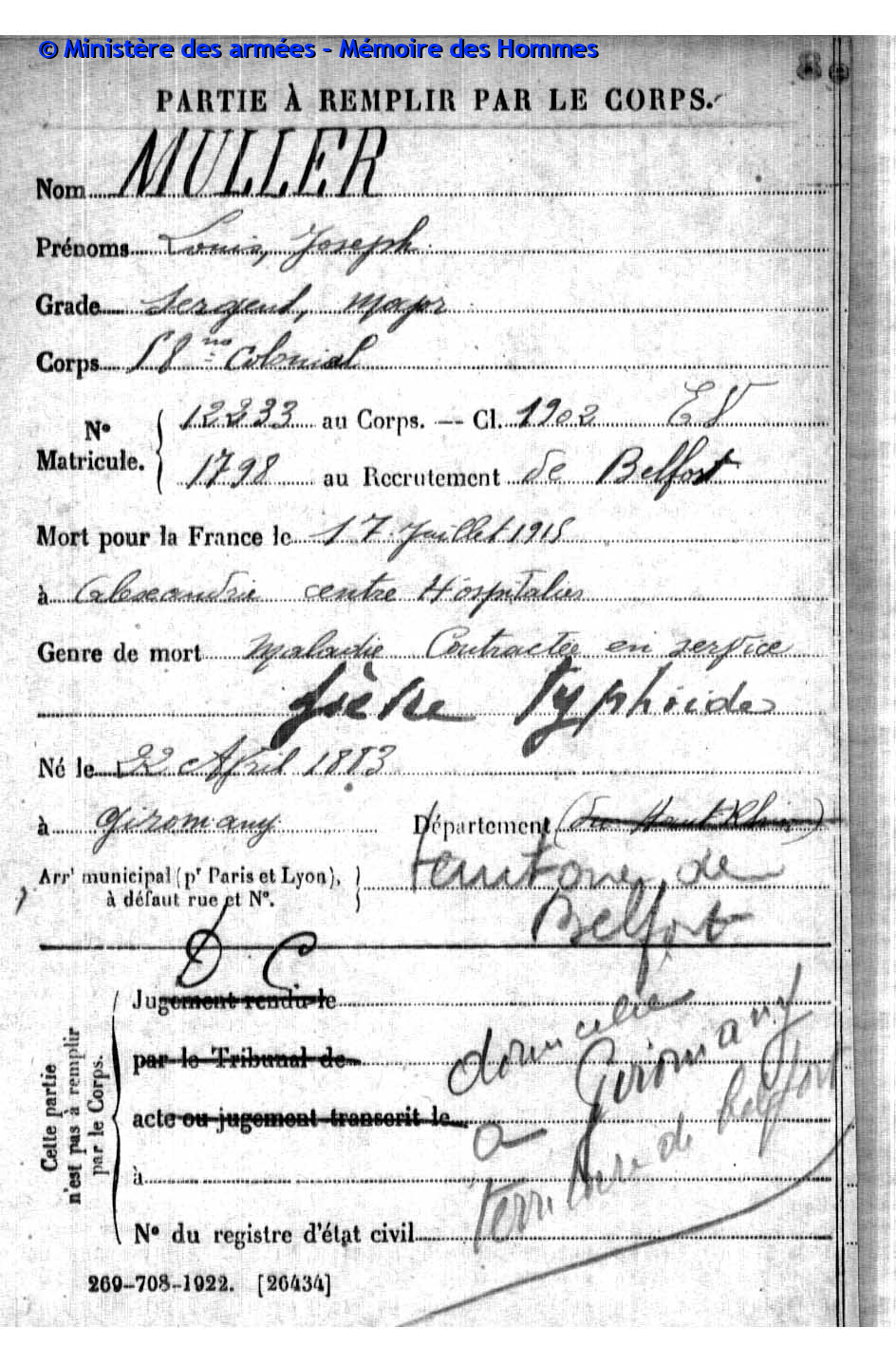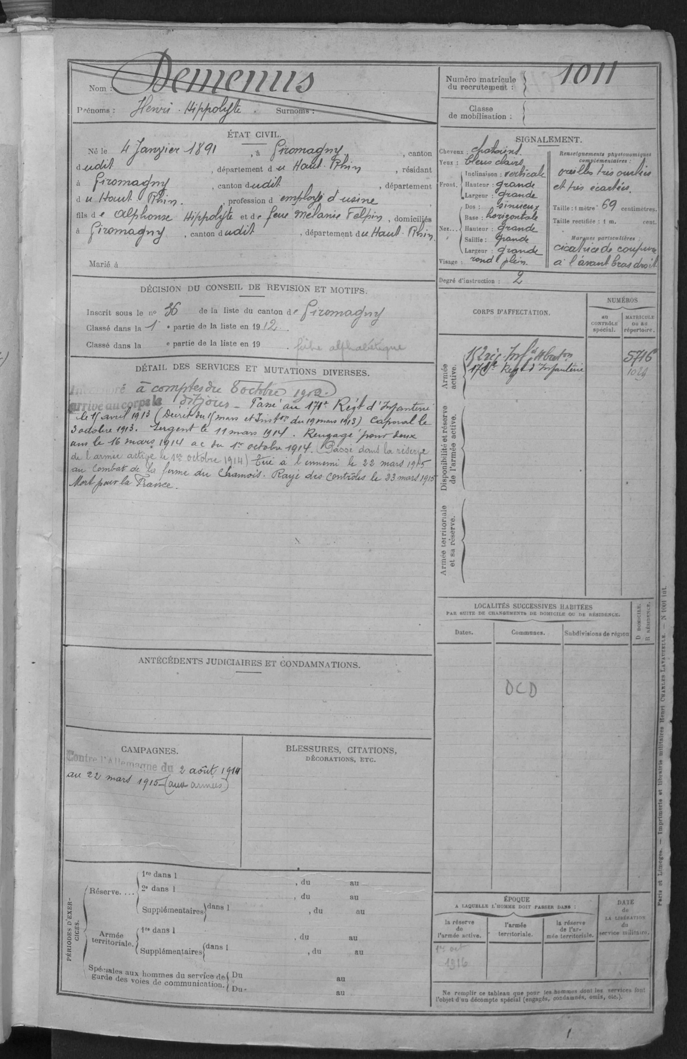 Soldat EICH Hippolyte Joseph 06.07.1877 - 21.12.1914 49ème Régiment d'Infanterie Verstarb durch Krankheit im Hôpital temporaire in Belfort (F) |