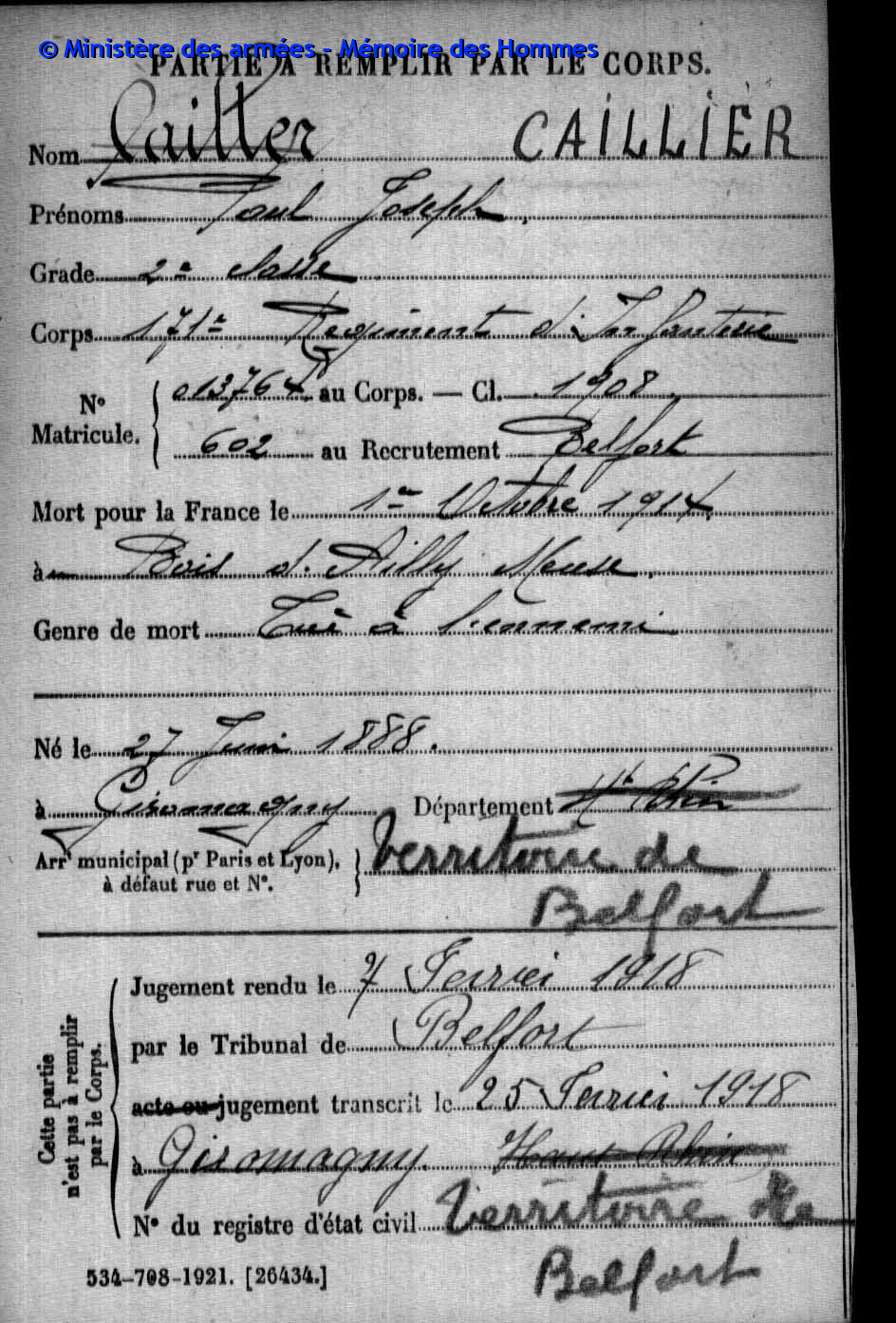 2ème classe CANAL Charles Joseph 31.07.1888 - 10.12.1914 171ème Régiment d'Infanterie Gefallen in Apremont - Meuse (F) |