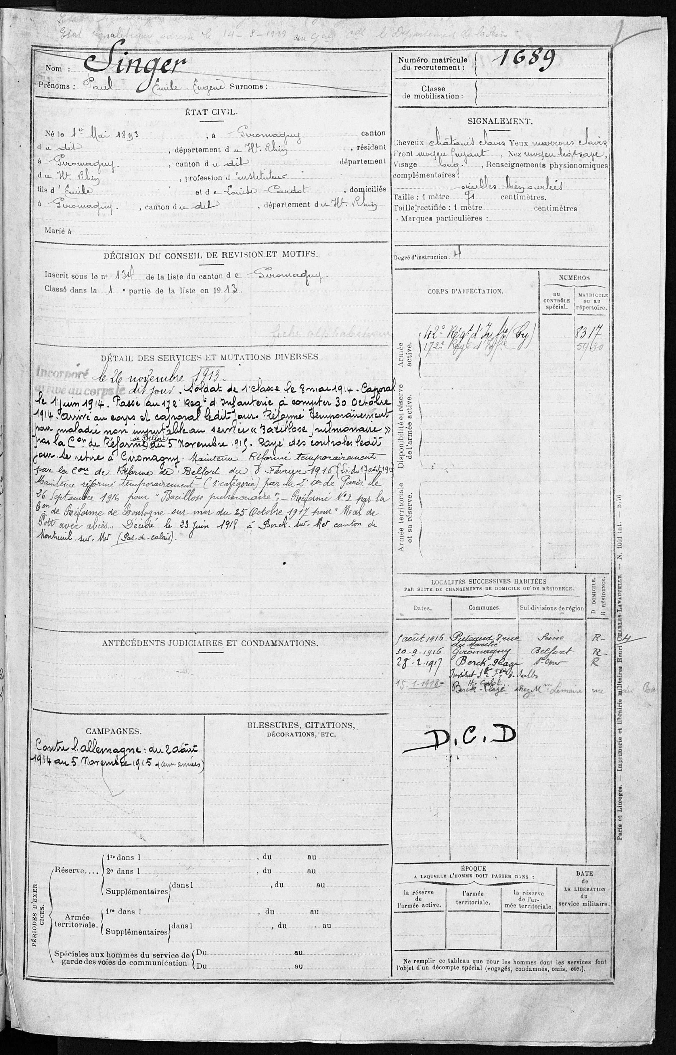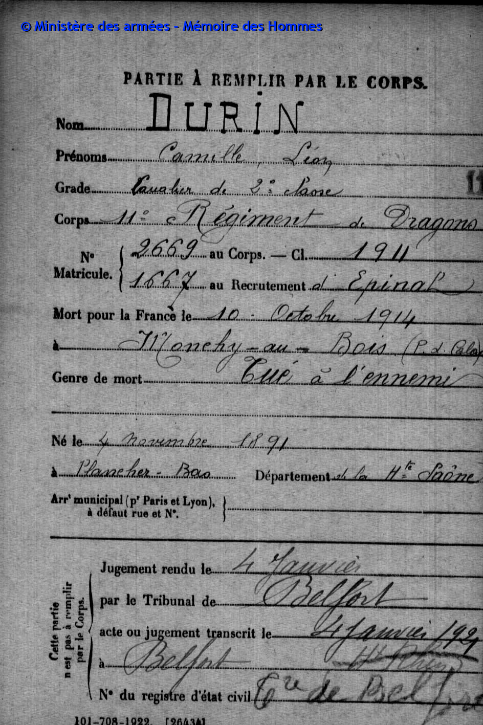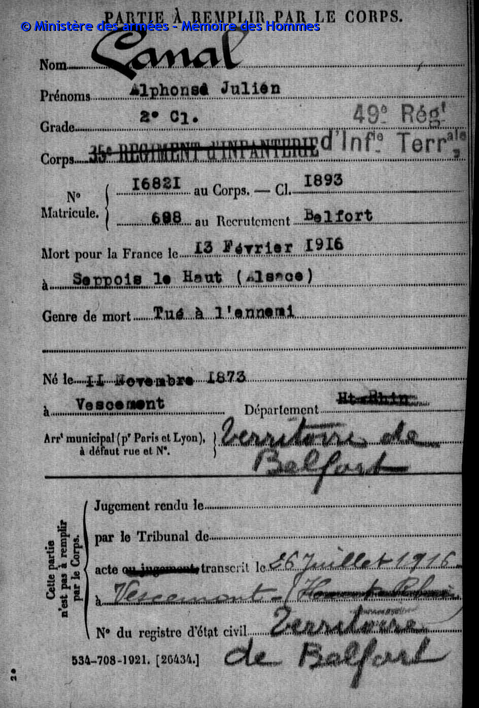 2ème classe CANAL Jules Alphonse 05.04.1894 - 05.06.1916 101ème Régiment d'Infanterie Gefallen in Damloup - Meuse (F) |