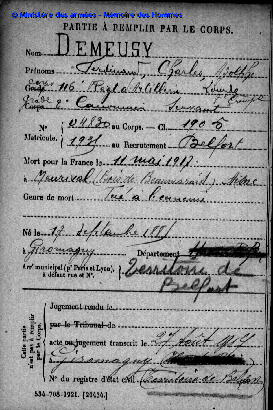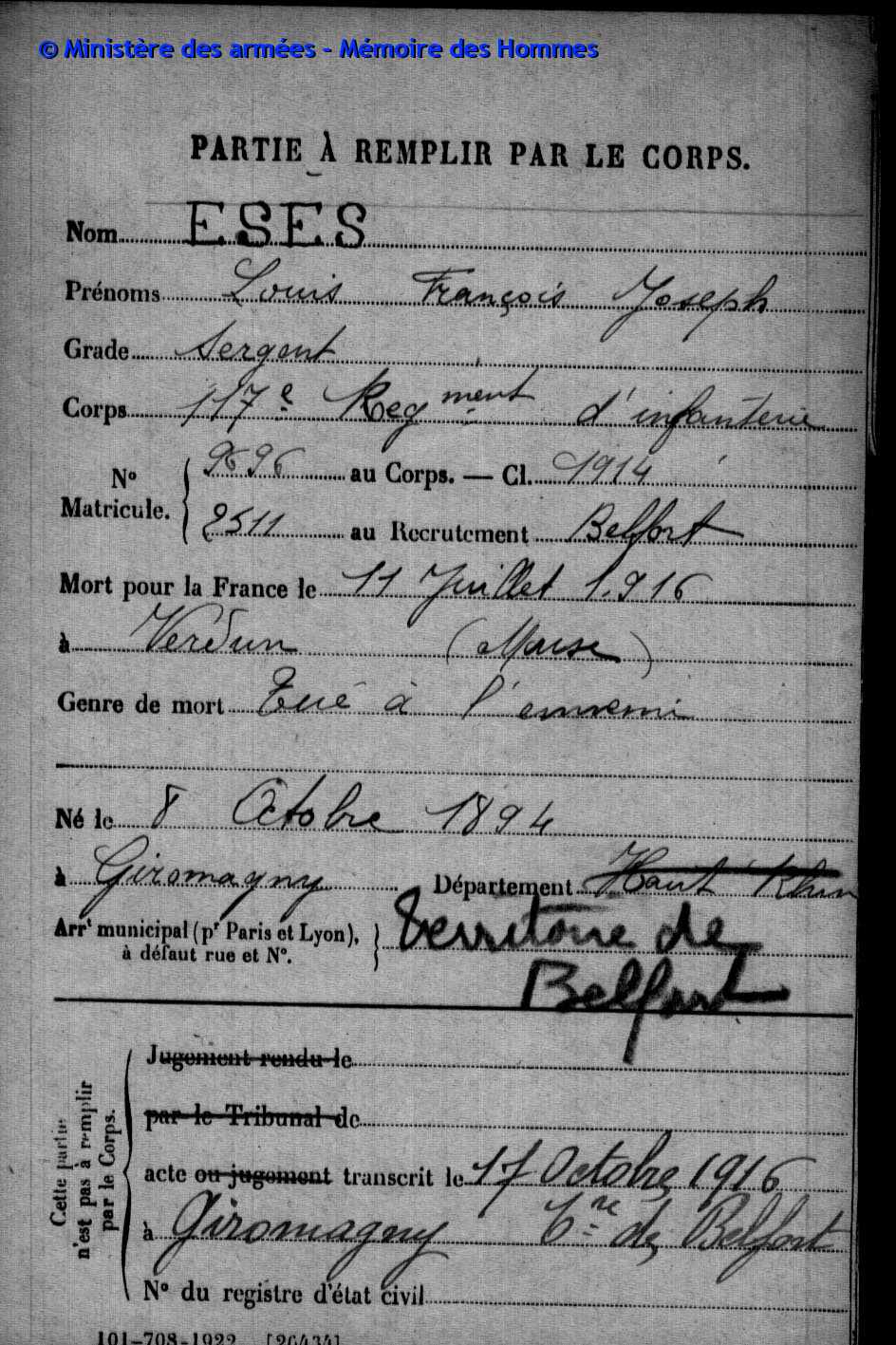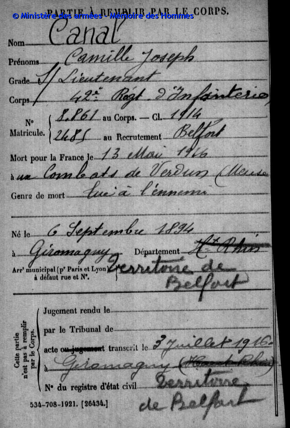 Sous-lieutenant CANAL Camille Joseph 06.09.1894 - 13.05.1916 42ème Régiment d'Infanterie Gefallen beim Fort Vaux in Verdun (F) |