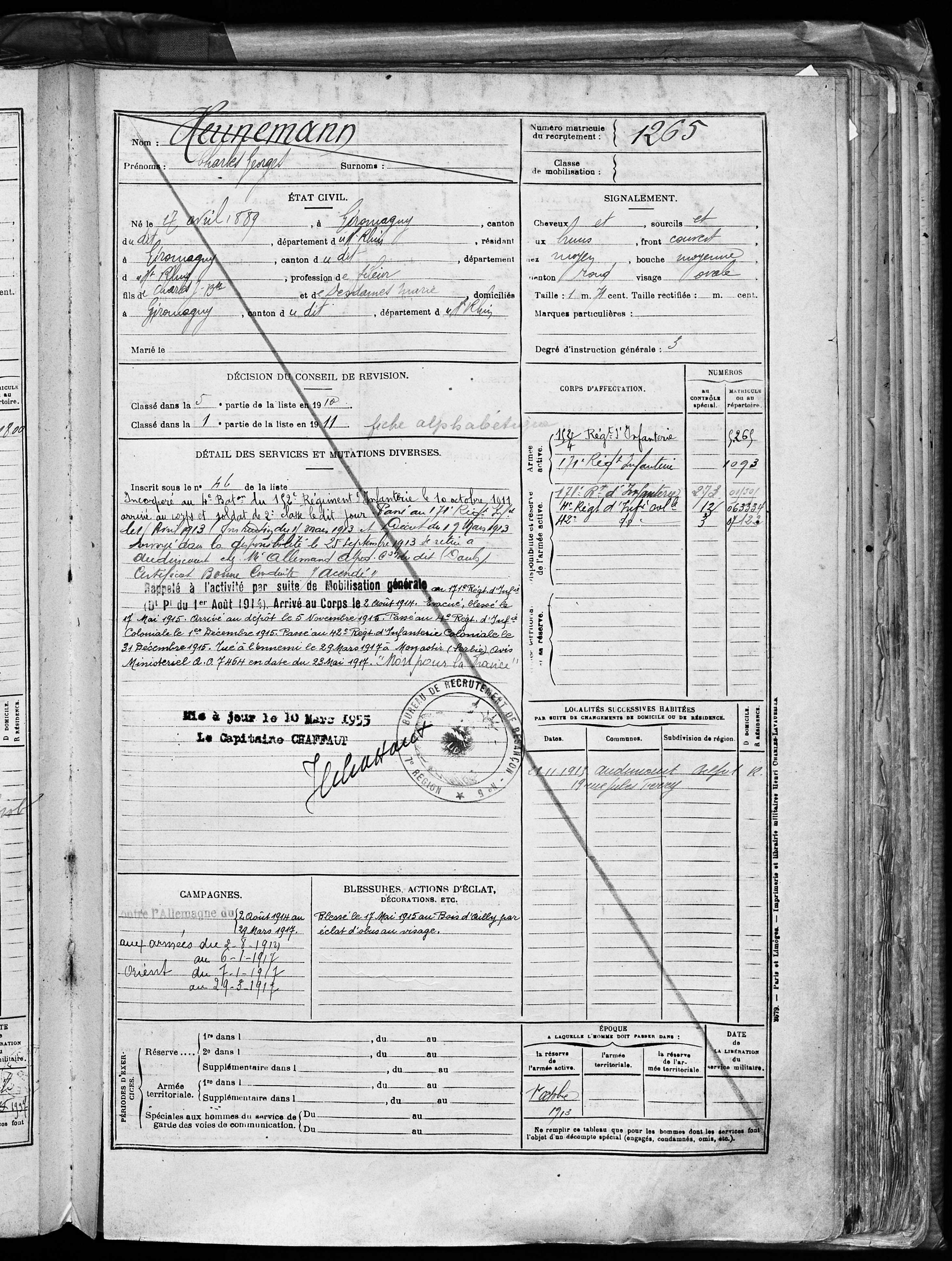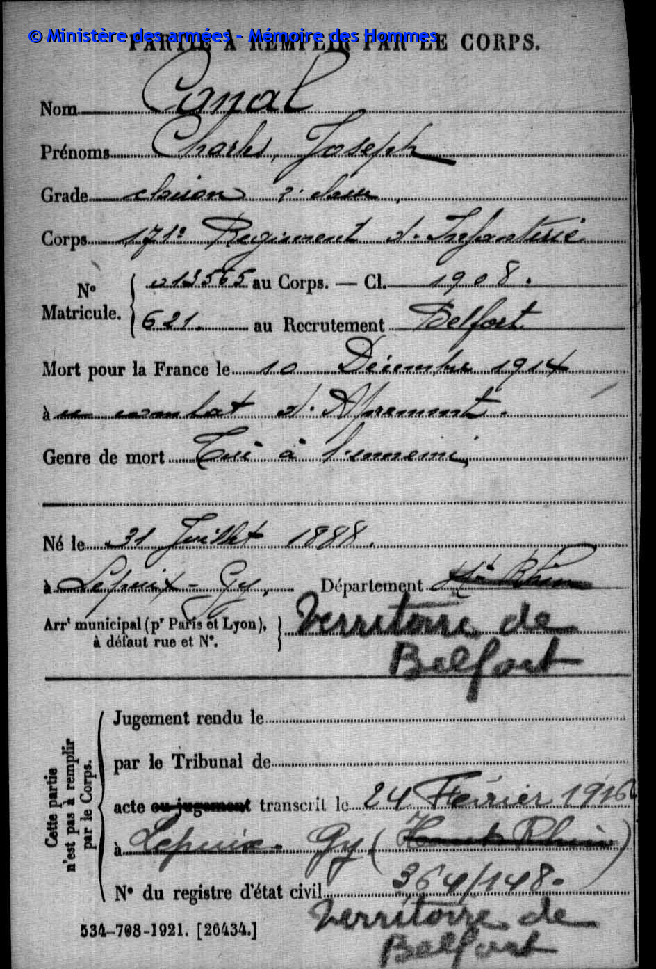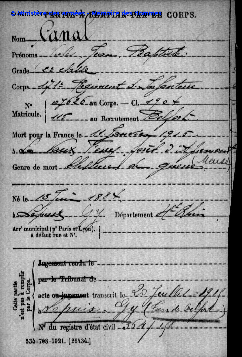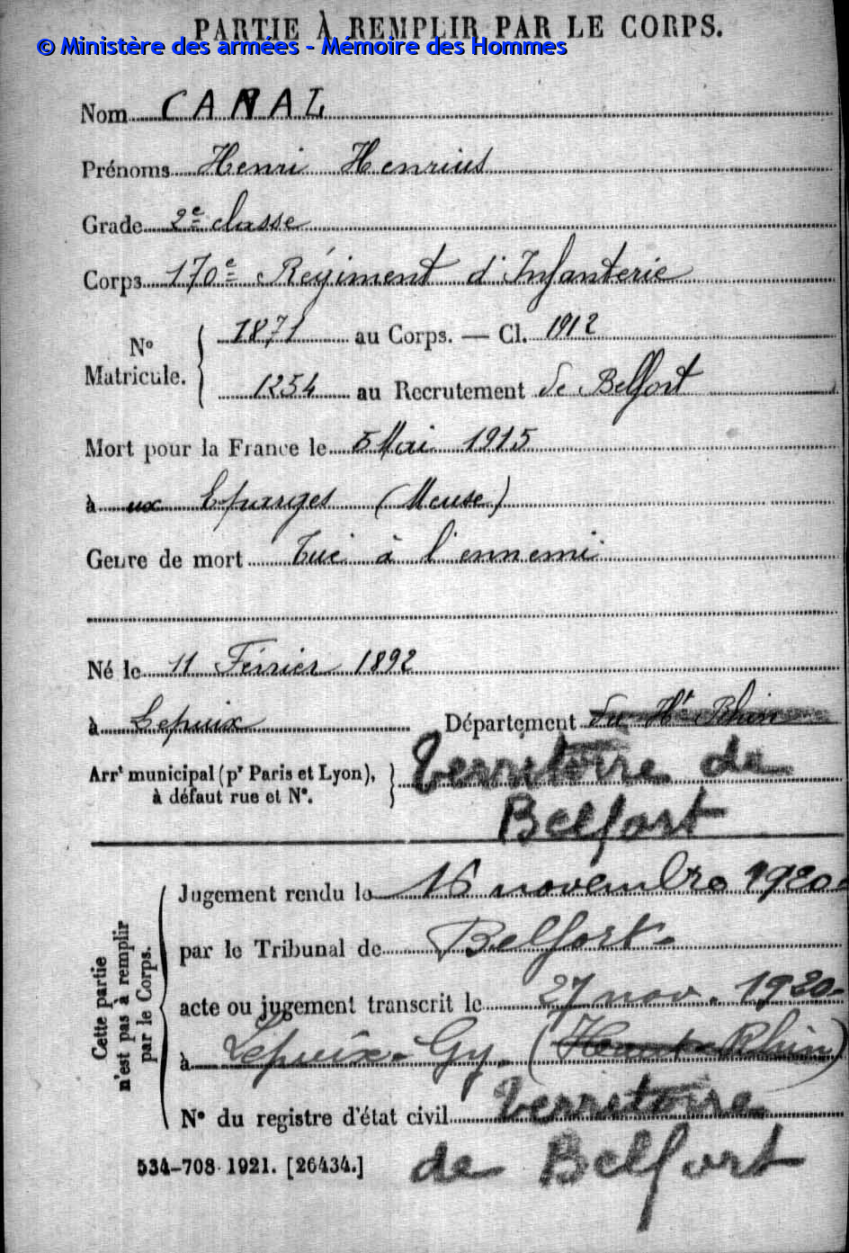 2ème classe CANAL Henri Henrius 11.02.1892 - 06.05.1915 170ème Régiment d'Infanterie Gefallen in Les Eparges - Meuse (F) |