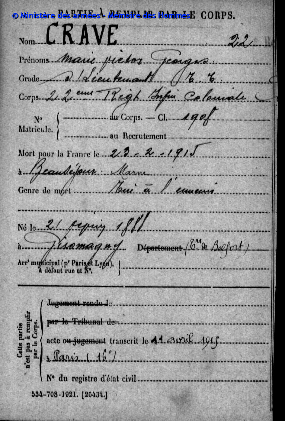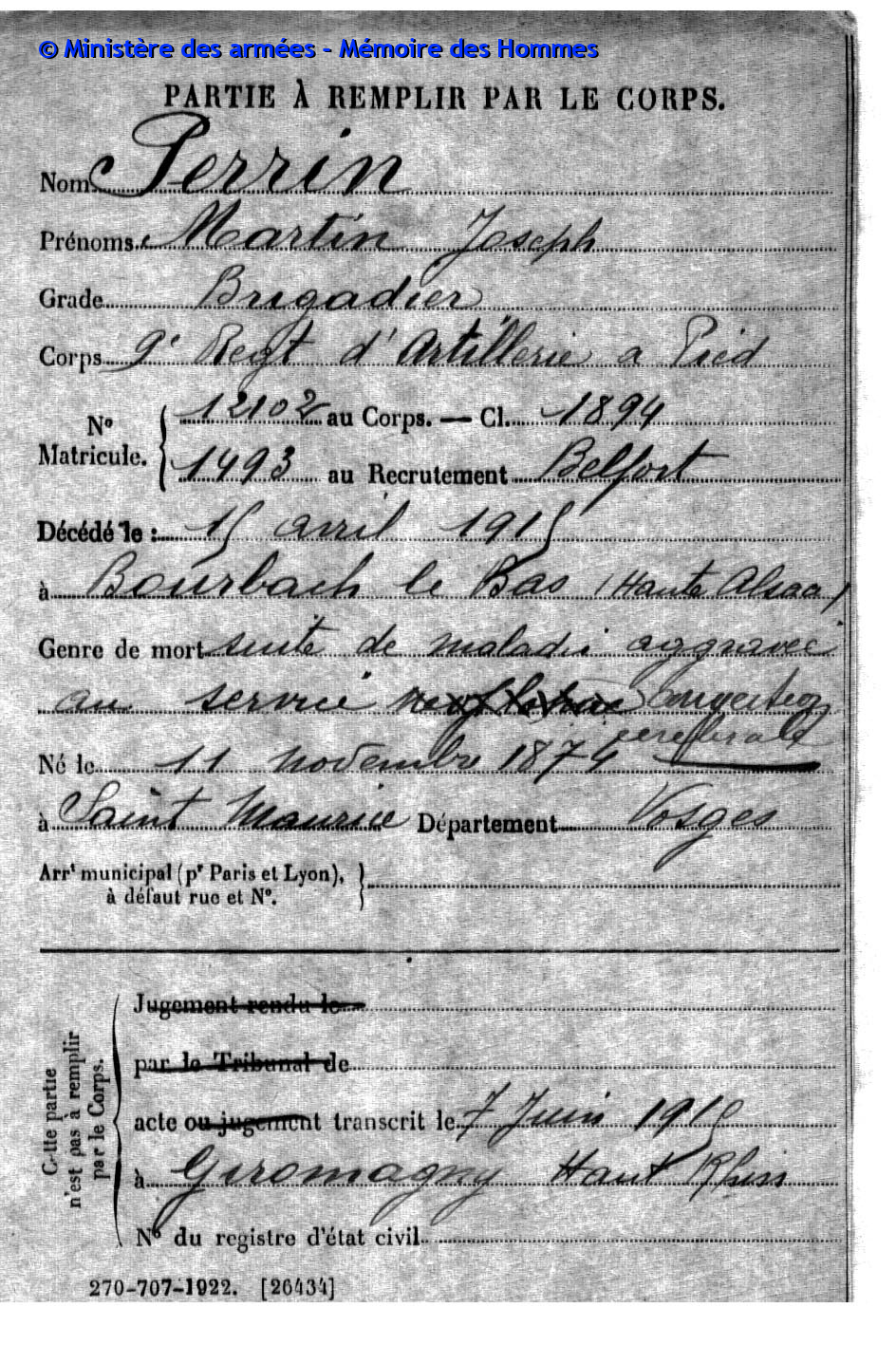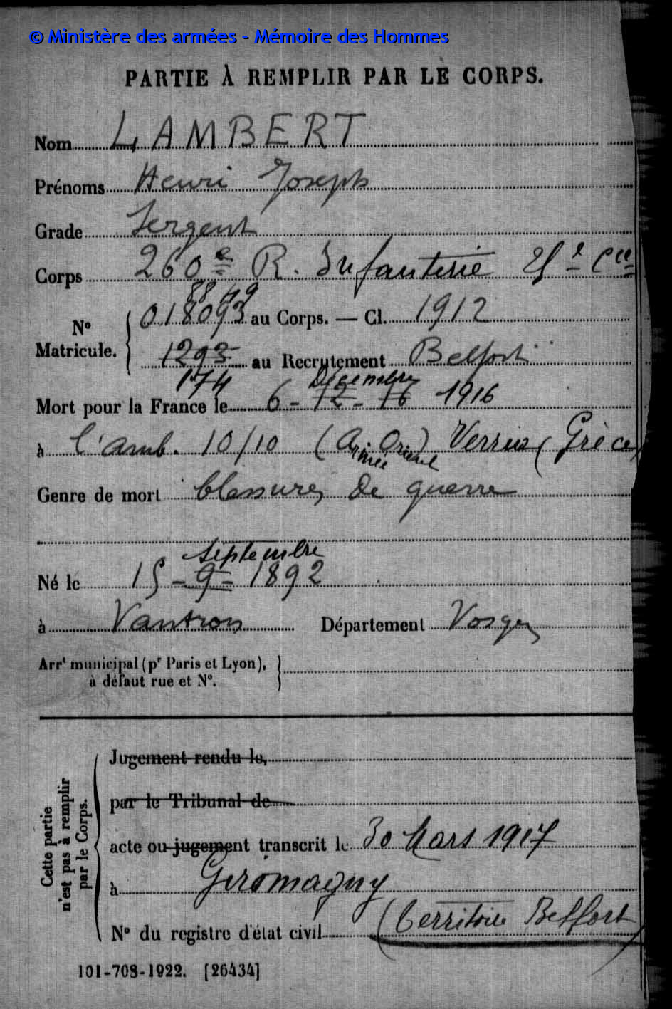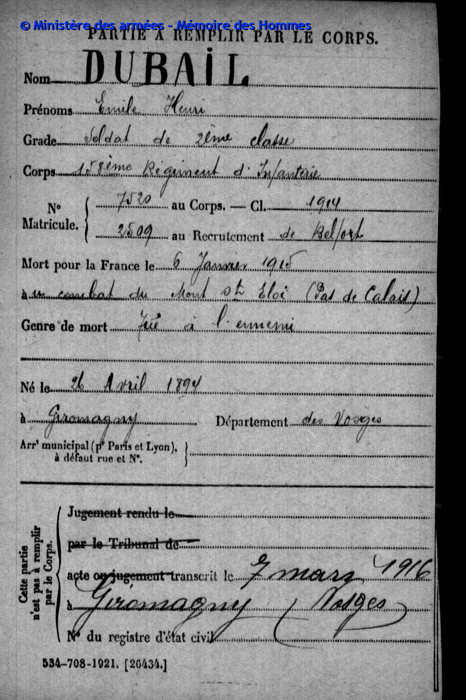 2ème classe CANAL Henri Henrius 11.02.1892 - 06.05.1915 170ème Régiment d'Infanterie Gefallen in Les Eparges - Meuse (F) |