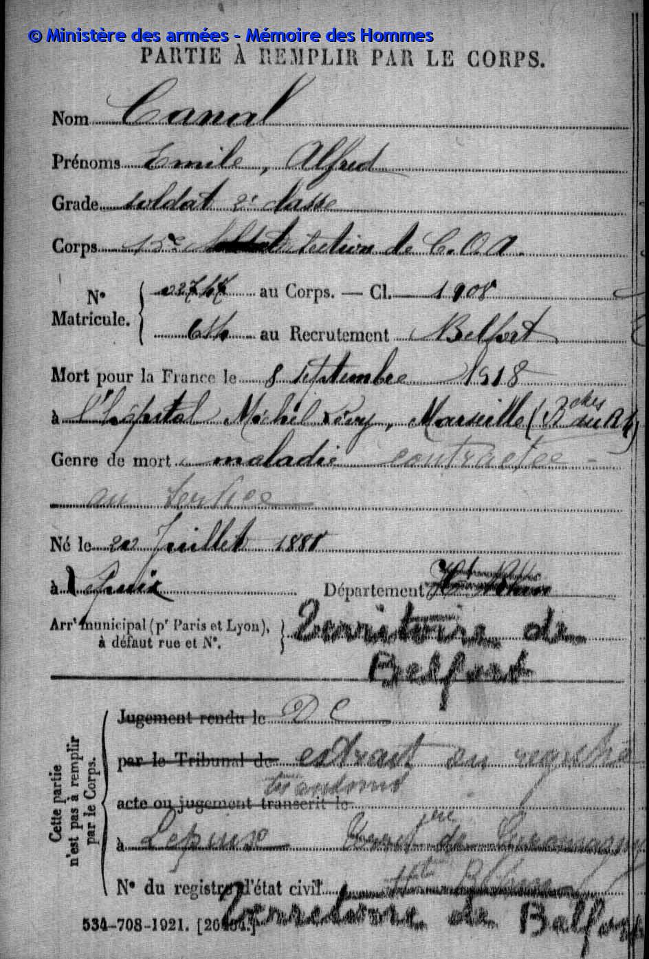 2ème classe CANAL Emile Eugène 03.02.1892 - 20.03.1915 170ème Régiment d'Infanterie Gefallen in Le Mesnil-les-Hurlus (F) |