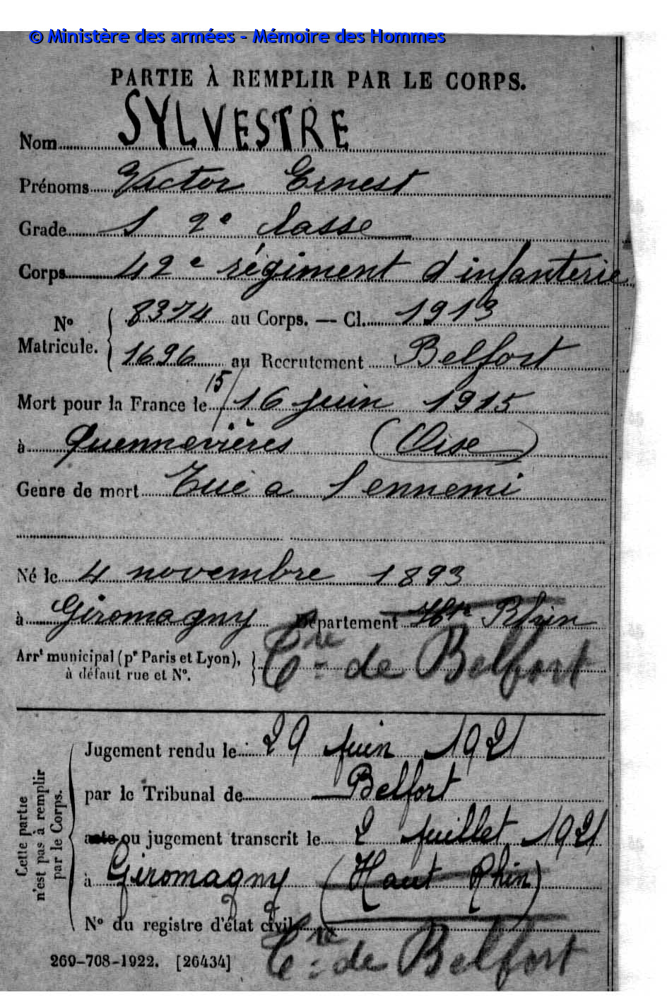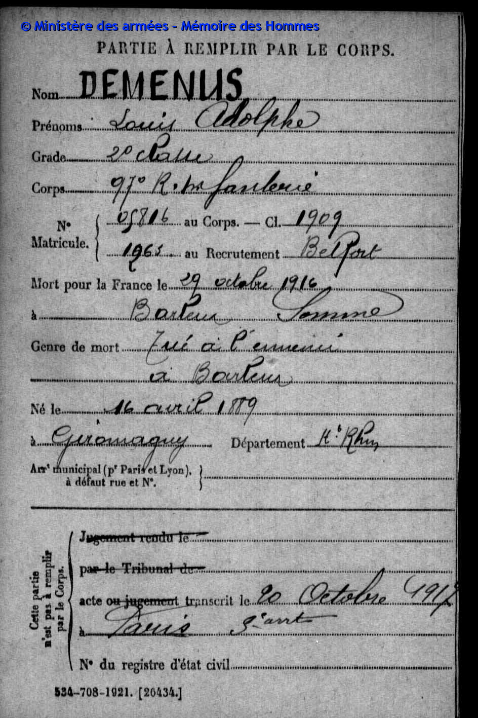 2ème classe SCHMITT Henri 12.01.1895 - 20.11.1916 156ème Régiment d'Infanterie Gefallen in Sailly-Saillisel - Somme (F) |