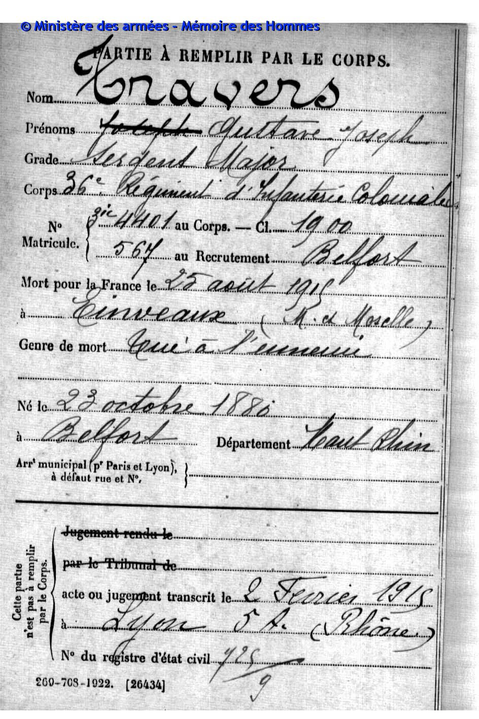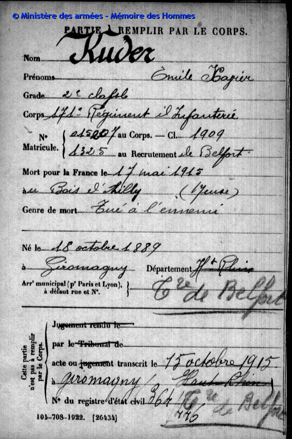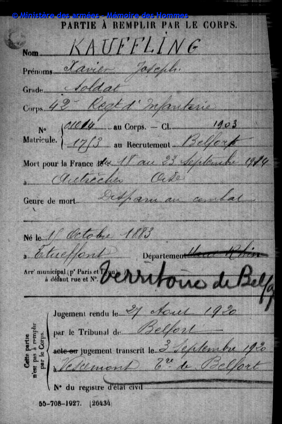 Soldat KAUFFLING Xavier Joseph 15.10.1883 - 18.09.1914 42ème Régiment d'Infanterie Gilt als vermisst in Autreches - Oise (F) |