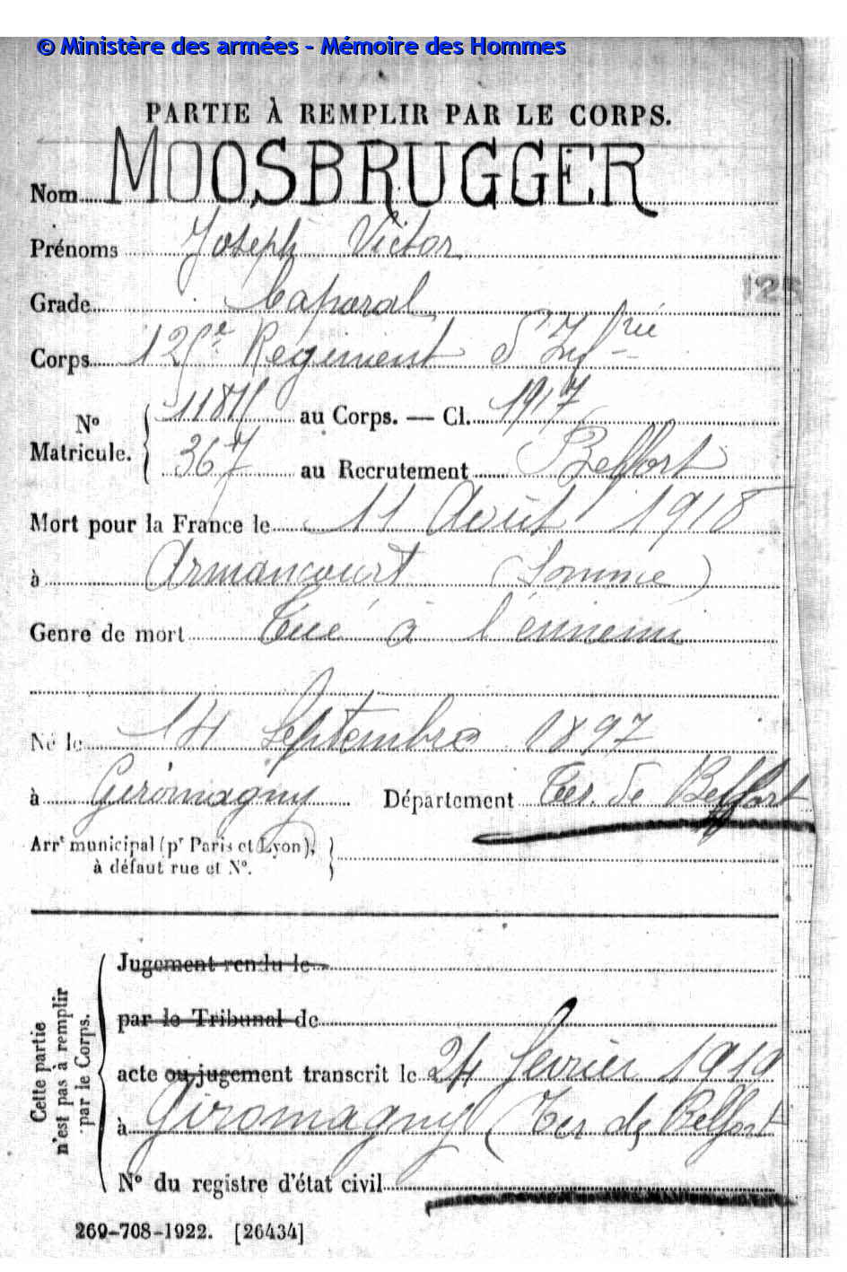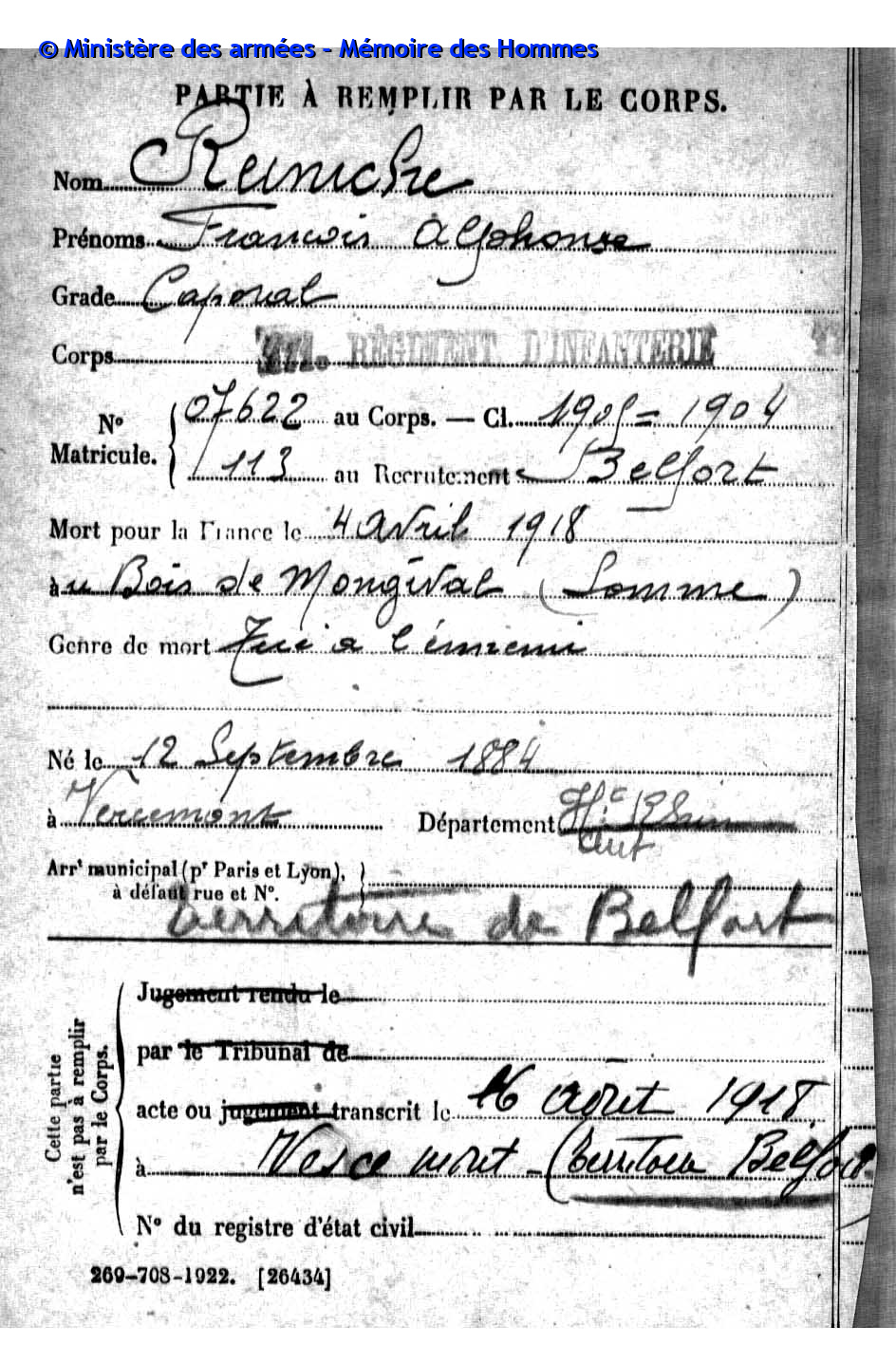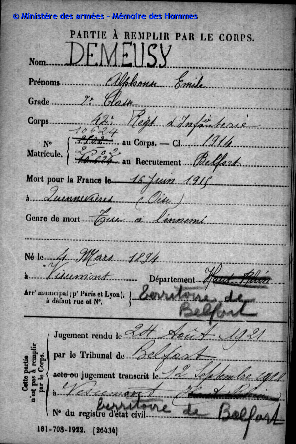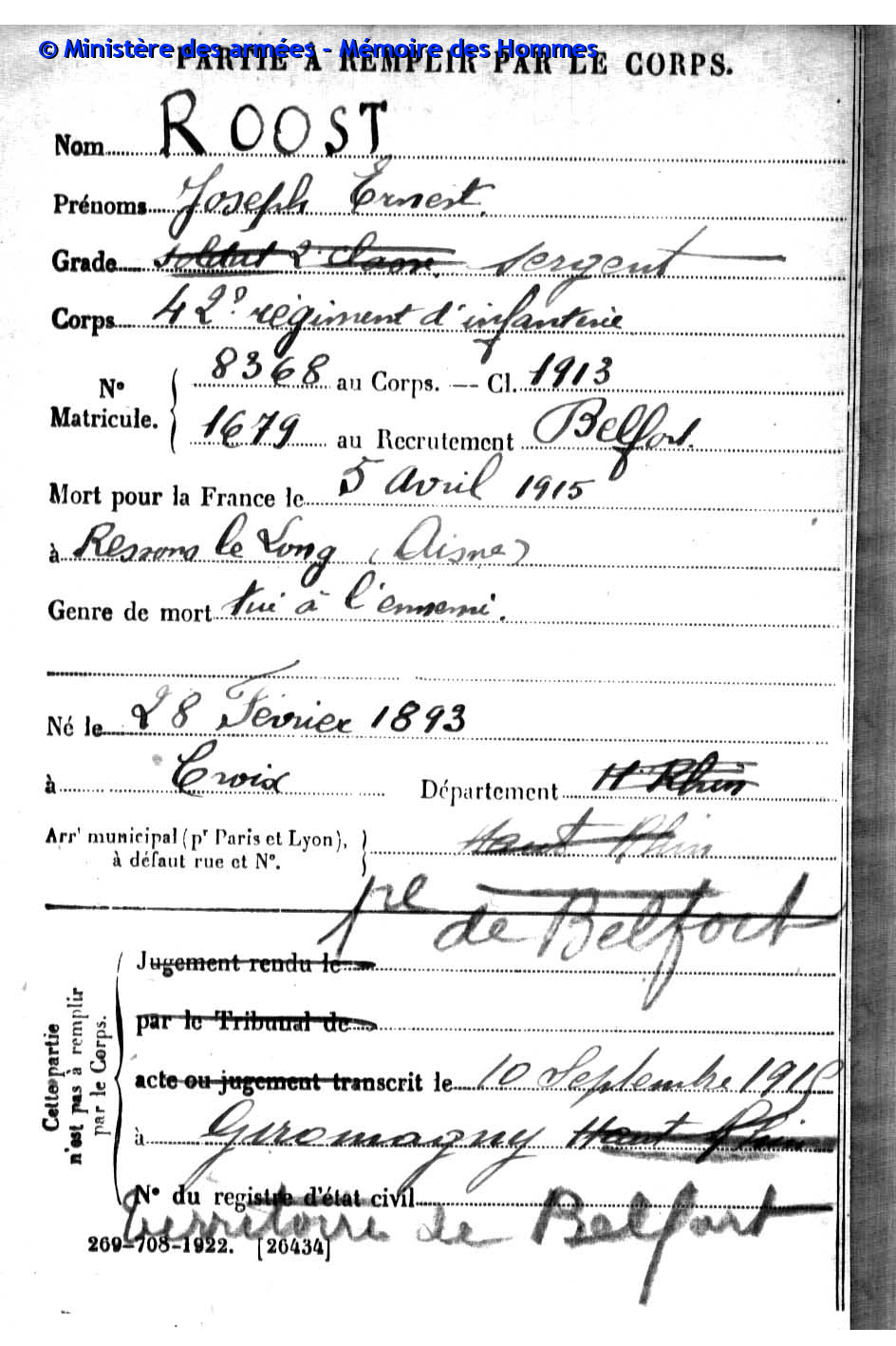 Soldat KAUFFLING Xavier Joseph 15.10.1883 - 18.09.1914 42ème Régiment d'Infanterie Gilt als vermisst in Autreches - Oise (F) |