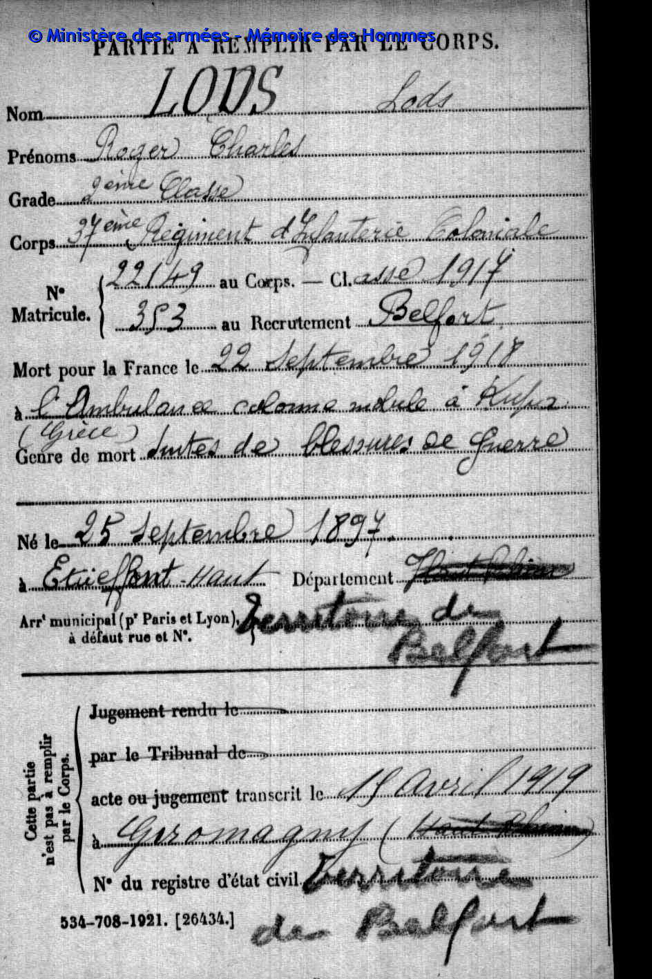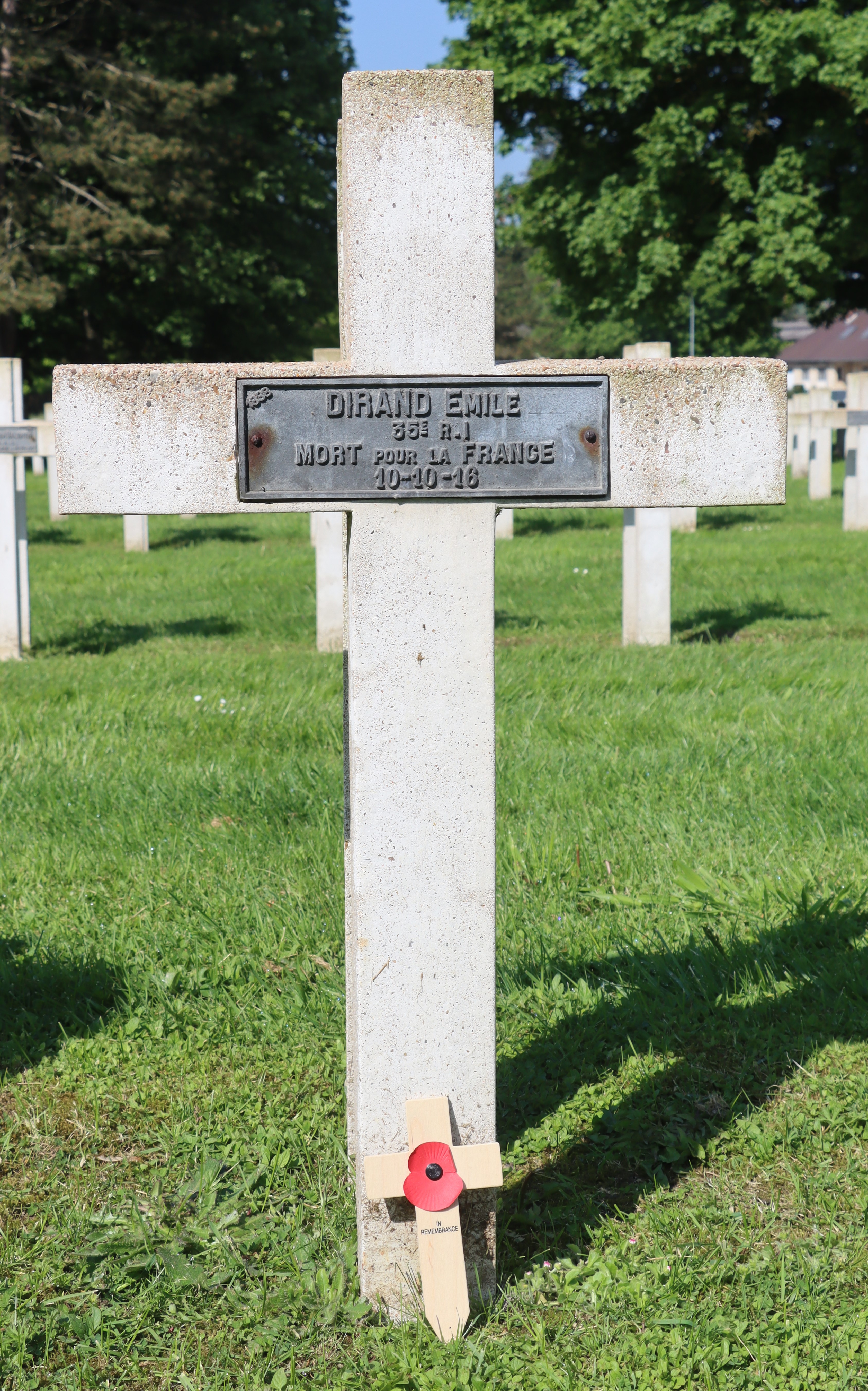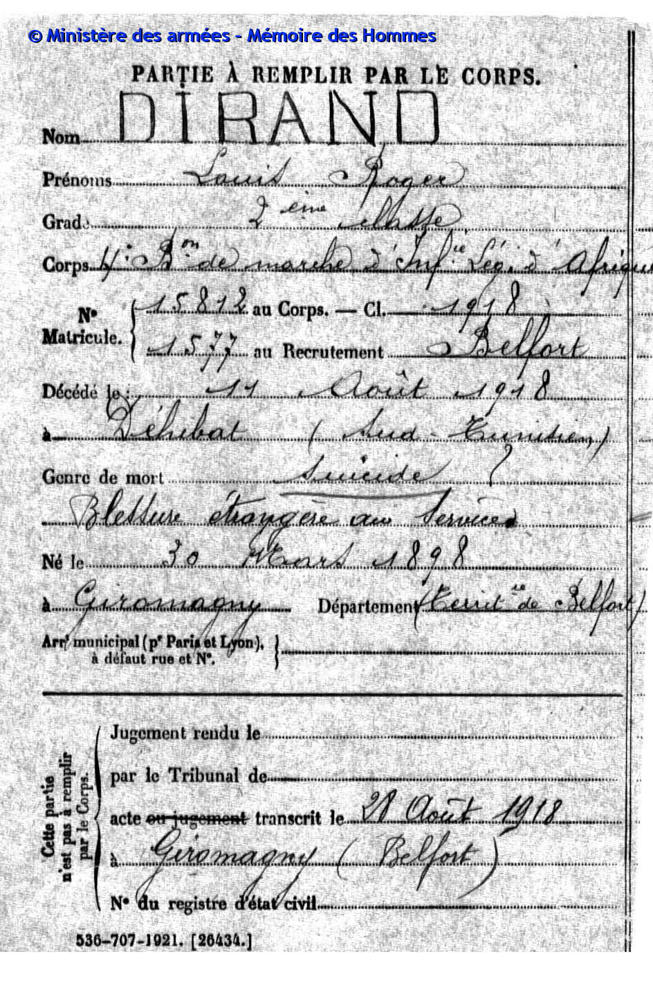 2ème classe DIRAND Louis Roger 30.03.1898 - 14.08.1918 4ème Bataillon d'Infanterie Légère d'Afrique Gefallen in Déhibat (TUN) |