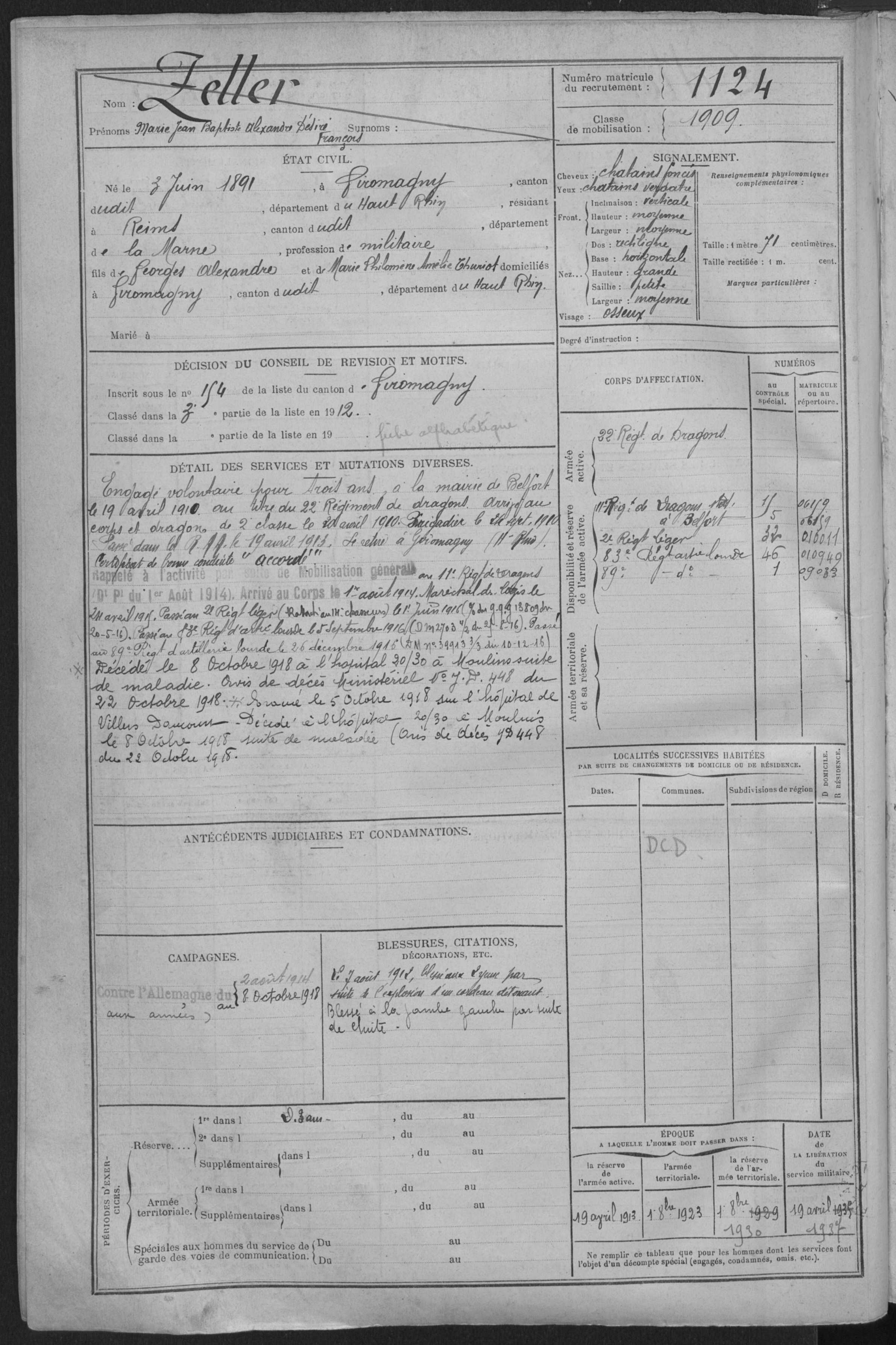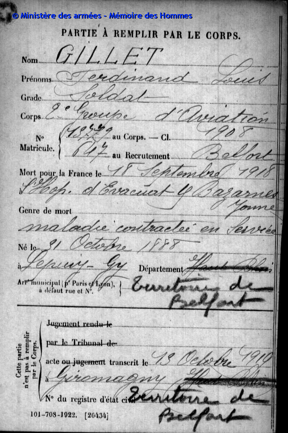Soldat GILLET Ferdinand Louis 31.10.1888 - 18.09.1918 2ème Groupe d'Aviation Verstarb durch Krankheit im Hôpital d'évacuation No. 15 in Bazarnbes - Yonne (F) |