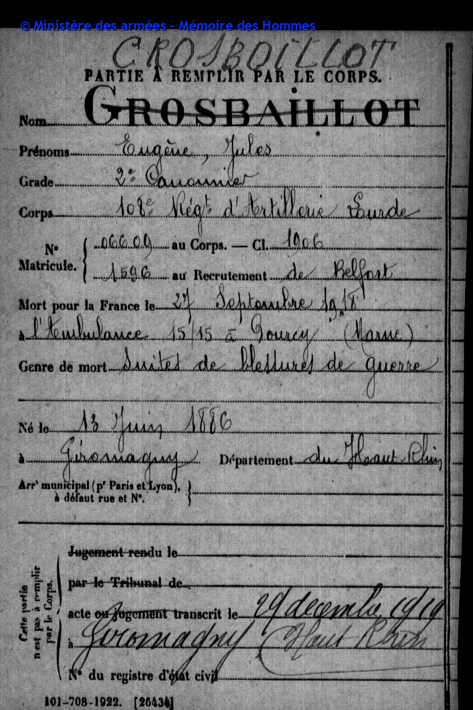 Sergent GROSBOILLOT Louis 04.03.1882 - 27.02.1915 7ème Bataillon de Chasseurs Alpins 6ème Compagnie Gefallen am Hartmannsweilerkopf im Elsass (F) |