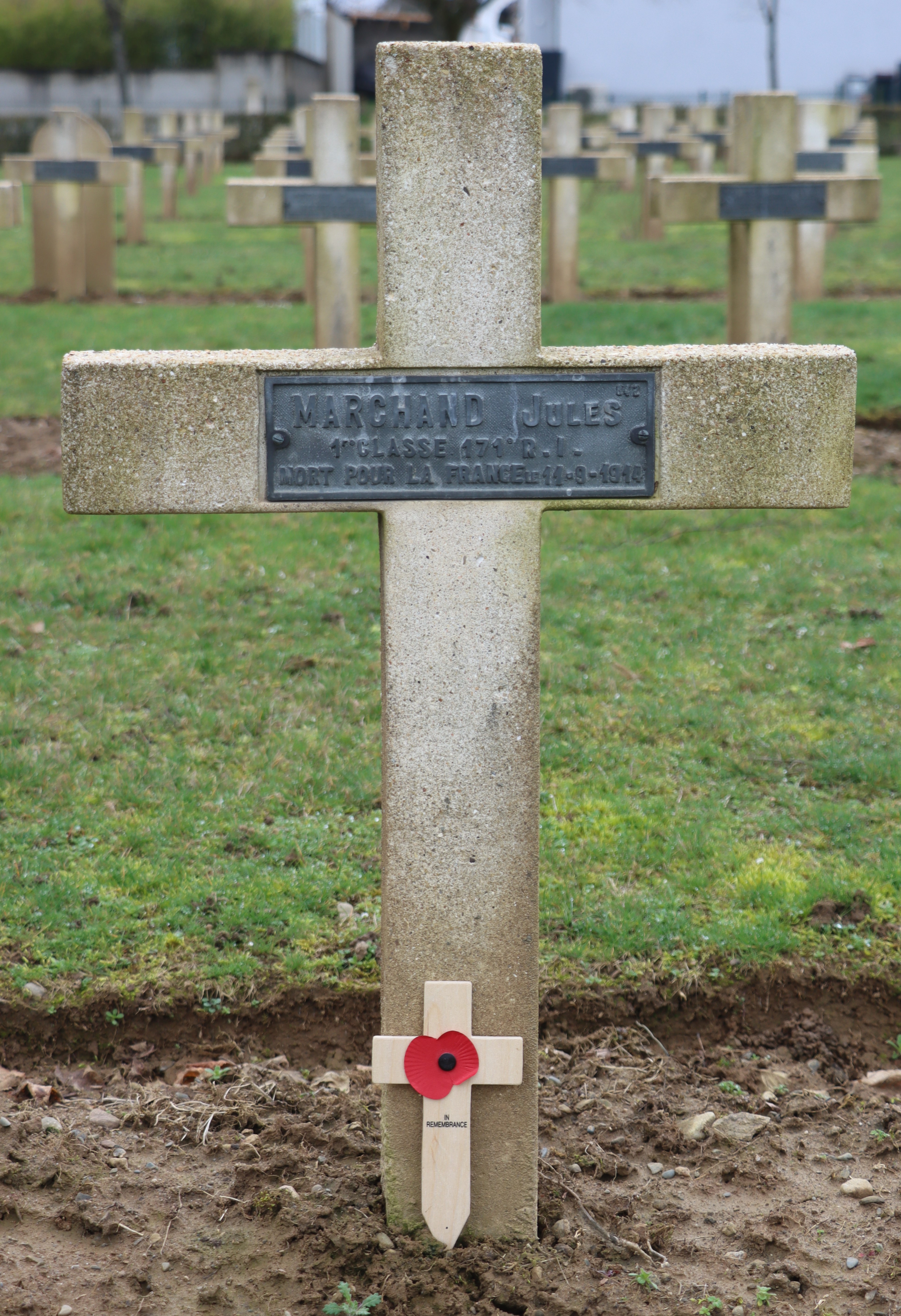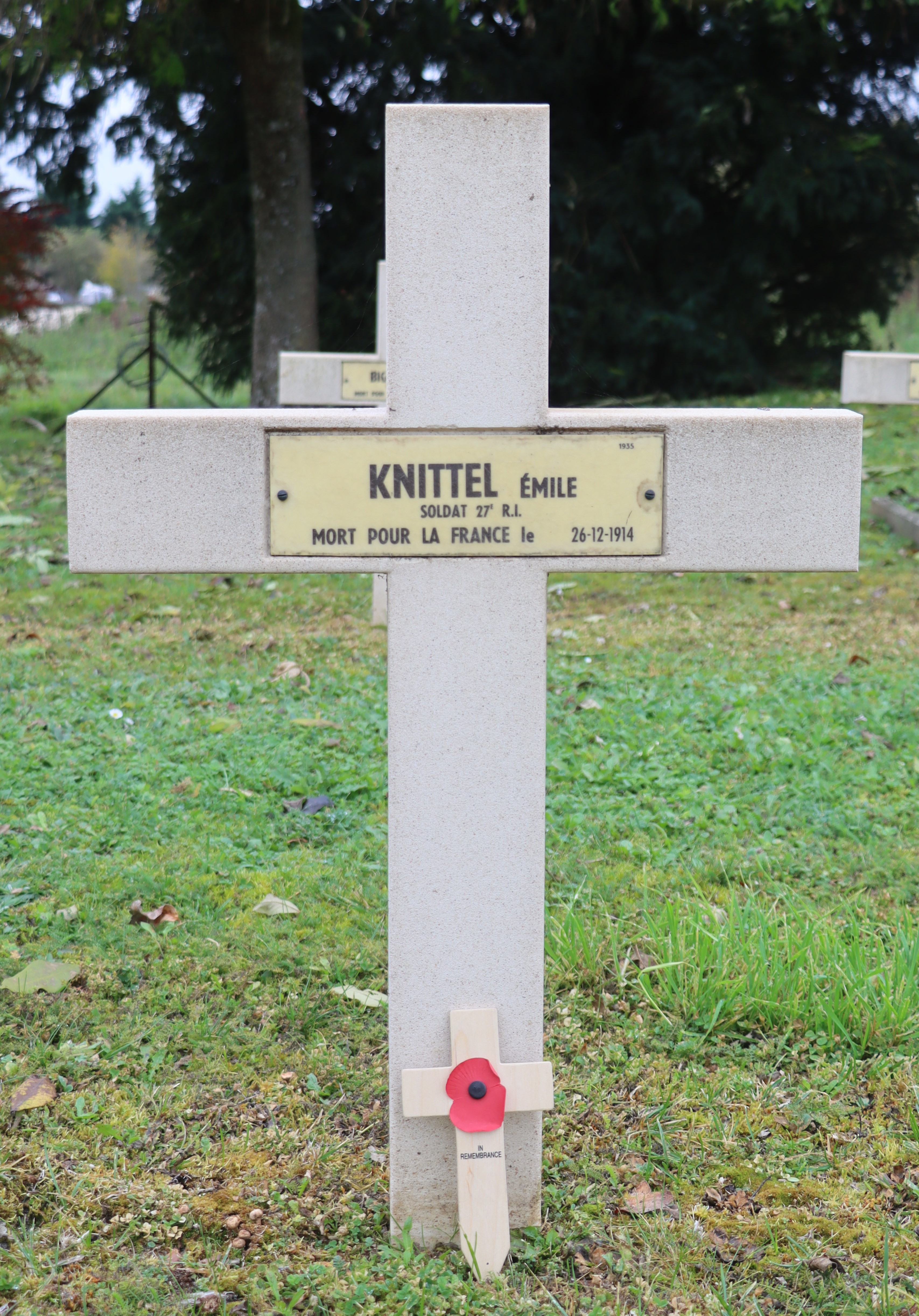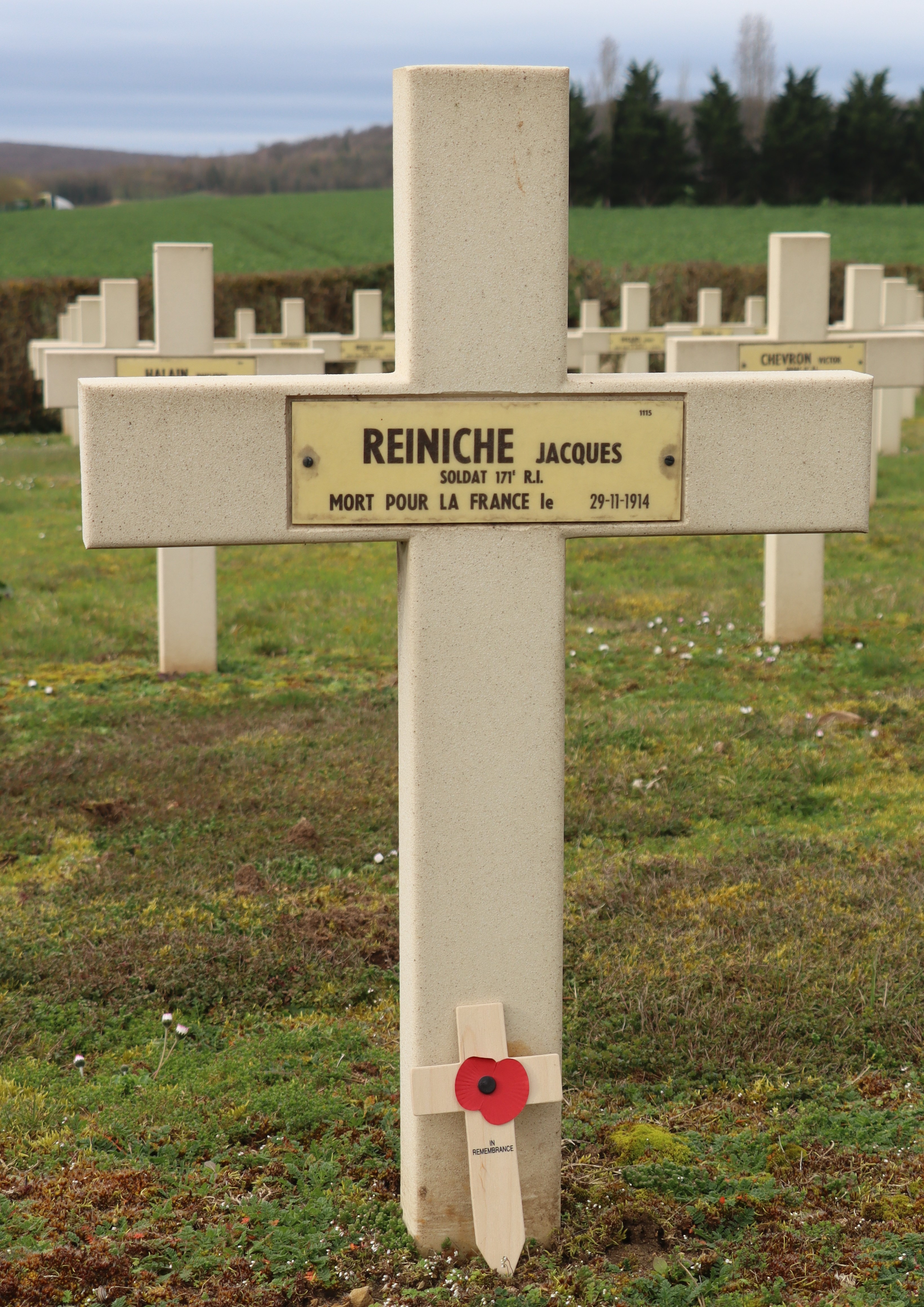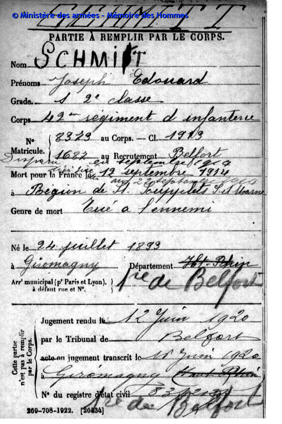2ème classe SCHMITT Joseph Edouard 24.07.1893 - 12.09.1914 42ème Régiment d'Infanterie Gefallen in Saint-Soupplets Nécropole nationale in Verberie (F) Grab 861 |