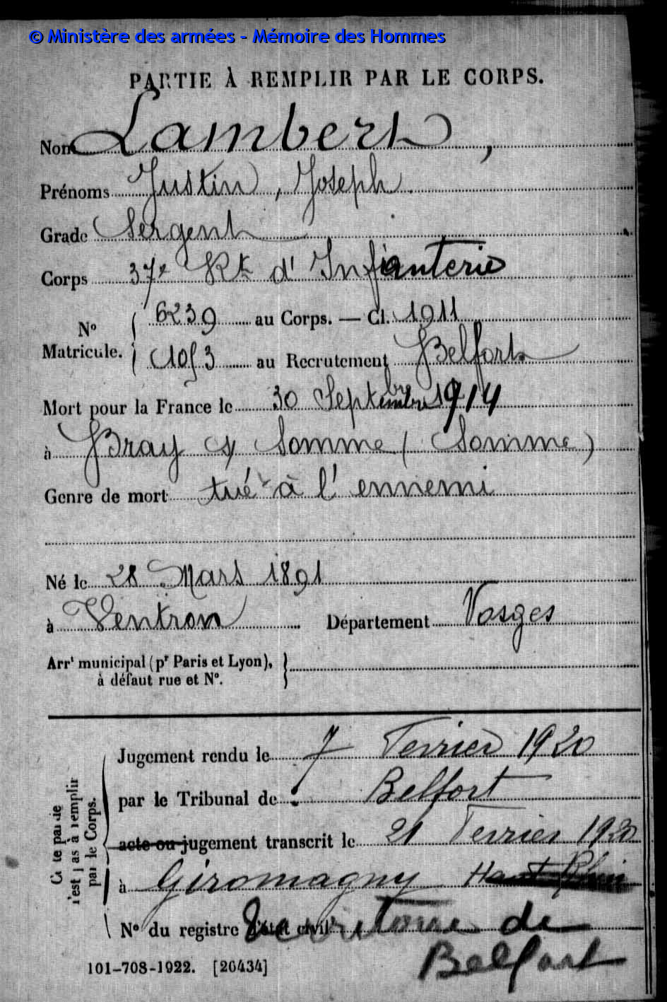 Sergent LAMBERT Justin Joseph 28.03.1891 - 30.09.1914 37ème Régiment d'Infanterie Gefallen in Bray - Somme (F) Nécropole nationale in Bray-sur-Somme (F) Grab 687 |
