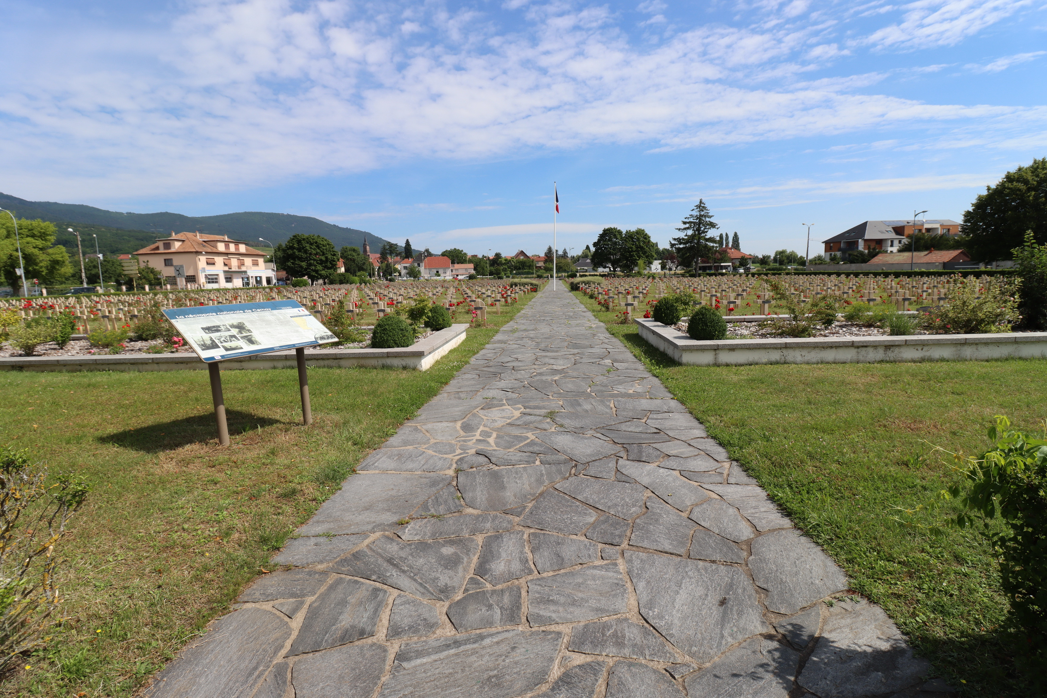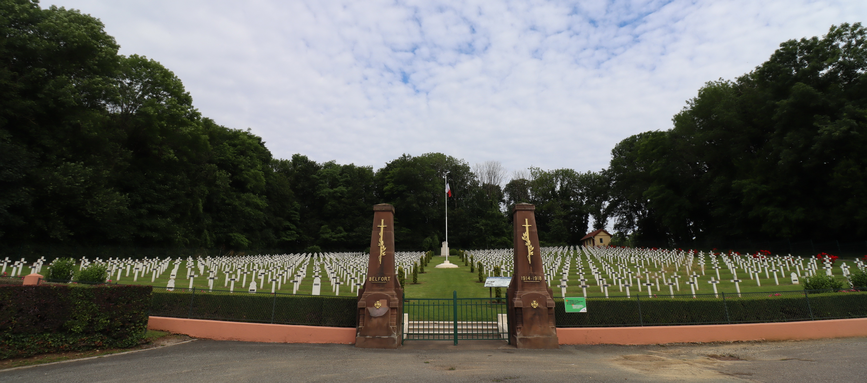 Auf dem "Le Square du Souvenir" bei der Kirche der 5,65 Km2 grossen Gemeinde mit 2914 Einwohner im Departement Territoire de Belfort (F) stehen gleich 3 Kriegerdenkmäler.