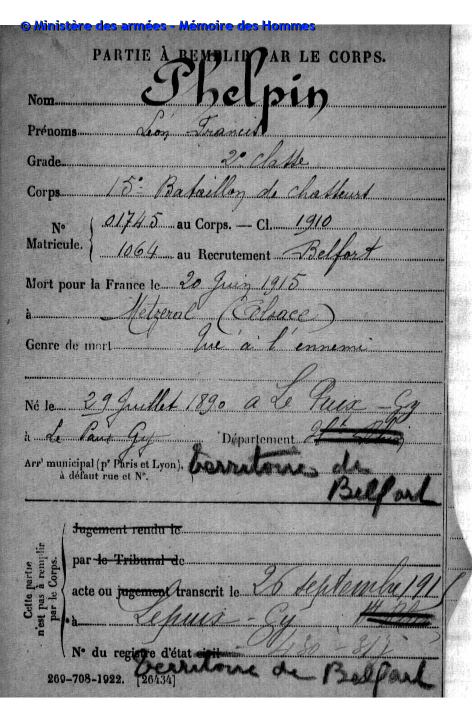 2ème classe PHELPIN Léon Francis 29.07.1890 - 20.06.1915 15ème Bataillon de Chasseuers à Pied Gefallen in Metzeral im Elsass (F) |