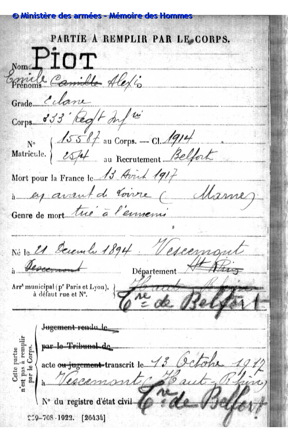 2ème classe PIOT Emile Alexis 21.12.1894 - 13.04.1917 333ème Régiment d'Infanterie Gefallen in Loivre - Marne (F) |