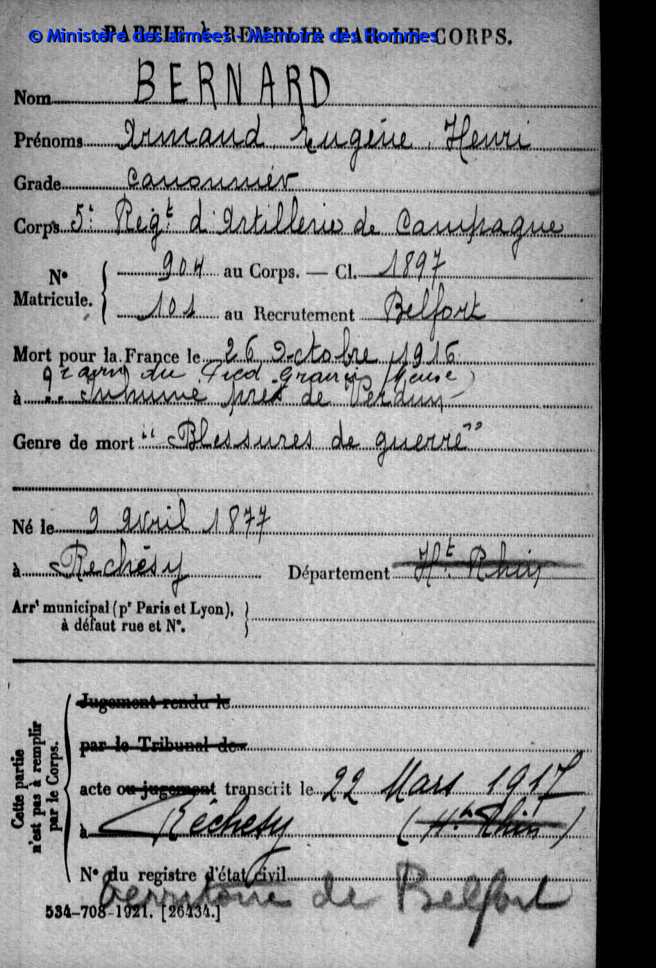 2ème classe CHEVROLET Albert Joseph 172ème Régiment d'Infanterie Gefallen in Damloup - Meuse (F) |
