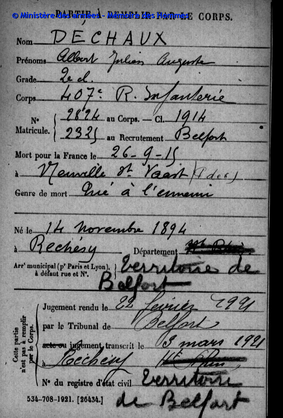 2ème classe DECHAUX Albert Julien Auguste 14.11.1894 - 26.09.1915 407ème Régiment d'Infanterie Gefallen auf Höhe 123 in Neuville-Saint-Vaast (F) |