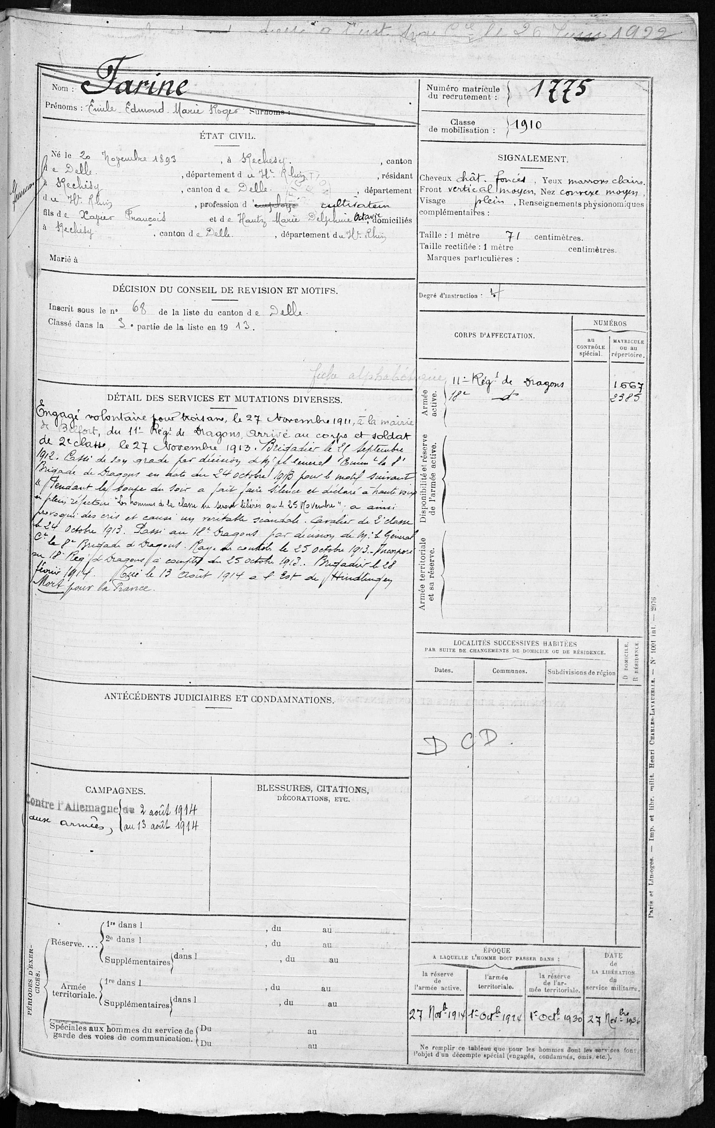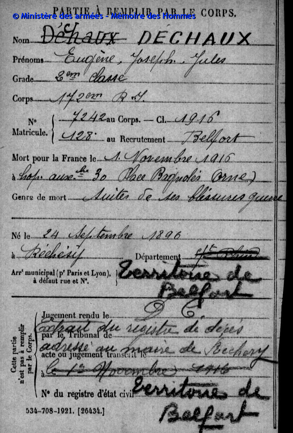 2ème classe DECHAUX Gustave Emile 21.07.1888 - 28.09.1915 172ème Régiment d'Infanterie 10ème Compagnie Gefallen in Perthes-lès-Hurlus - Marne (F) |