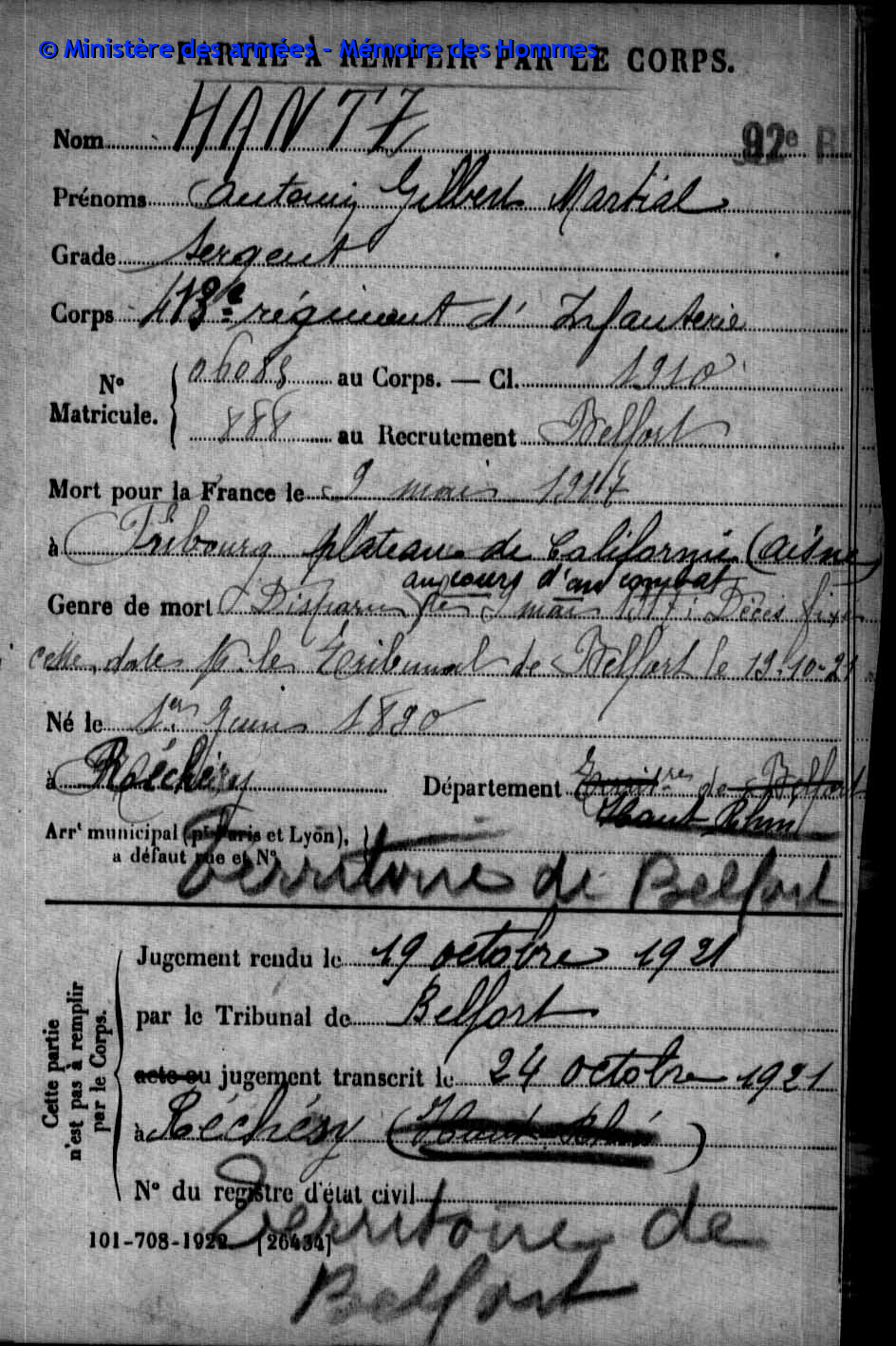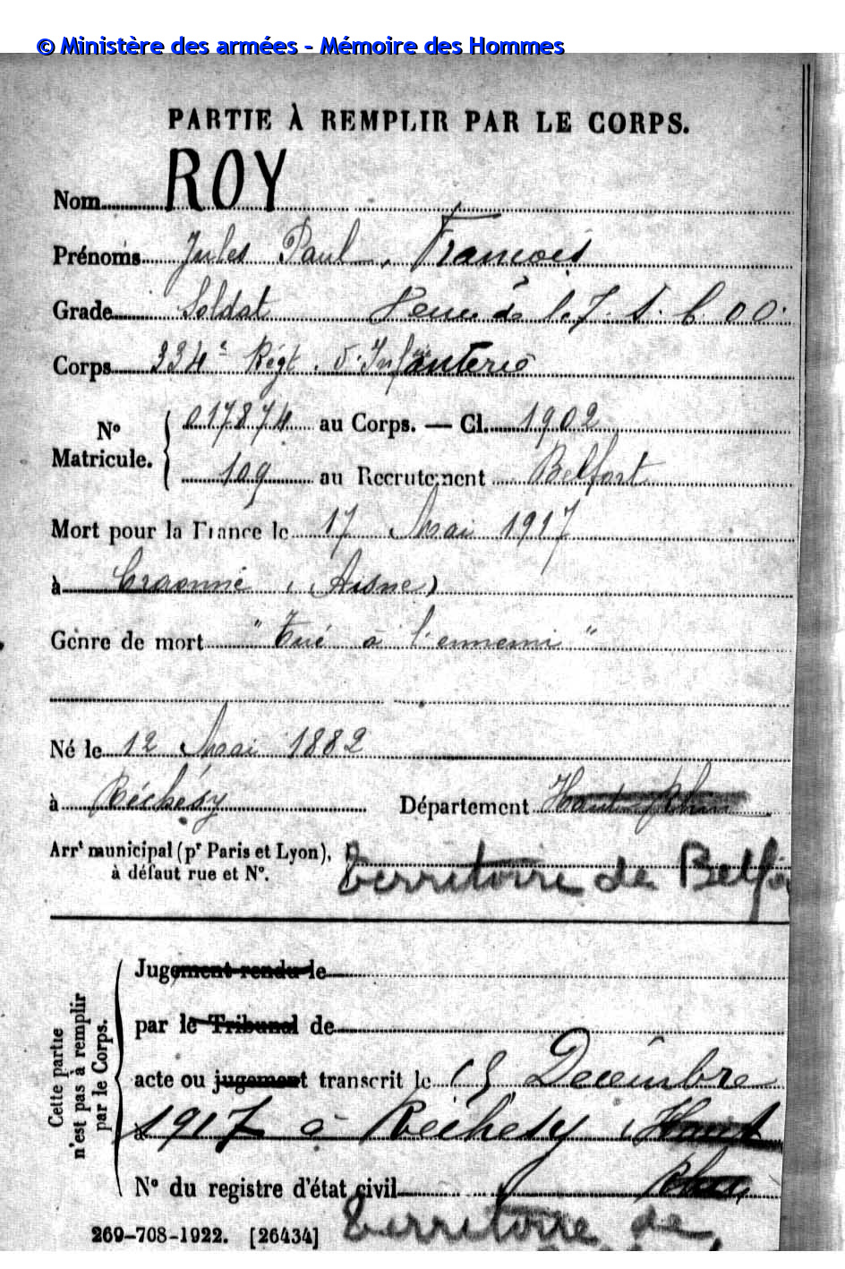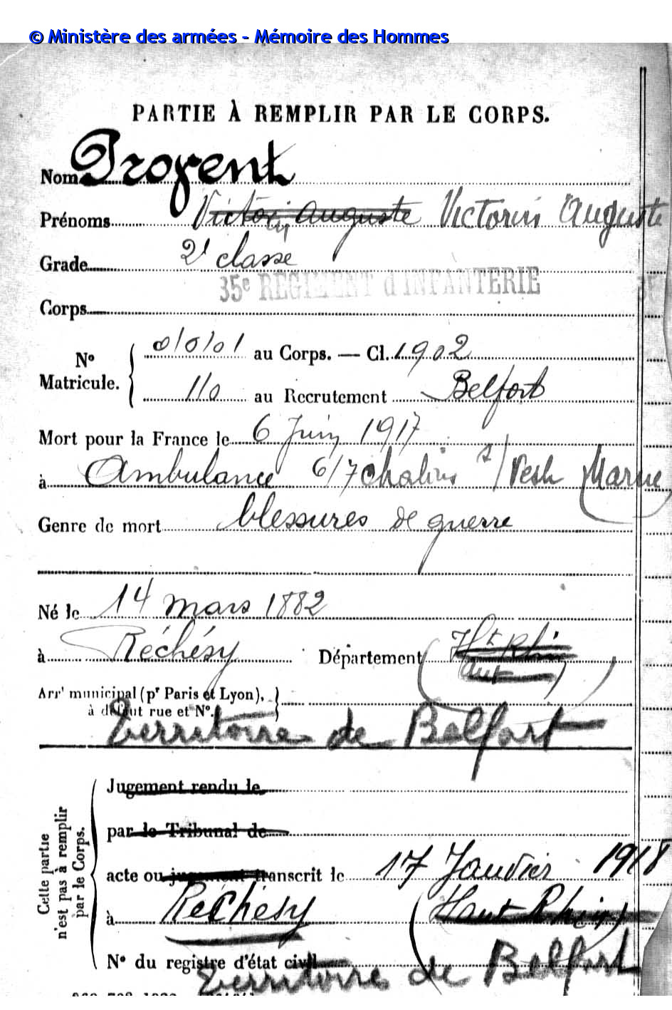 Auf dem Kriegederdenkmal der 12,61 km2 grossen Gemeinde mit 767 Einwohner im Departement Territoire de Belfort (F) sind 43 Kriegsopfer verzeichnet, davon sind 30 mit Fabian Coulot verwandt.