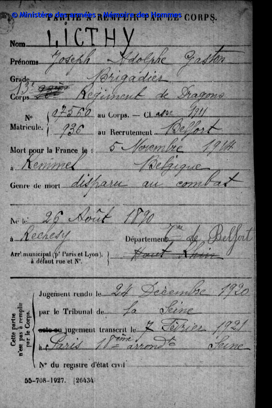 2ème classe DECHAUX Paul Gustave 26.06.1892 - 05.04.1918 172ème Régiment d'Infanterie Gefallen in Grivesnes - Somme (F) |