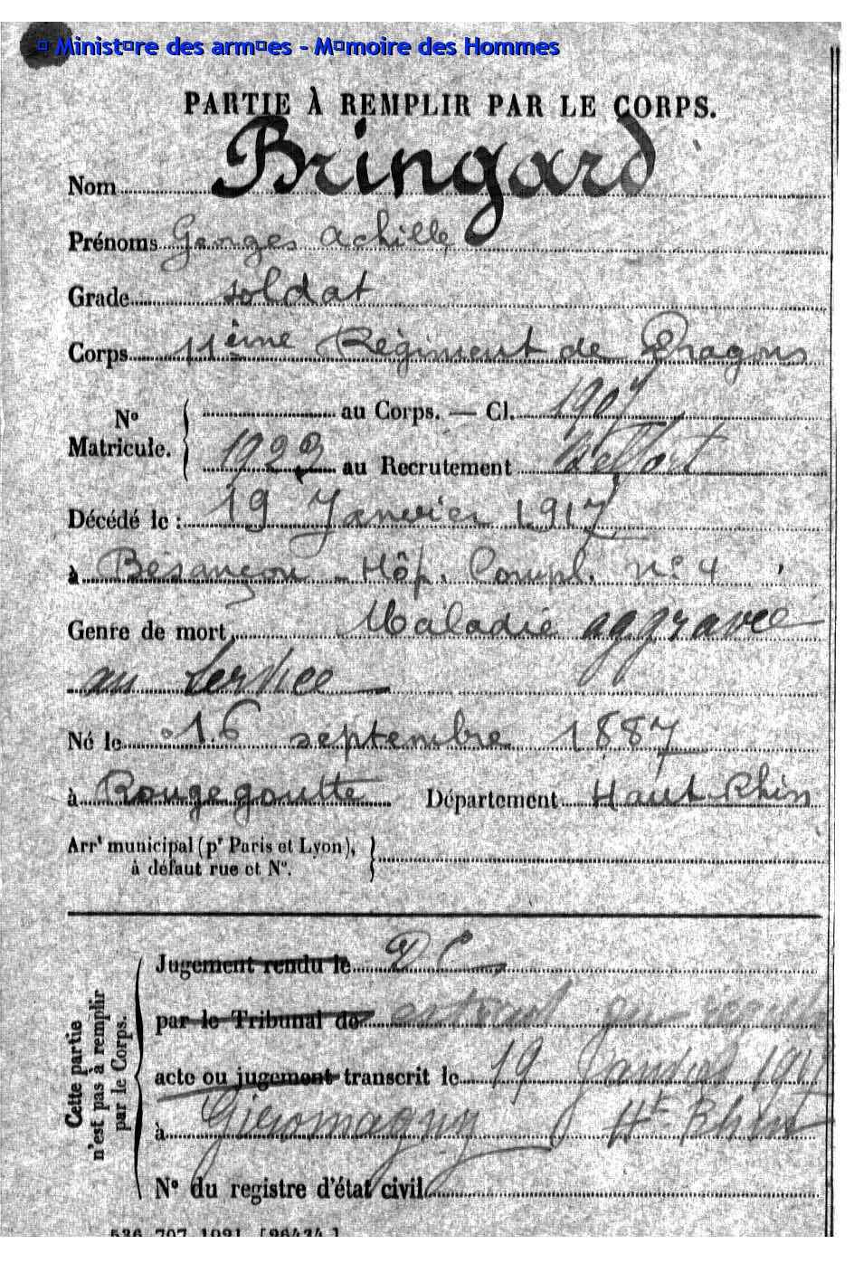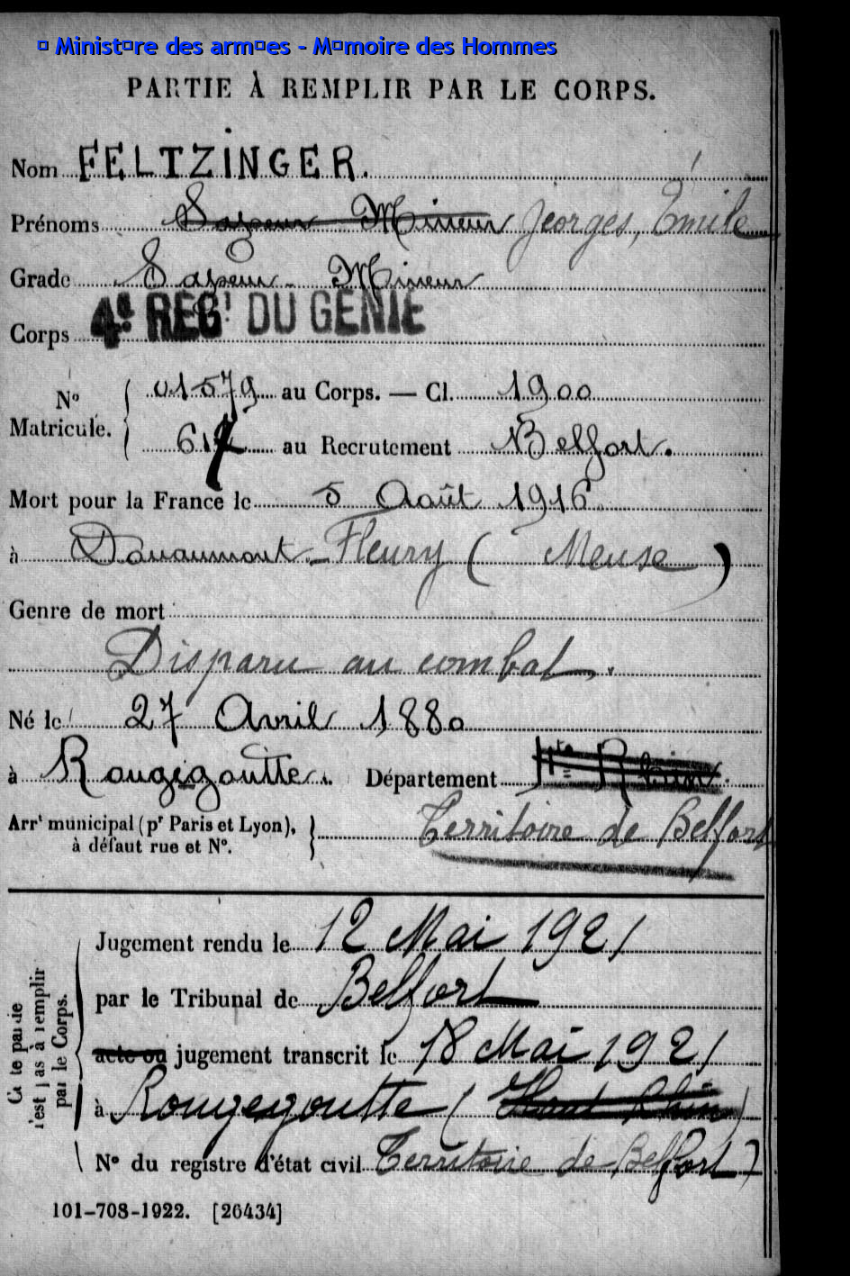 Pionnier BRINGARD Maurice Georges Victor 20.08.1913 - 18.06.1940 428ème Régiment de Pionniers 2ème Bataillon, 5ème Compagnie Gefallen im Fort de la Justice in Belfort (F) |