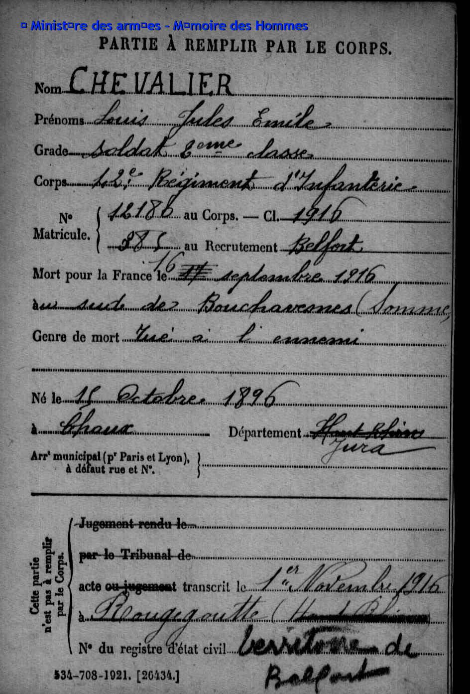 Caporal DEMEUSY Emile Joseph 02.09.1896 - 24.08.1916 42ème Régiment d'Infanterie Gefallen in Cléry-sur-Somme (F) |