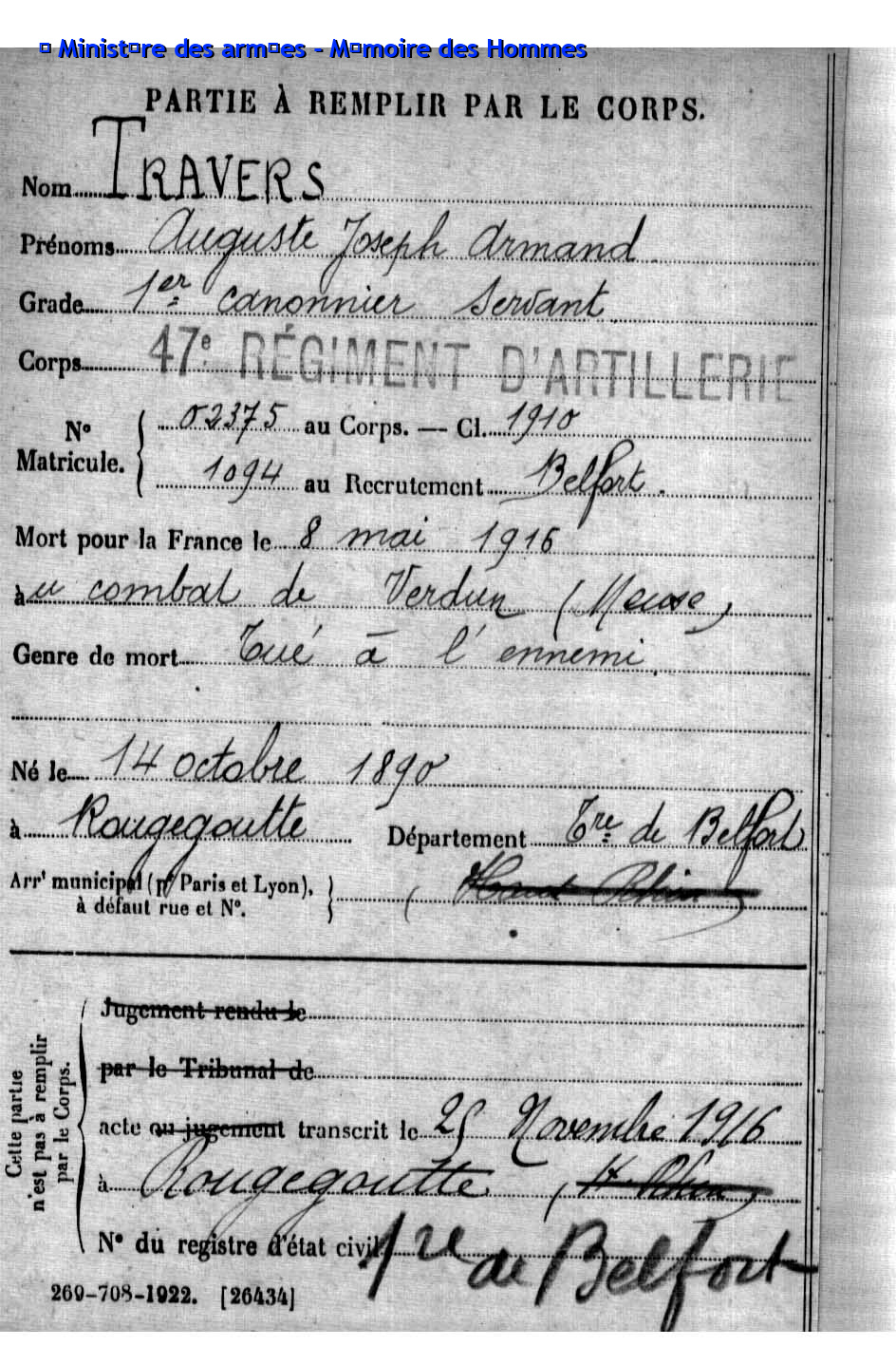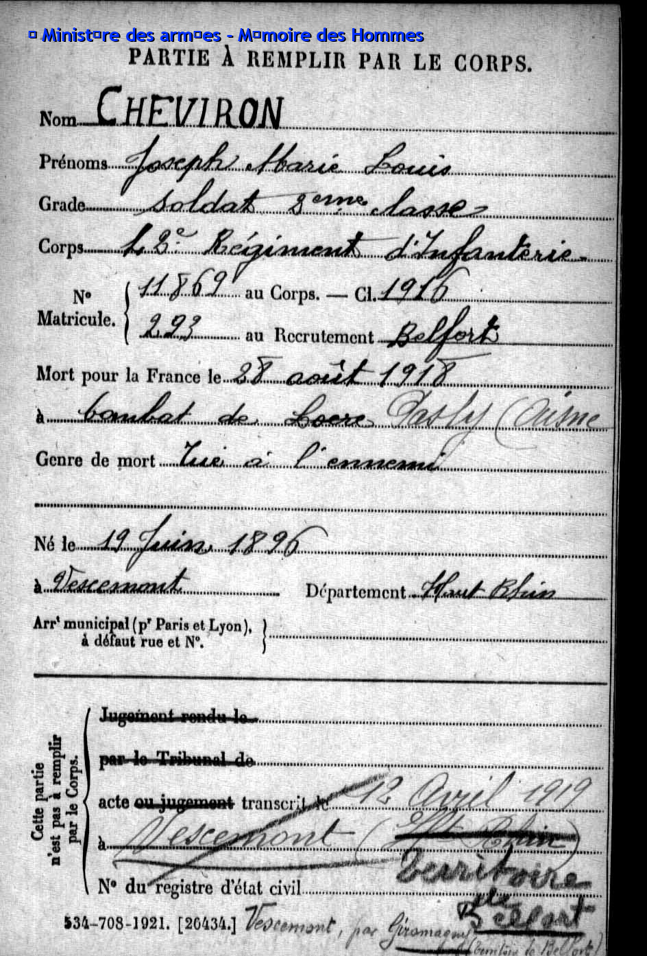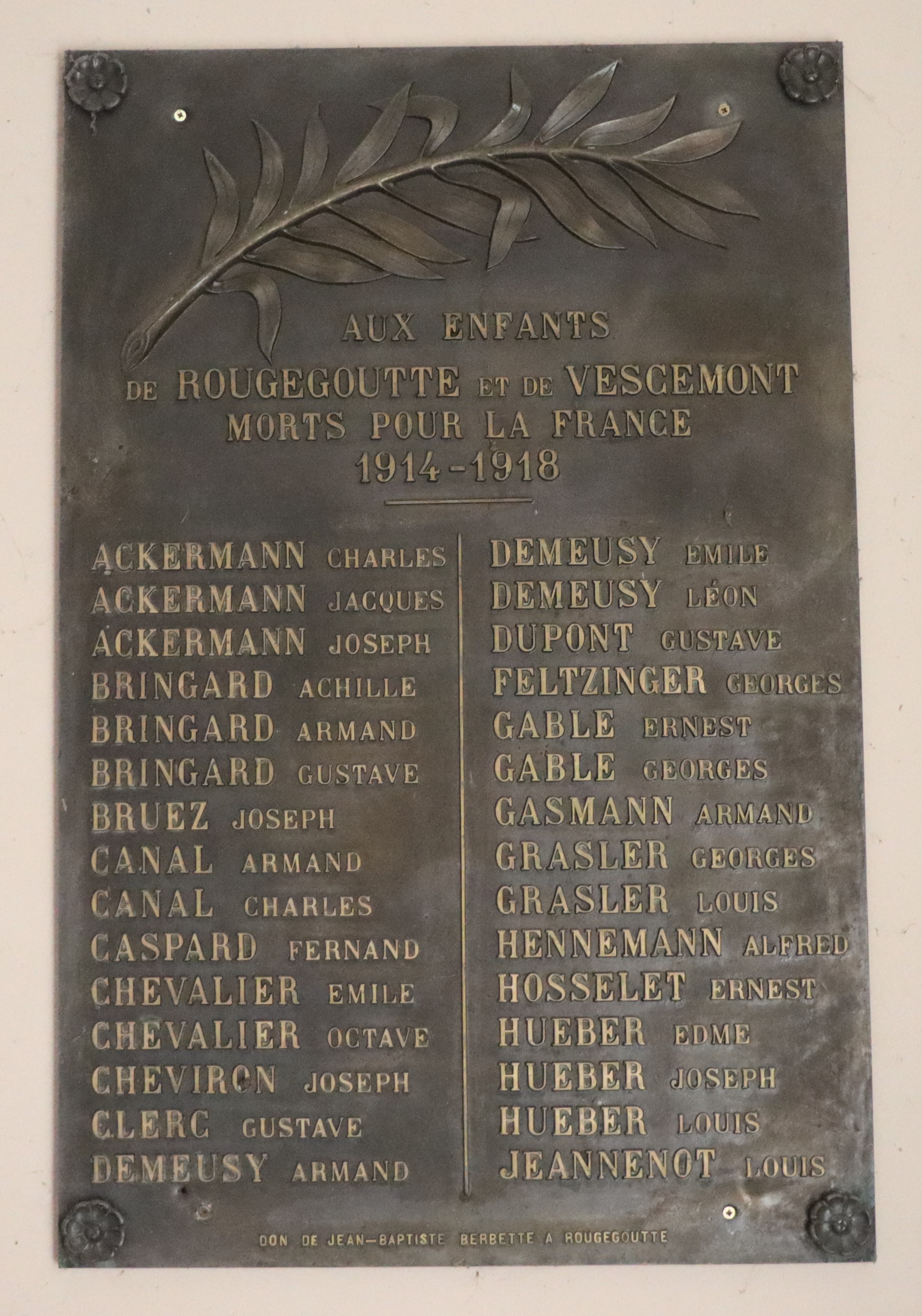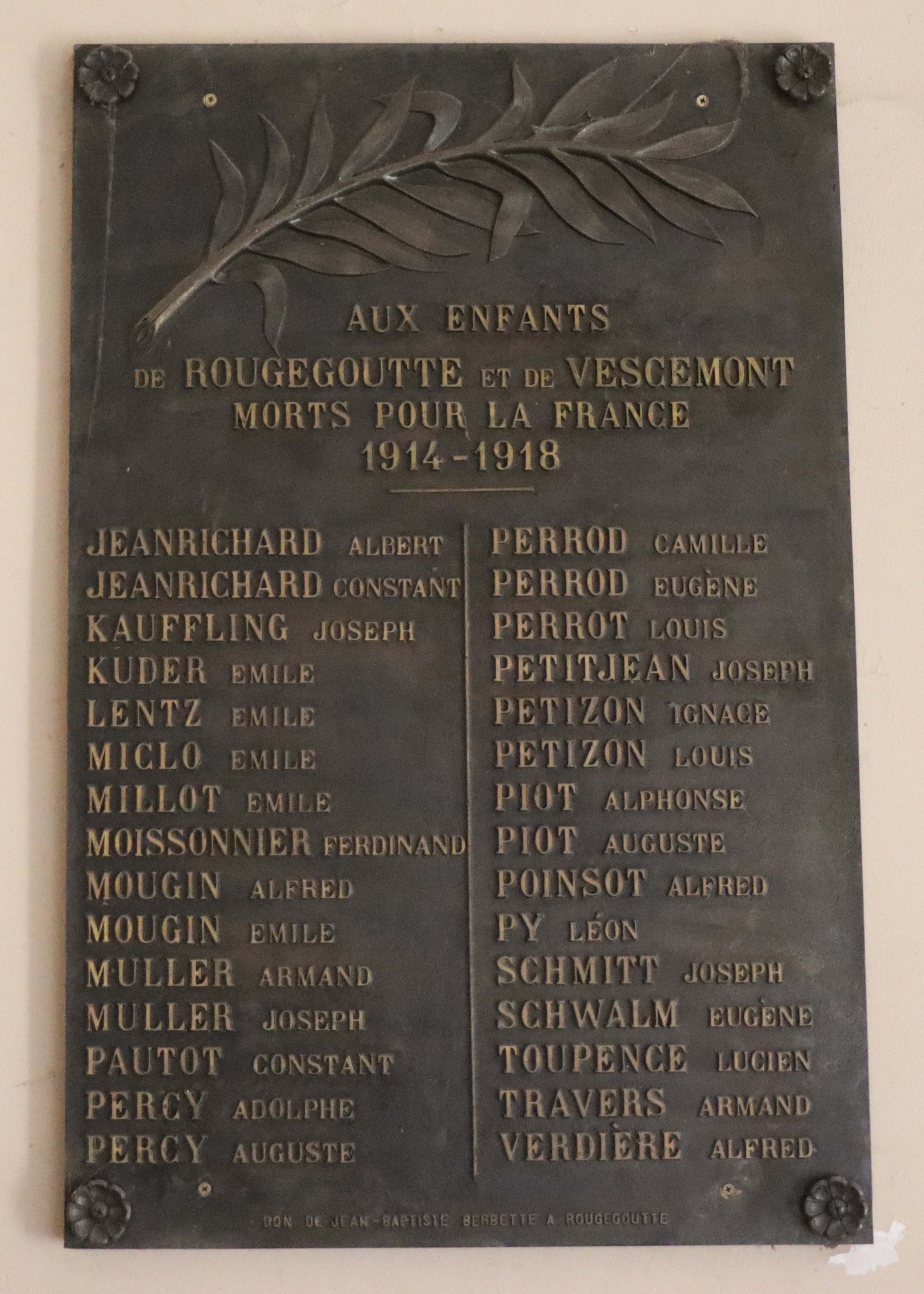 Auf dem Kriegerdenkmal der 8,07 Km2 kleinen Gemeinde mit 981 Einwohner im Departement Territoire de Belfort (F), sind 81 Kriegsopfer verzeichnet, davon sind 57 mit Fabian Coulot verwandt.