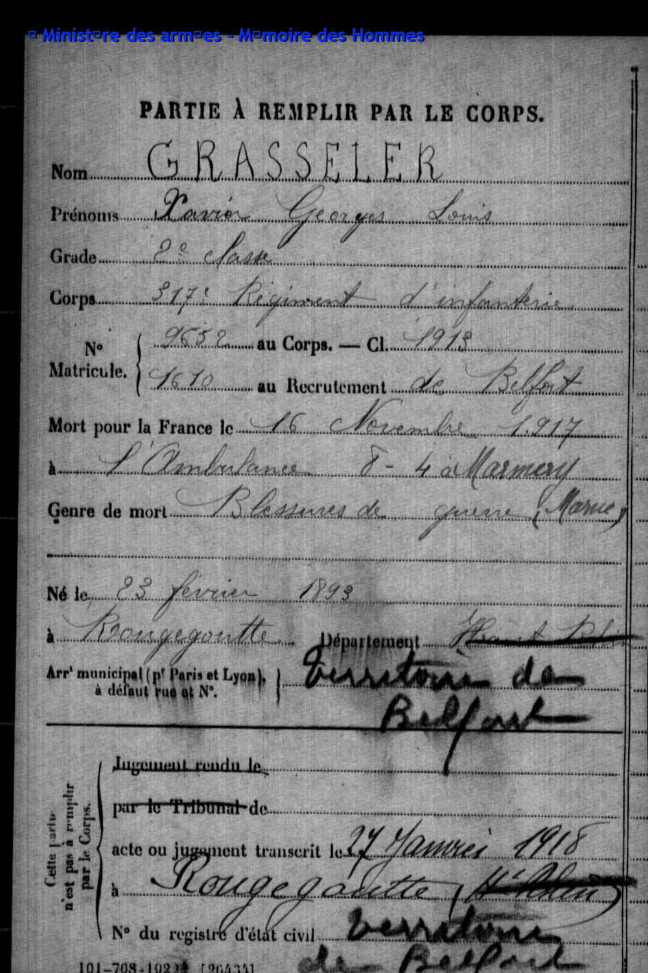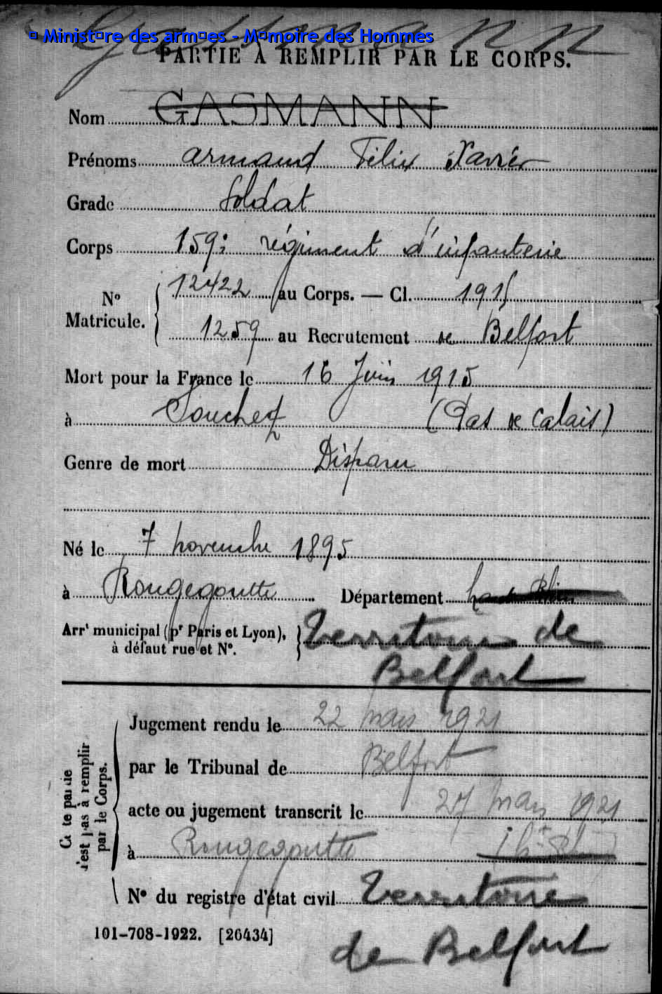 Soldat GASSMANN Armand Félix Xavier 07.11.1895 - 16.05.1915 159ème Régiment d'Infanterie Gilt als vermisst in Souchez - Pas-de-Calais (F) |