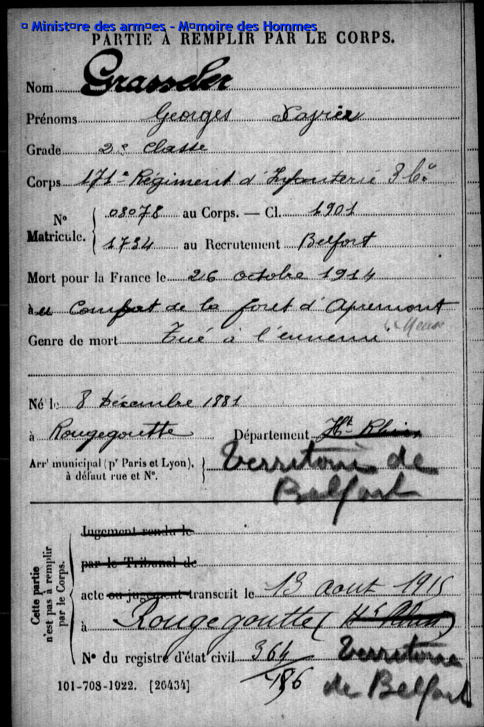 Sergent ACKERMANN Joseph 20.07.1886 - 17.05.1915 171ème Régiment d'Infanterie Gefallen in Ailly - Meuse (F) |