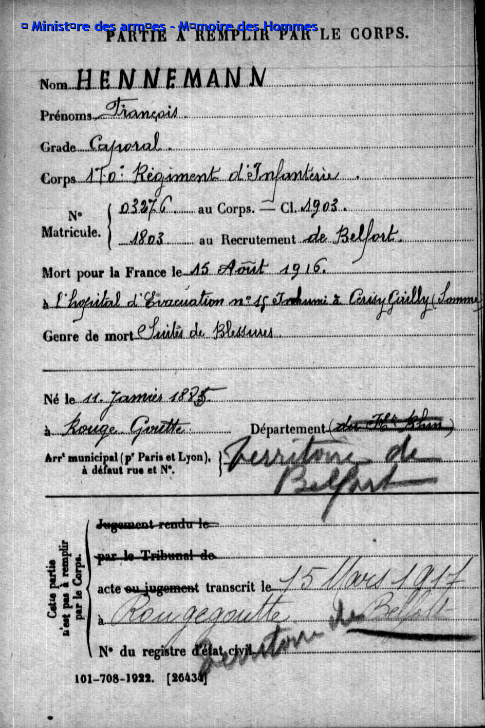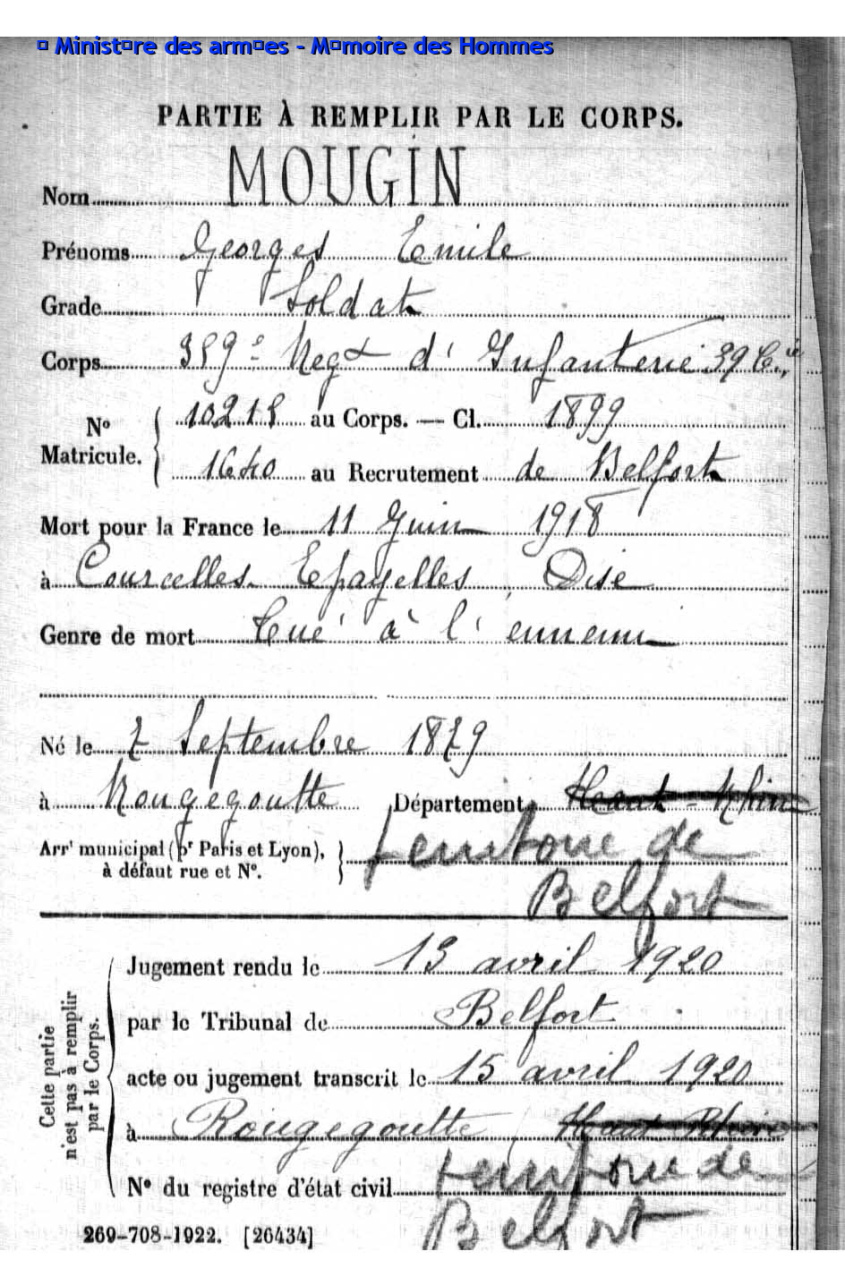 Soldat MOUGIN Georges Emile 07.09.1879 - 11.06.1918 359ème Régiment d'Infanterie Gefallen in Courcelles-Epayelles - Oise (F) |