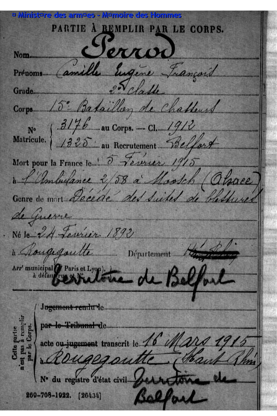 2ème classe ACKERMANN Joseph Jacques 25.07.1895 - 28.09.1915 407ème Régiment d'Infanterie Gefallen auf Höhe 140 in Neuville-Saint-Vaast - Pas-de-Calais (F) |