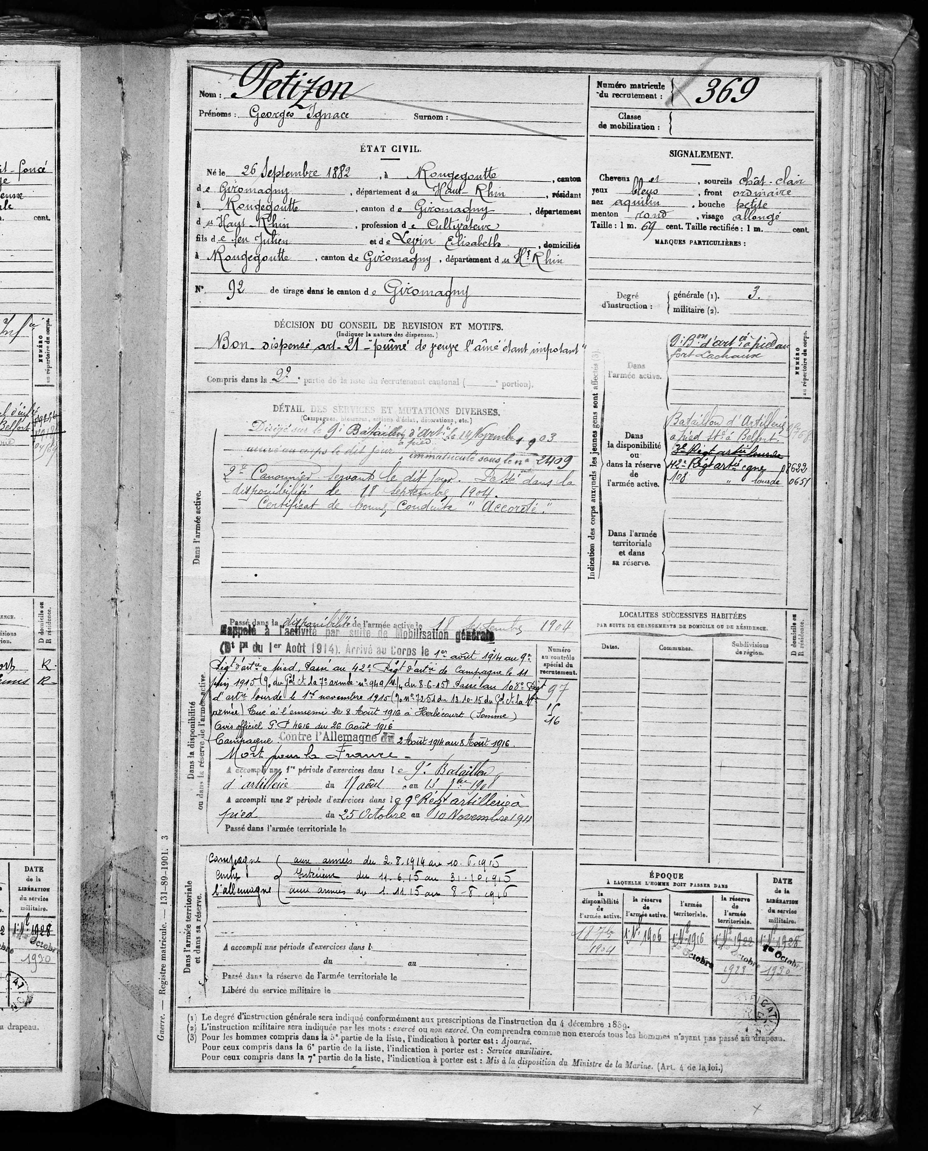2ème classe BRINGARD Armand Constant 02.10.1889 - 05.04.1915 132ème Régiment d'Infanterie Gefallen in Les Eparges - Meuse (F) |