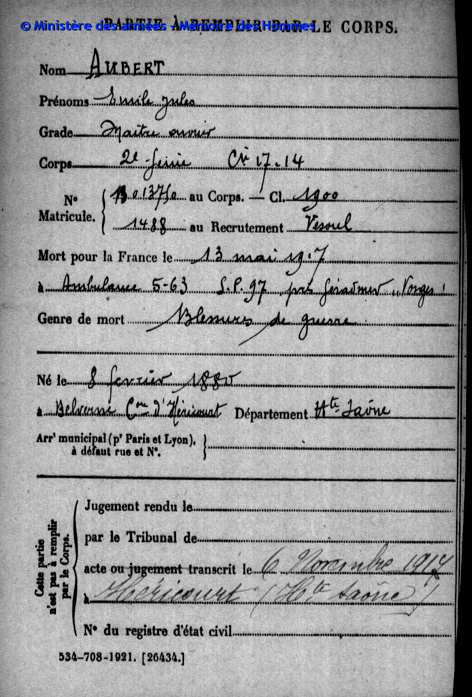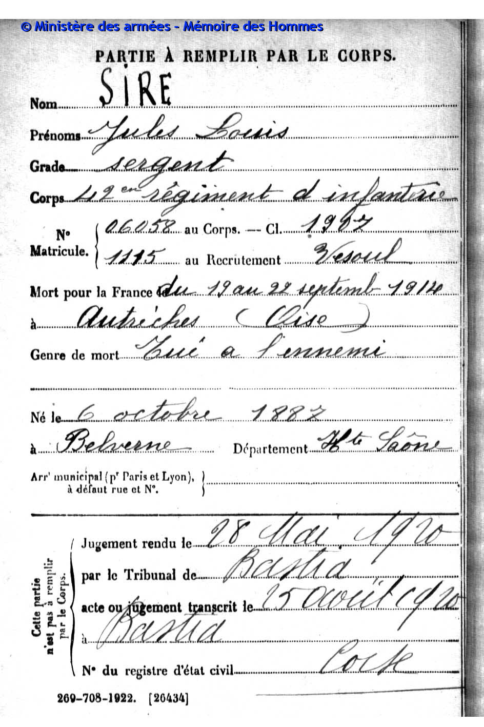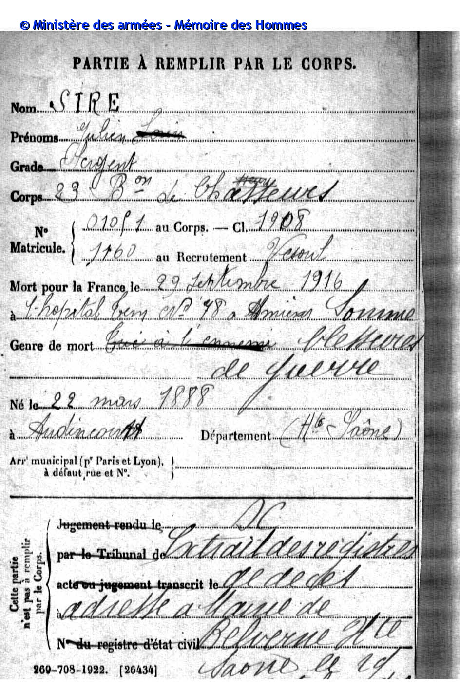 Sergent SIRE Julien Louis 22.03.1888 - 29.09.1916 23ème Bataillon de Chasseurs Alpins Verstarb an seinen Wunden in Amiens - Somme (F) |