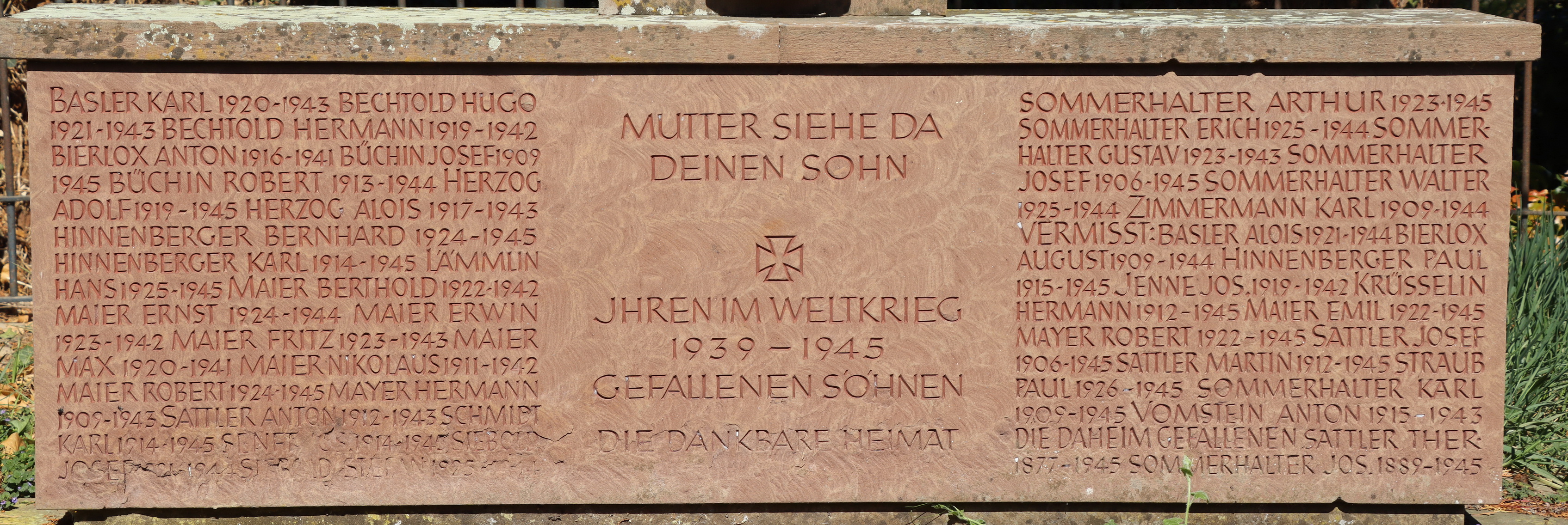 Herr SOMMERHALTER Joseph 22.05.1889 - 16.02.1945 Ziviles Kriegsopfer Durch feindliche Granatsplitter bei der Beschiessung des Dorfes tödlich getroffen. |