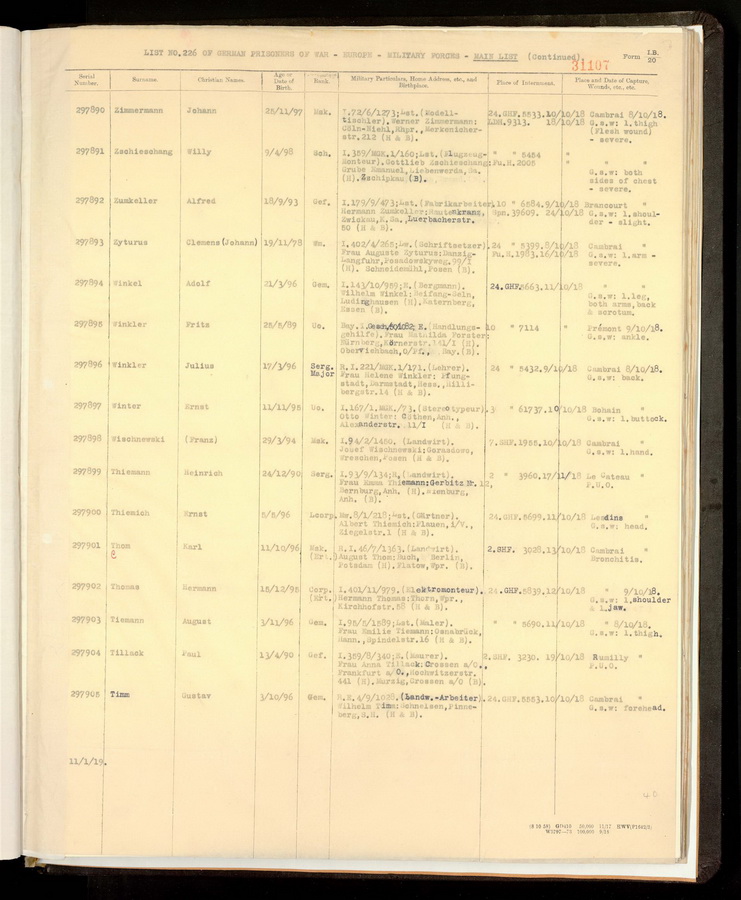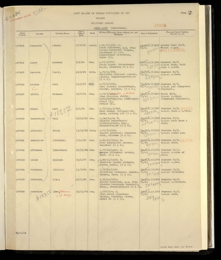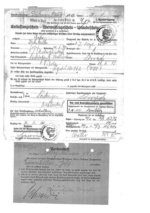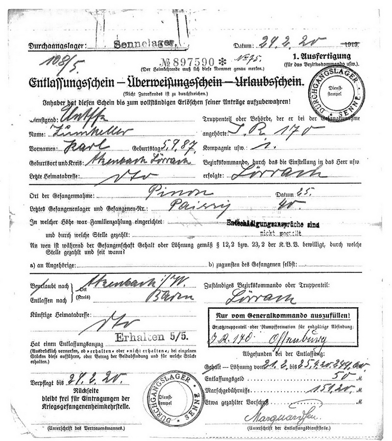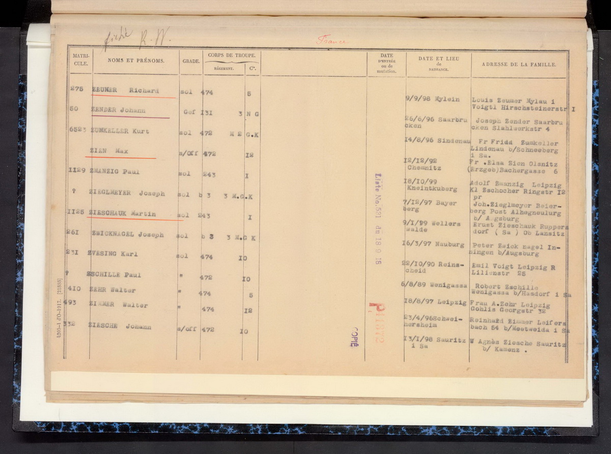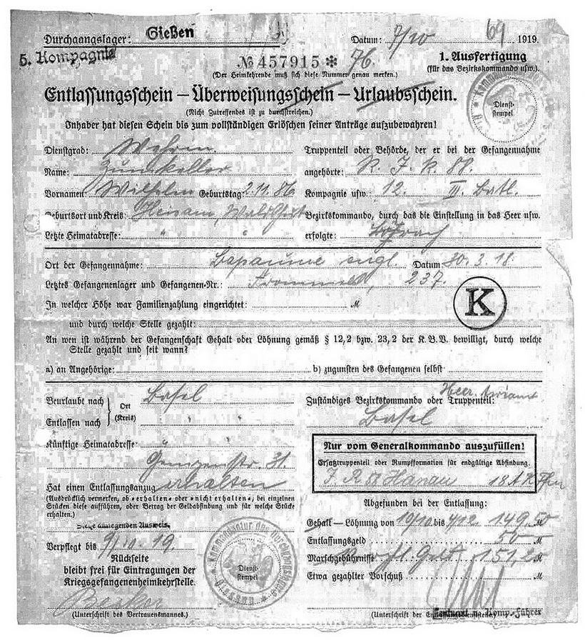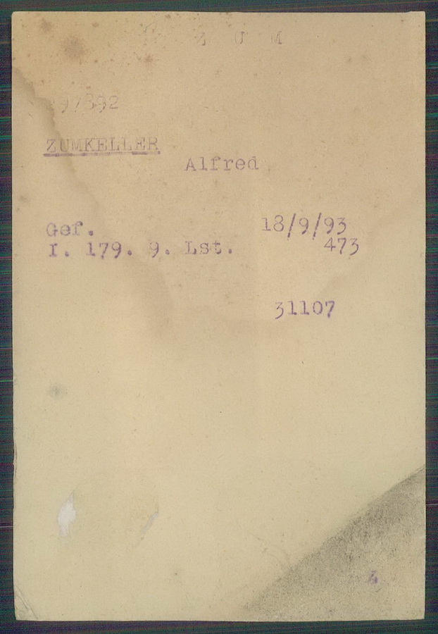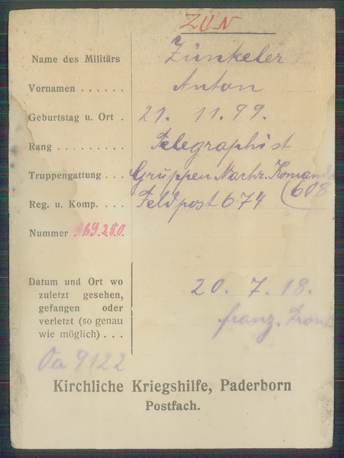 Gefreiter Alfred ZUMKELLER geboren: 18.09.1893 ev. Zwickau Infanterie Regiment 179, 9.Kompagnie Lst Gefangennahme in Brancourt, leichte Verletzung linke Schulter ![]() ![]() |